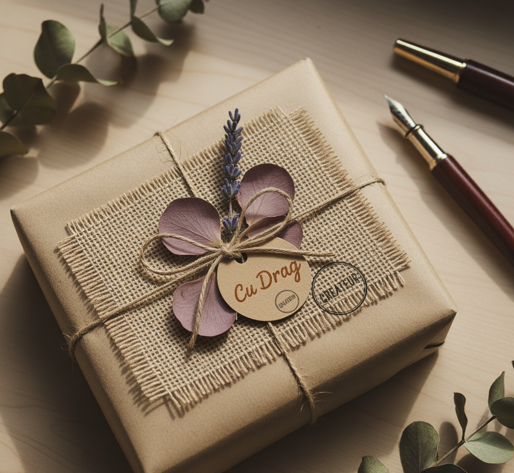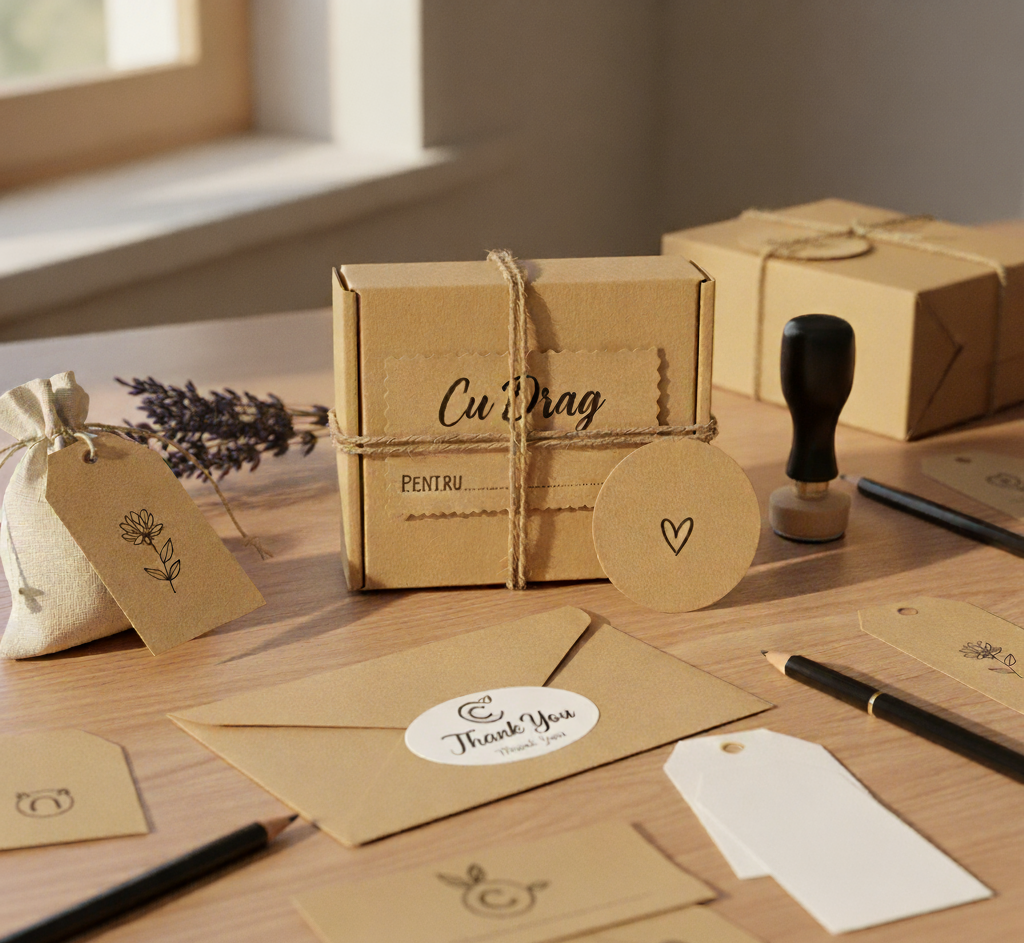 Oricât de simplu ar fi ambalajul, personalizarea este cheia. O etichetă kraft atașată cu sfoară sau un sticker Createur cu mesaj de mulțumire (cum ar fi Thank You sau Cu Drag) dă un plus de căldură. Aceste mici detalii transformă un pachet generic într-un mesaj personal. Nu uita de etichetele pe care poți scrie un gând frumos sau numele destinatarului!