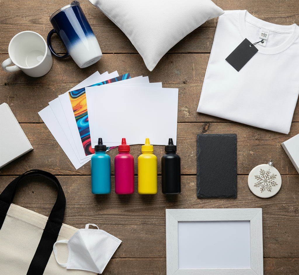 1. Consumabilele Cheie: Cerneli, Hârtie și Obiecte Sublimabile