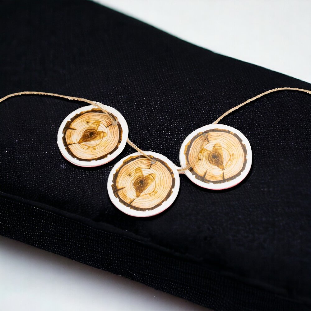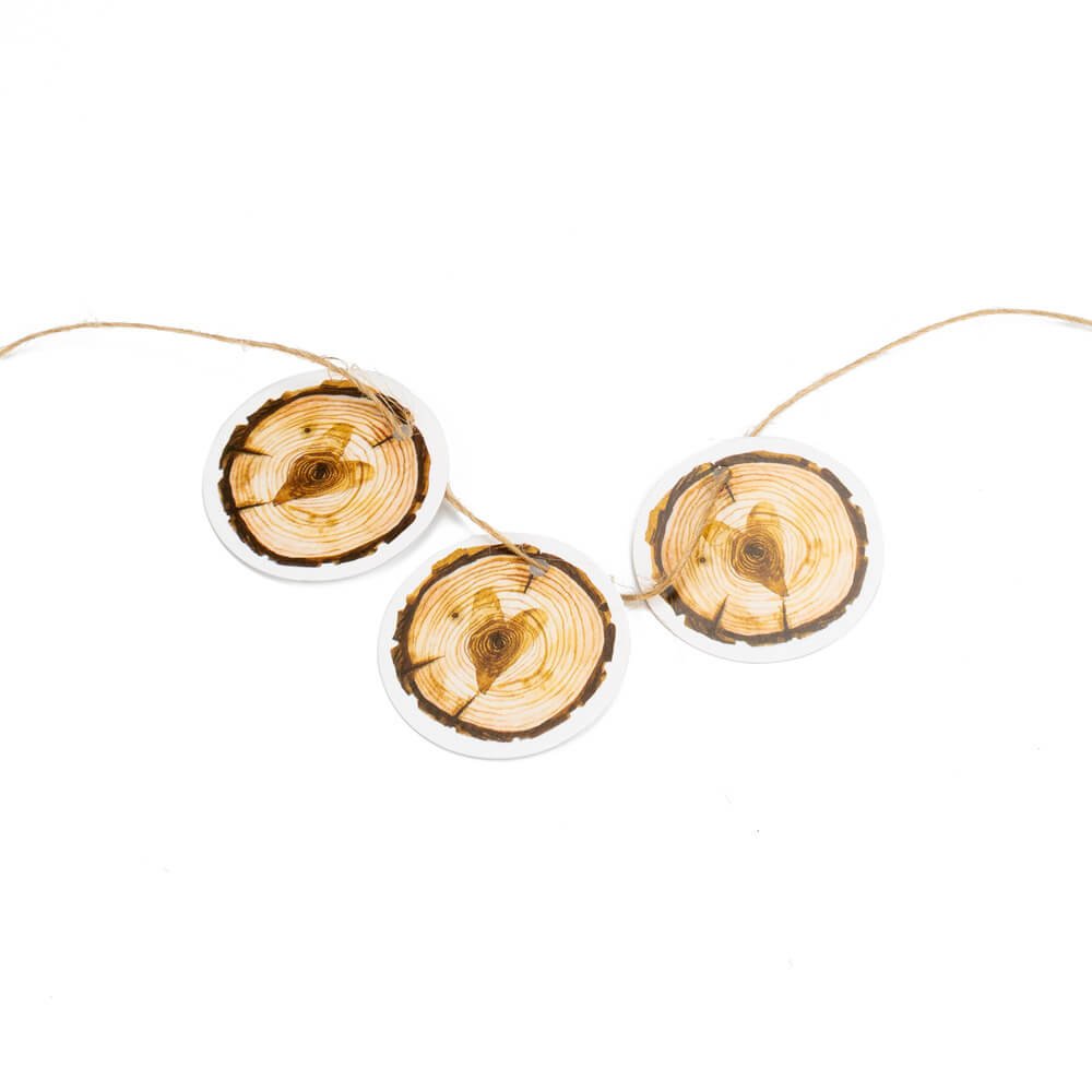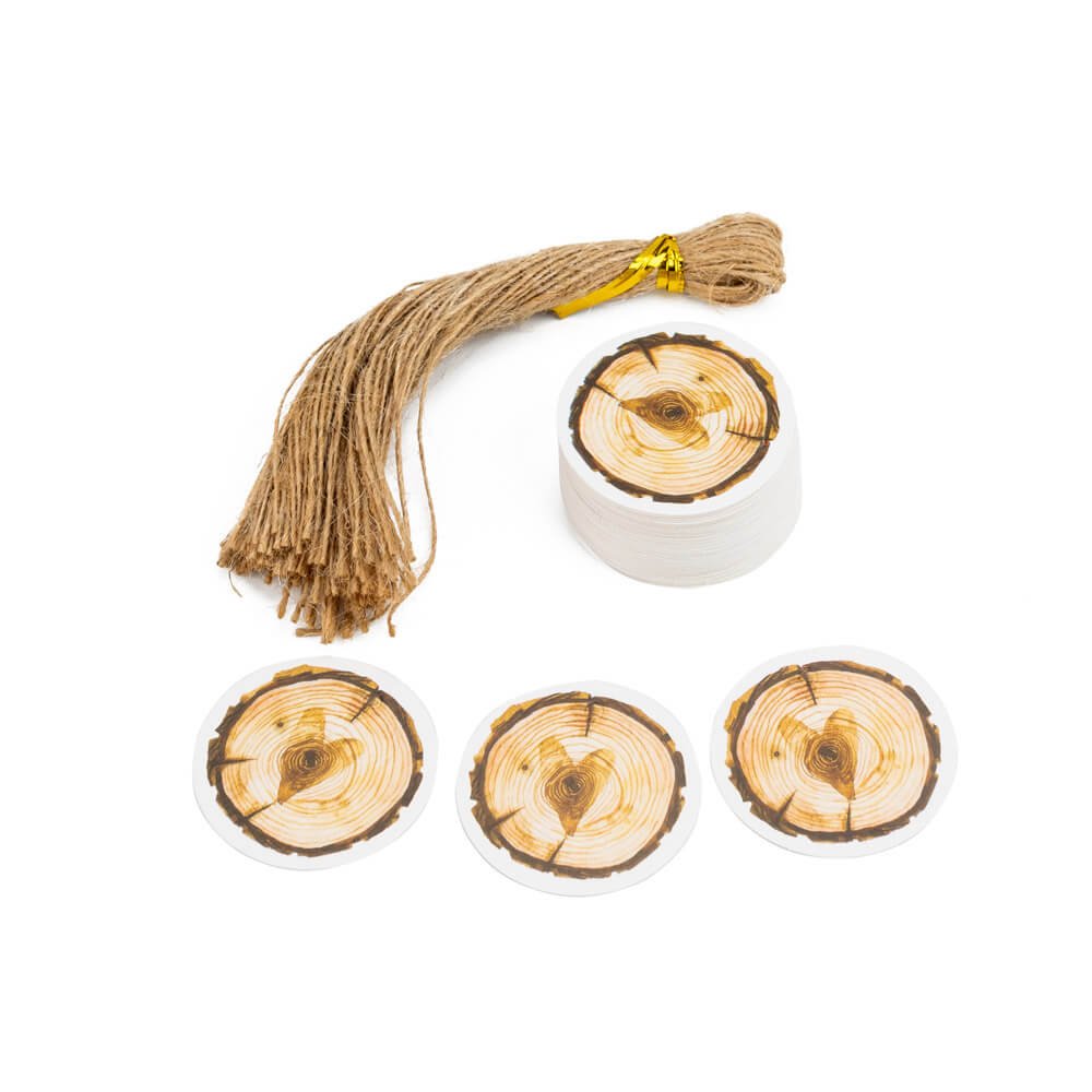 Etichete rotunde cu sfoară model inimă pe fundal de lemn - maro (set 50 buc), etichete rotunde elegante cu sfoară, perfecte pentru adăugarea unui touch rustic și personal la orice eveniment.