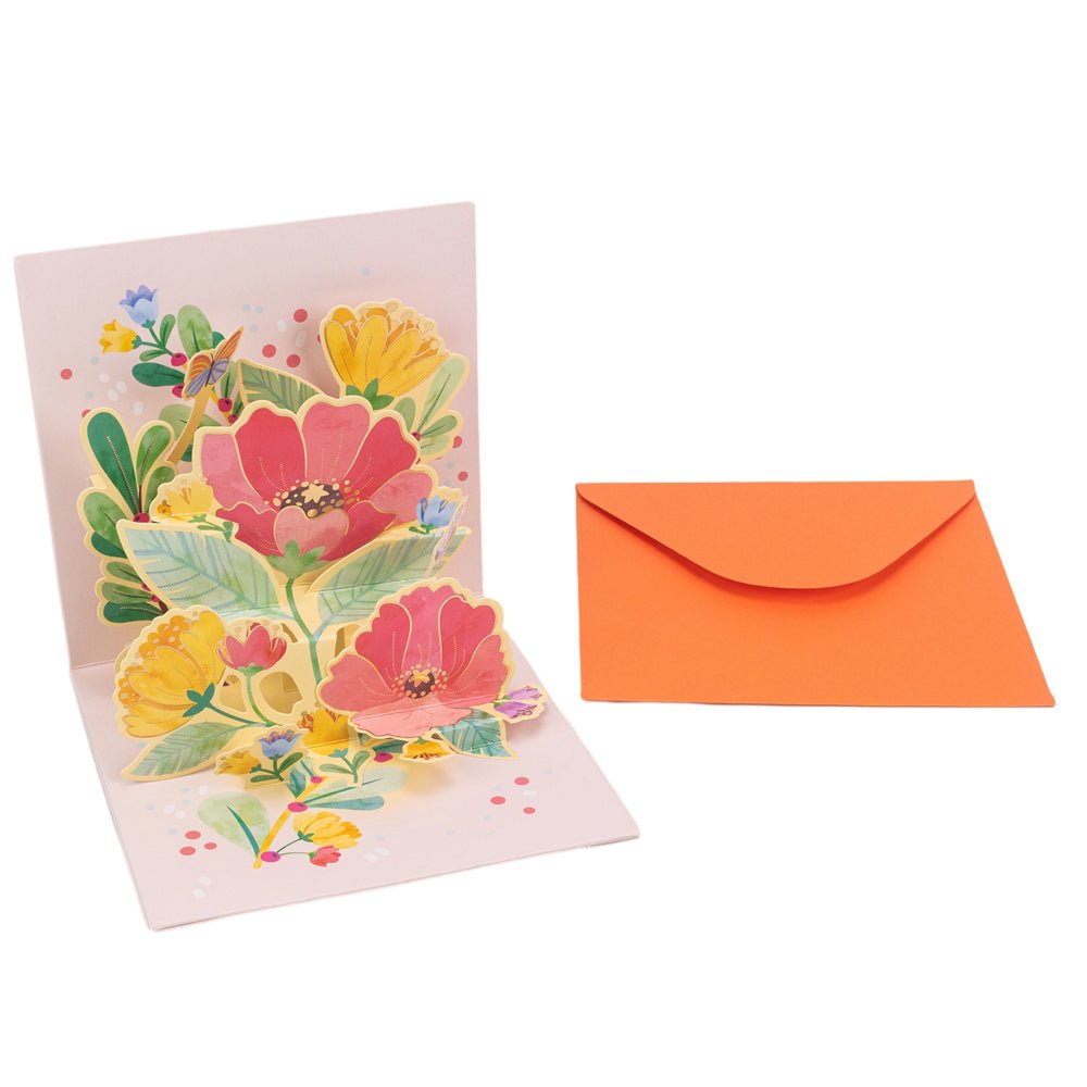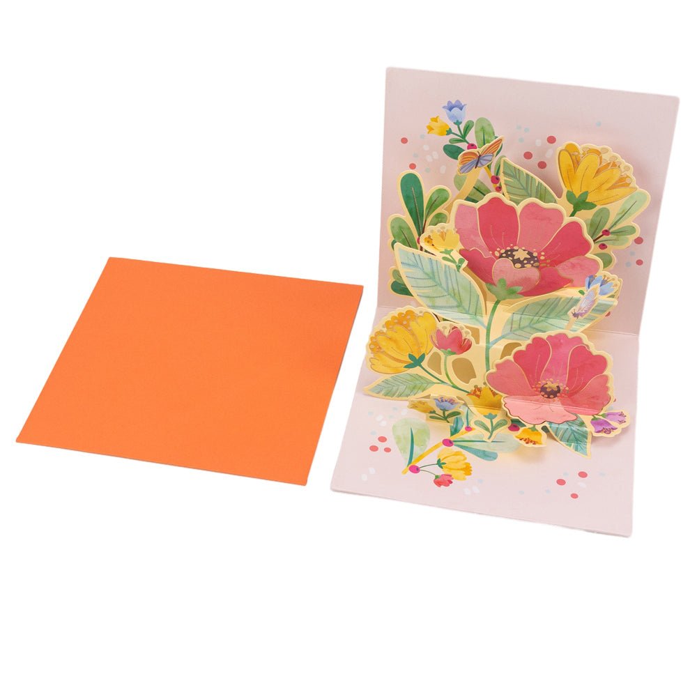 Felicitare 3D model floral - roz, o felicitare interactivă și spectaculoasă, care se deschide pentru a dezvălui un buchet colorat de flori tridimensionale. Designul combină elemente florale cu fluturi și detalii decorative, totul într-o prezentare care surprinde și încântă prin efectul său pop