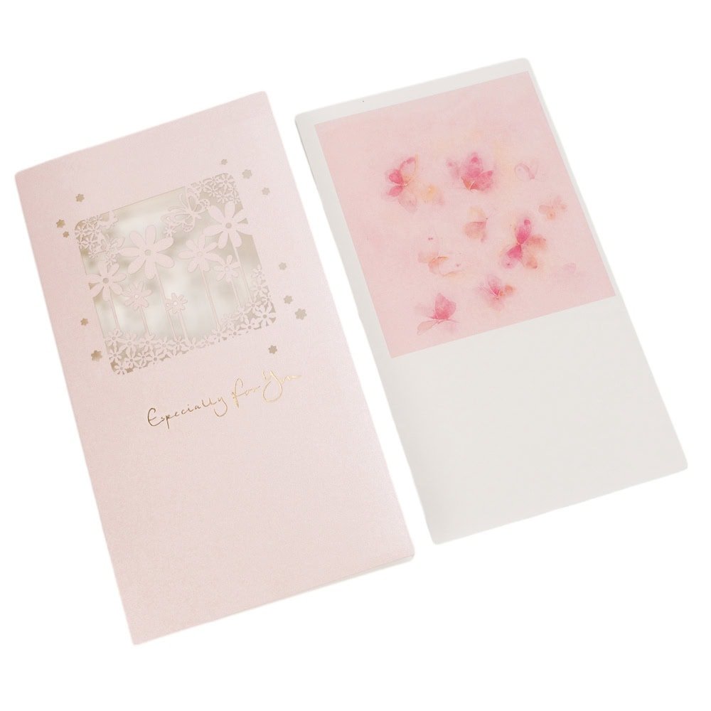 Felicitări cu fereastră model floral și plic - roz. Aceste felicitări elegante și delicate sunt perfecte pentru a transmite un mesaj cald și personal. Cu designul lor floral și fereastra subtilă, felicitările creează o atmosferă de serenitate și finețe.