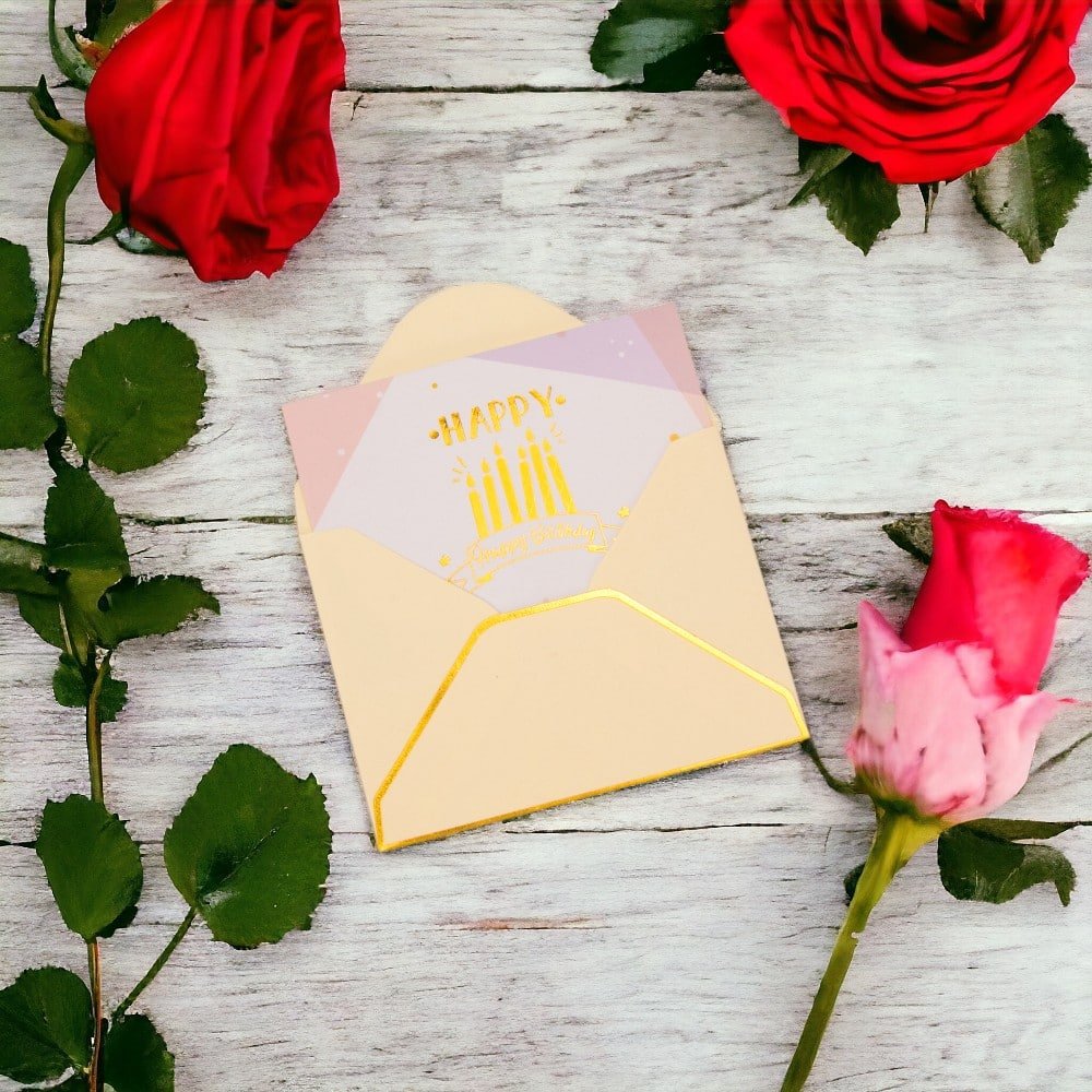 • Mesaj auriu "Happy Birthday" gravat cu o folie strălucitoare, adăugând o notă de eleganță și rafinament.