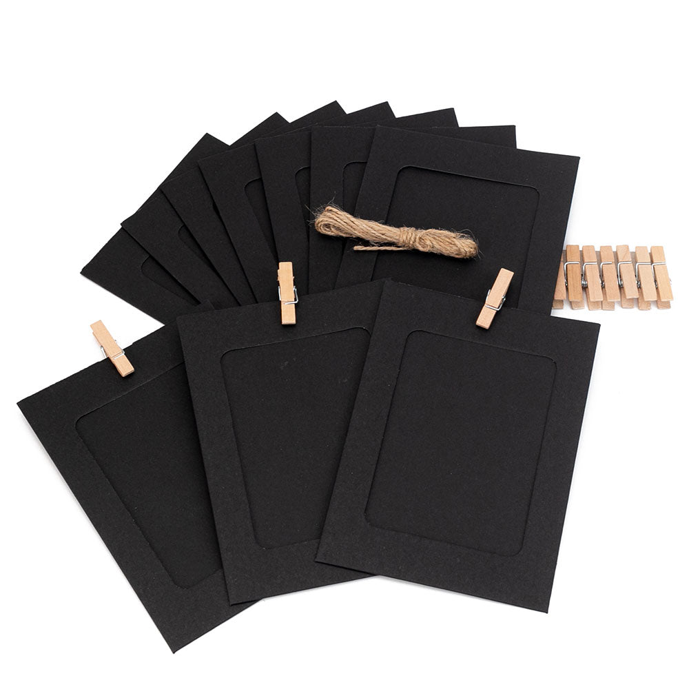 • Setul contine: 10 rame de carton, 10 carlige din lemn si o sfoara din iuta