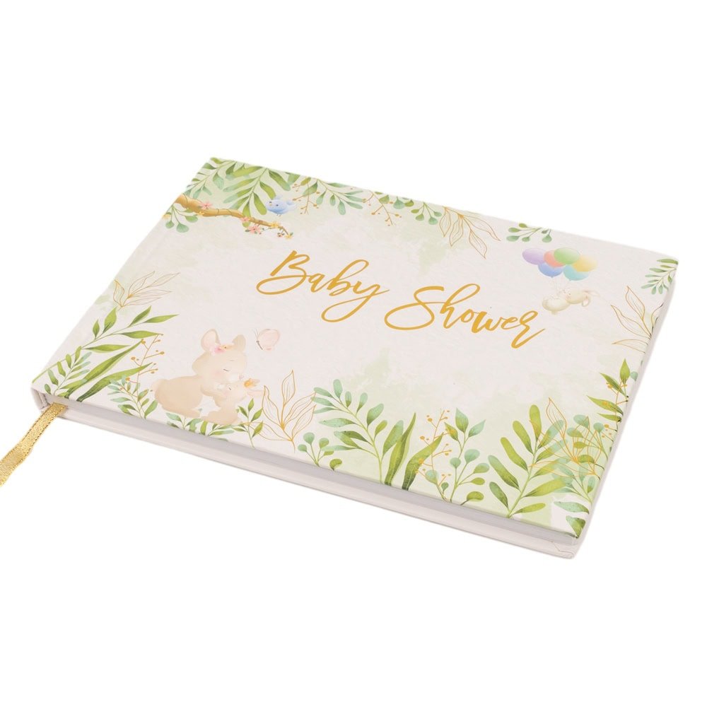 • Copertă cu design floral și inscripția “Baby Shower” în auriu: Oferă un aspect sofisticat și plin de farmec, fiind perfect pentru o petrecere de Baby Shower.