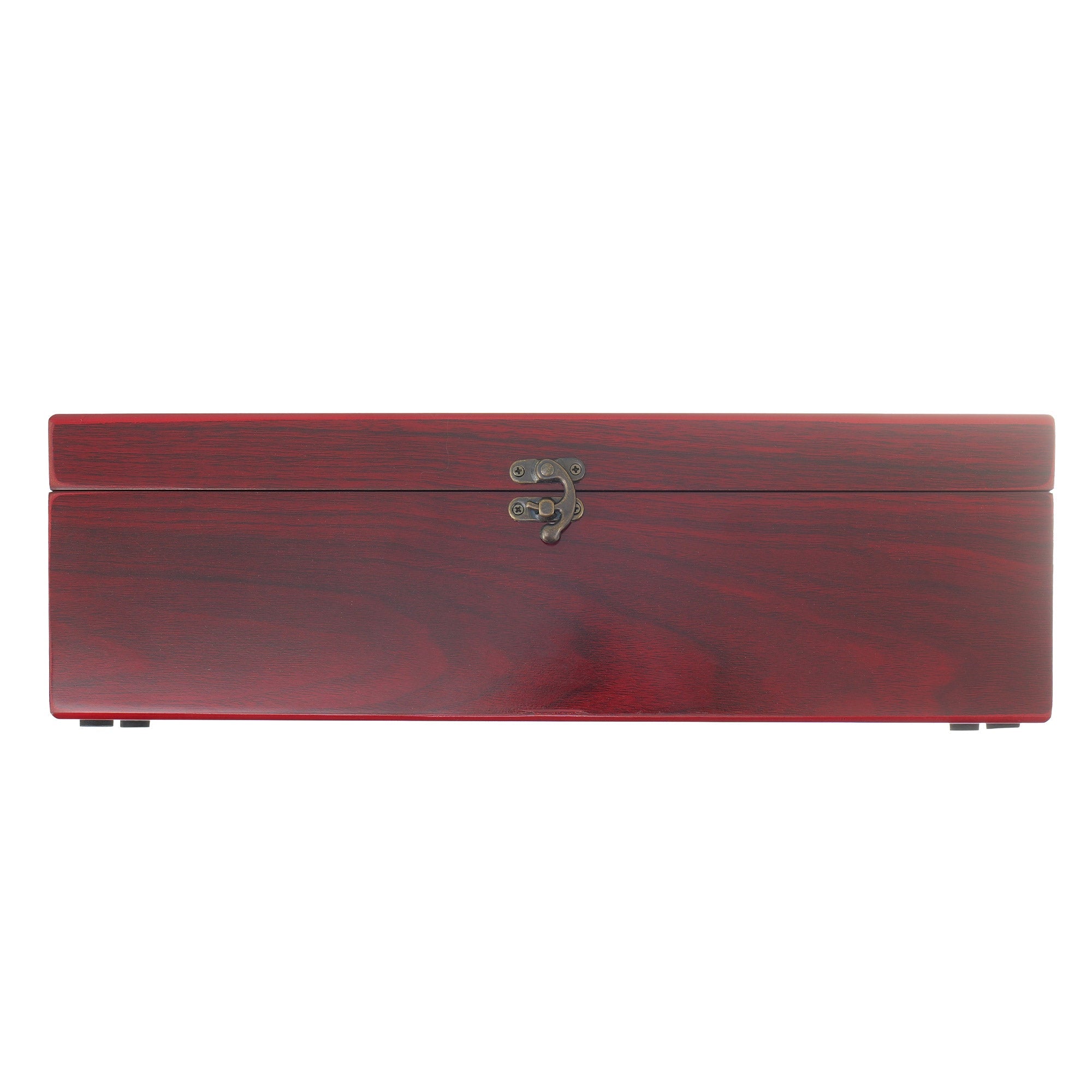 Cutie premium pentru cadou, realizată din plastic cu finisaj ce imită lemnul de mahon cu tentă roșiatică. Interiorul este căptușit cu material textil satinat de culoare roșie. Cutia este compatibilă cu sticlele clasice de vin și include un set complet de accesorii utile pentru servirea băuturii.