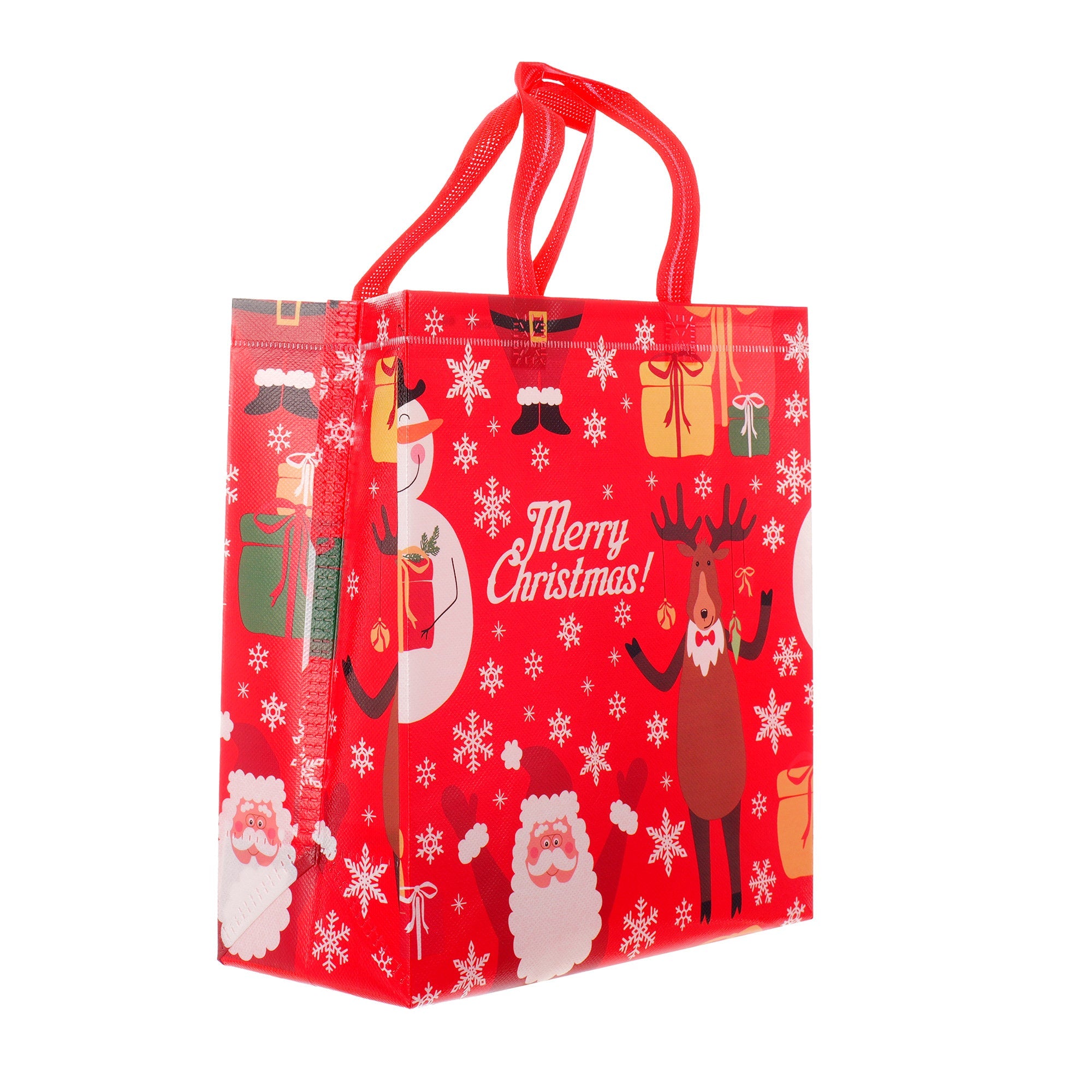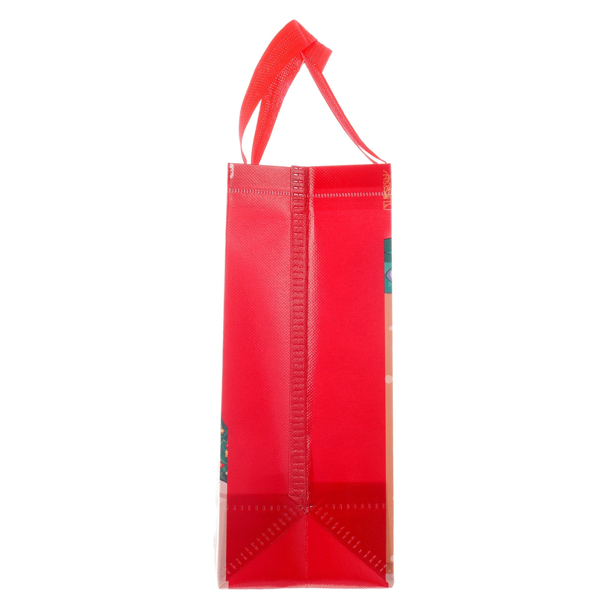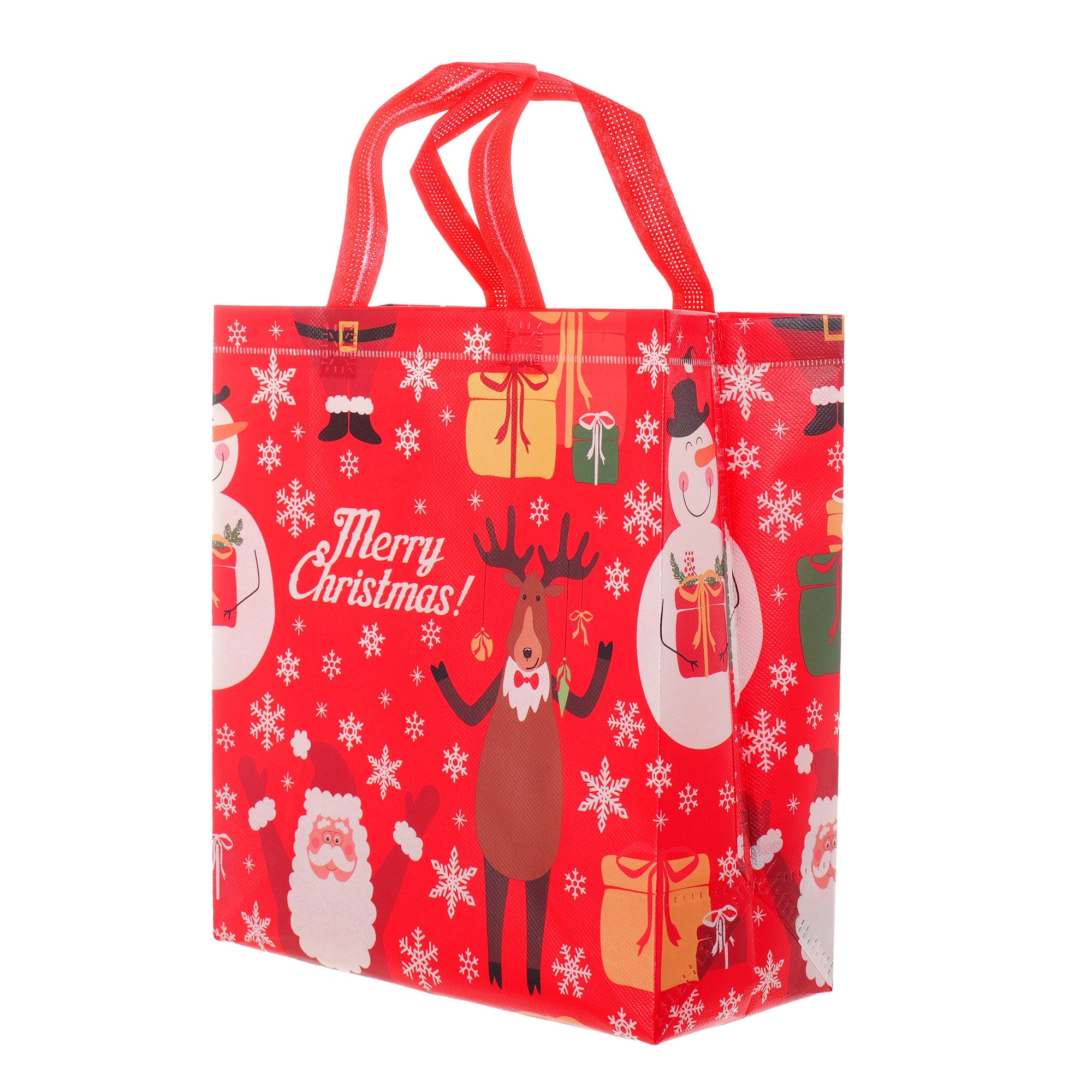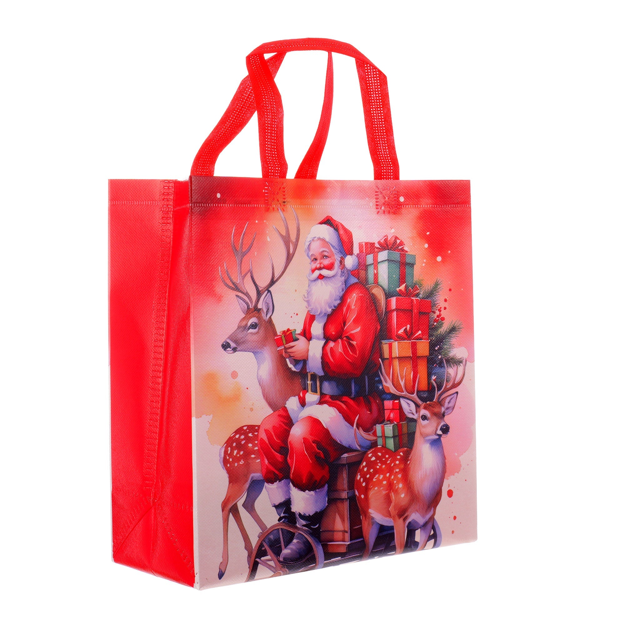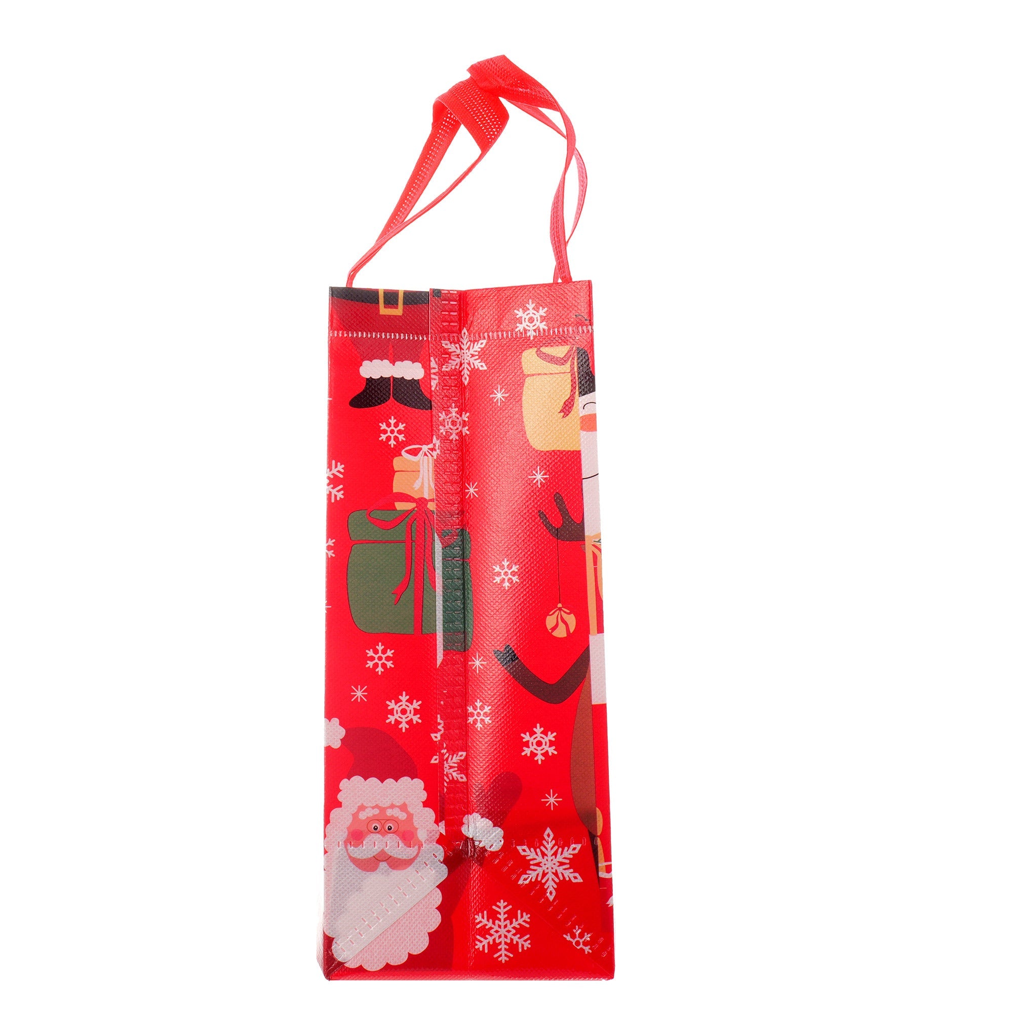 Sacoșă textilă reutilizabilă cu tematică de Crăciun, realizată din polipropilenă netesută (non-woven), rezistentă și practică pentru ambalarea și transportul cadourilor de sărbători. Baza lată de 12 cm îi permite să stea în picioare, oferind stabilitate pentru obiectele ambalate.