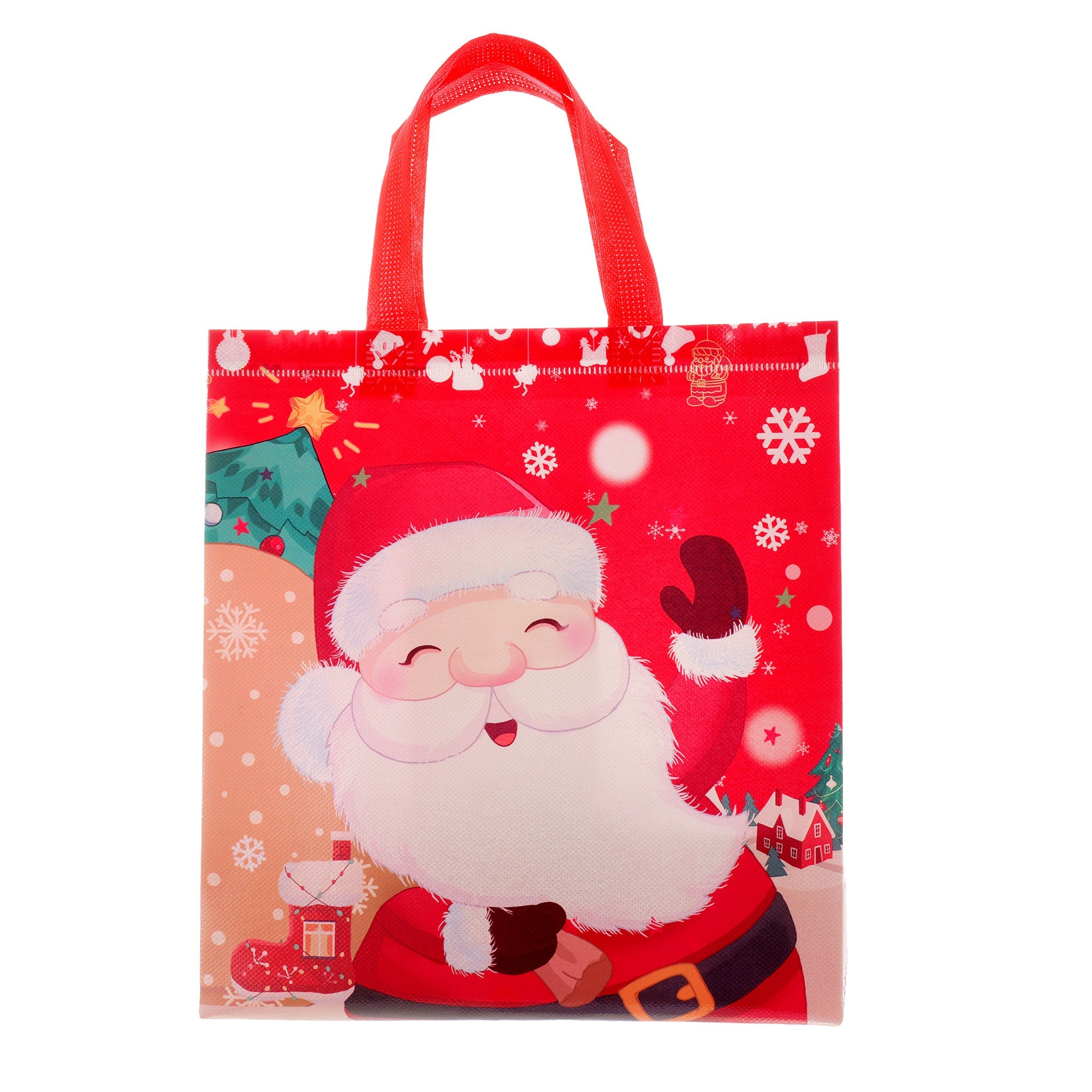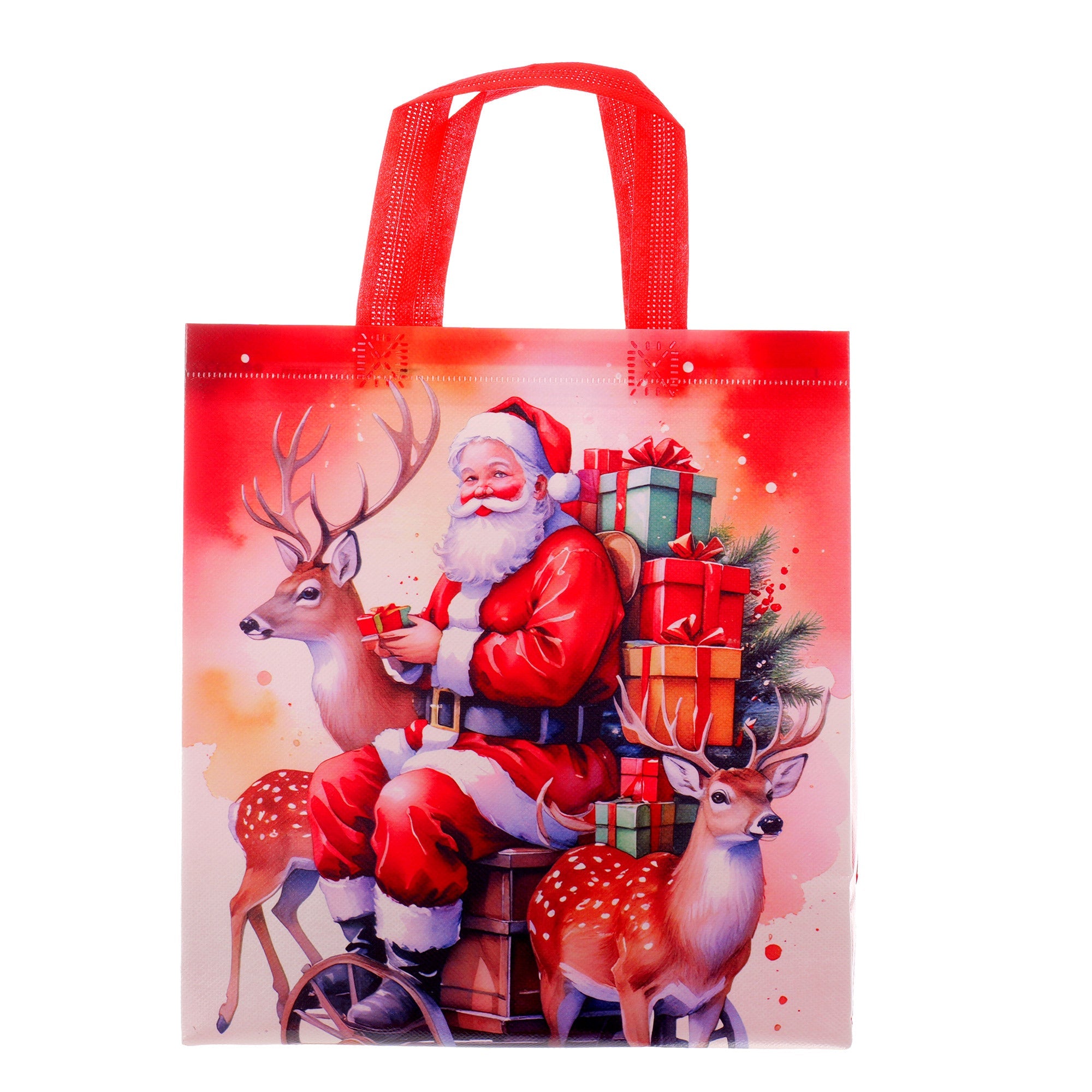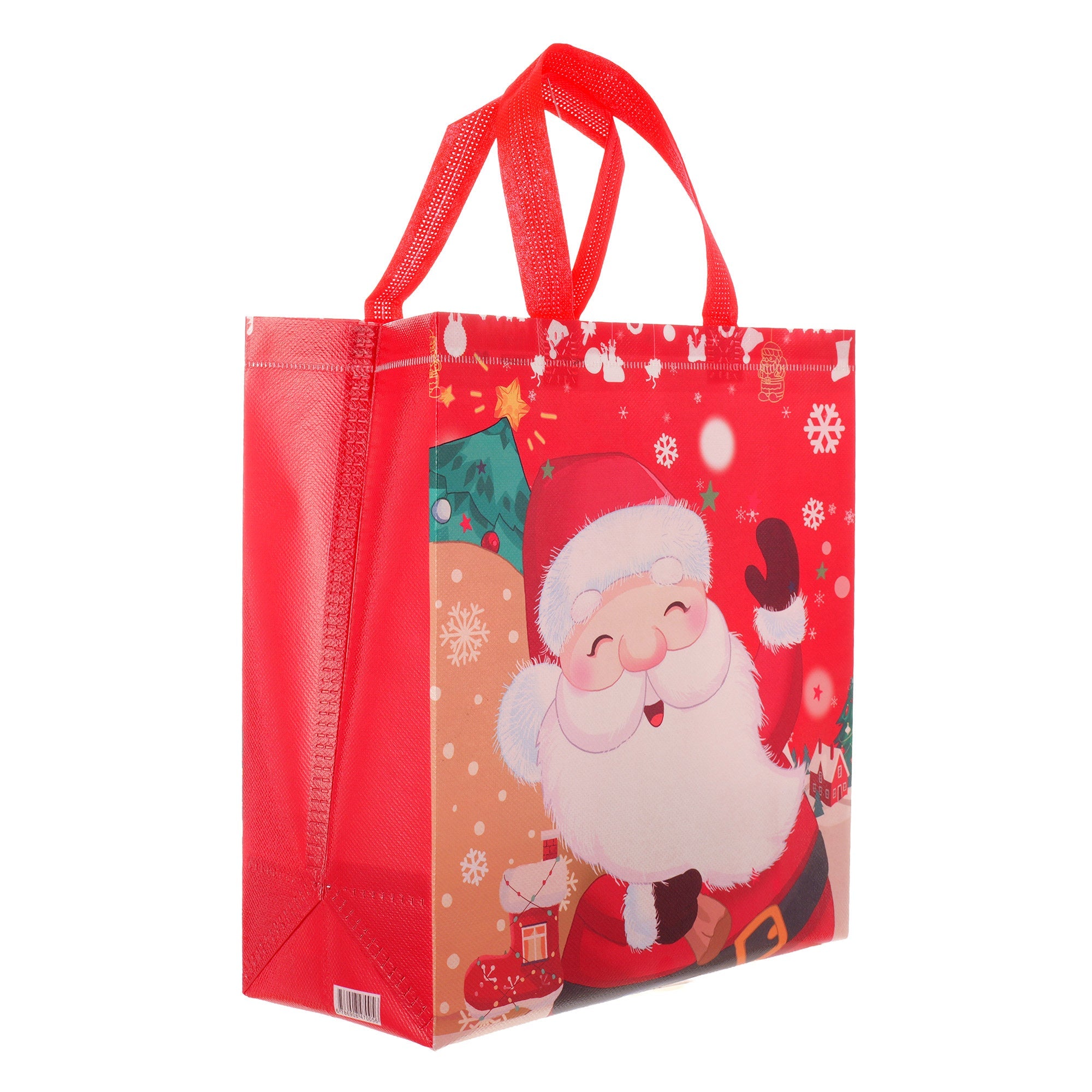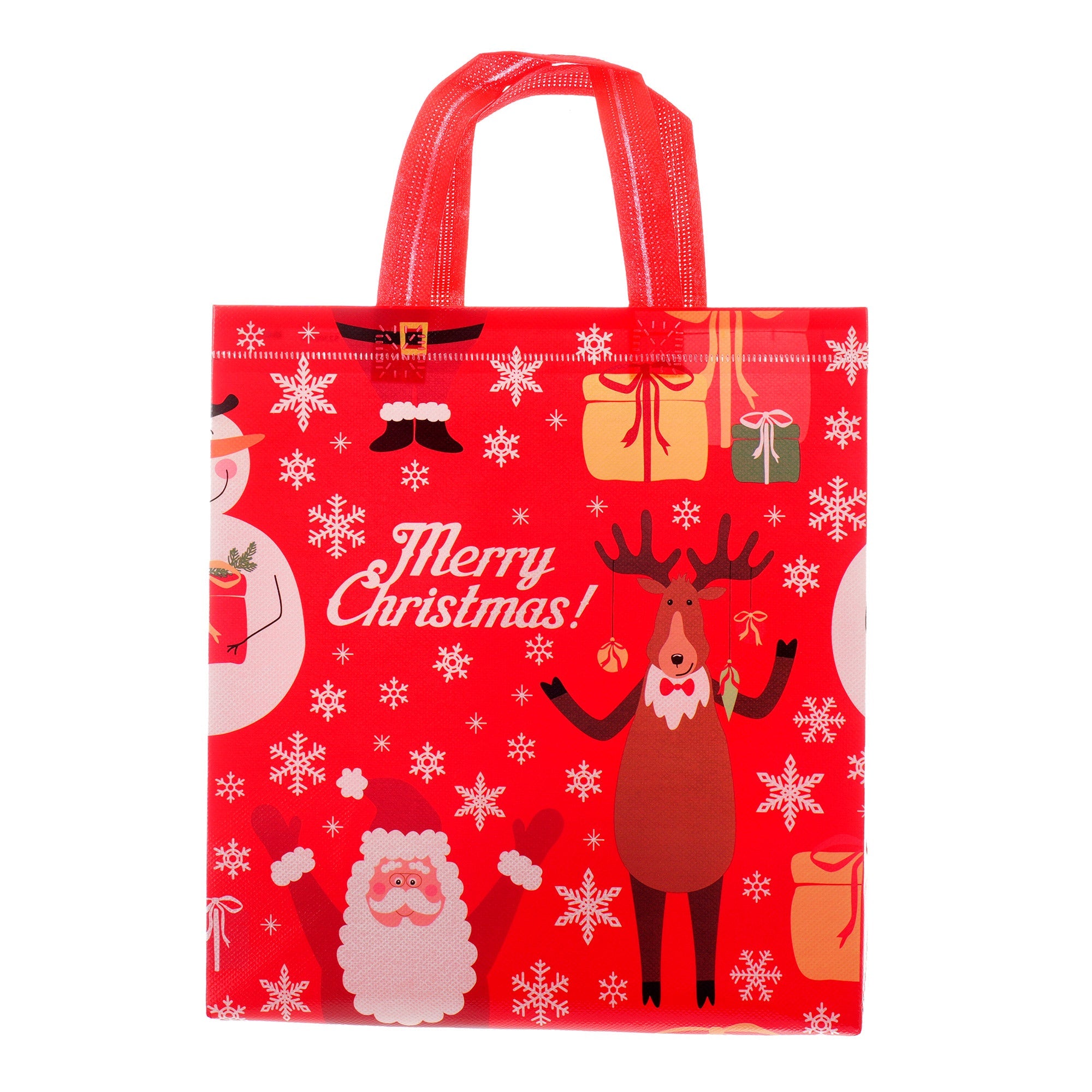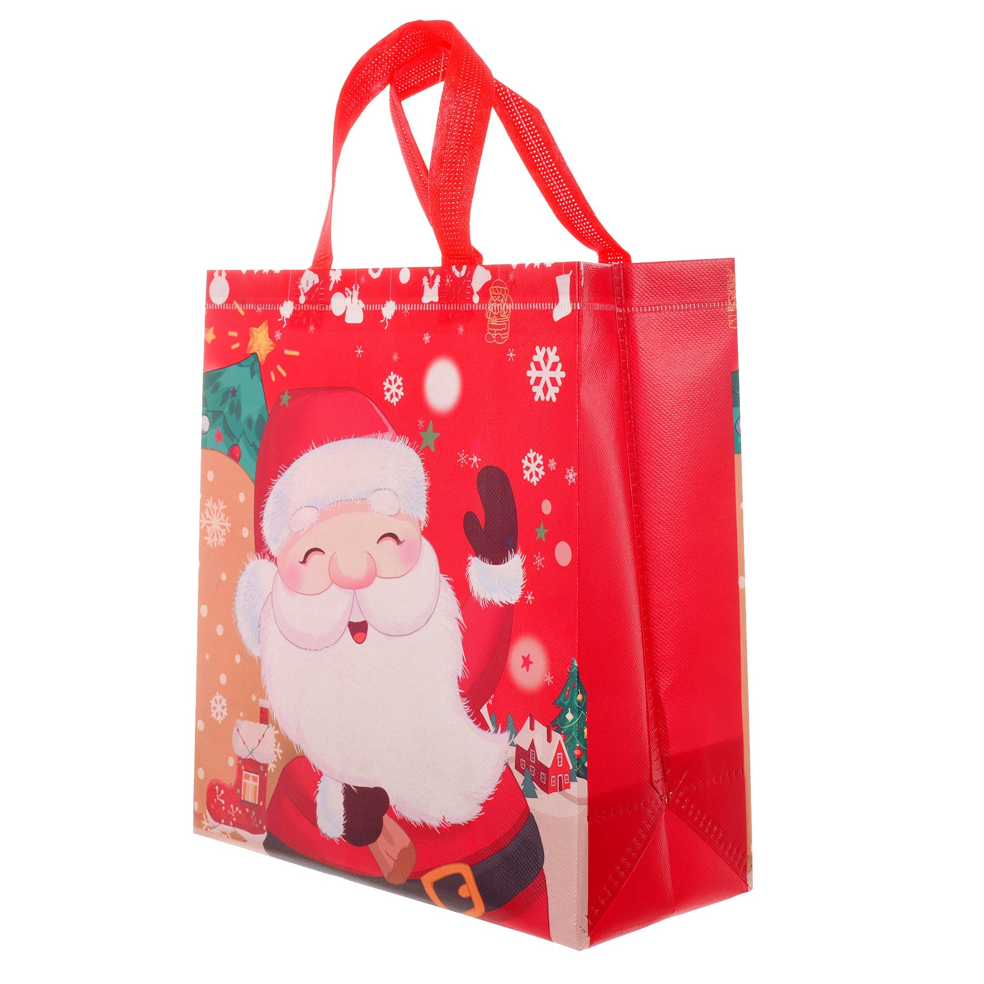 Sacoșă textilă reutilizabilă cu tematică de Crăciun, realizată din polipropilenă netesută (non-woven), rezistentă și practică pentru ambalarea și transportul cadourilor de sărbători. Baza lată de 12 cm îi permite să stea în picioare, oferind stabilitate pentru obiectele ambalate.