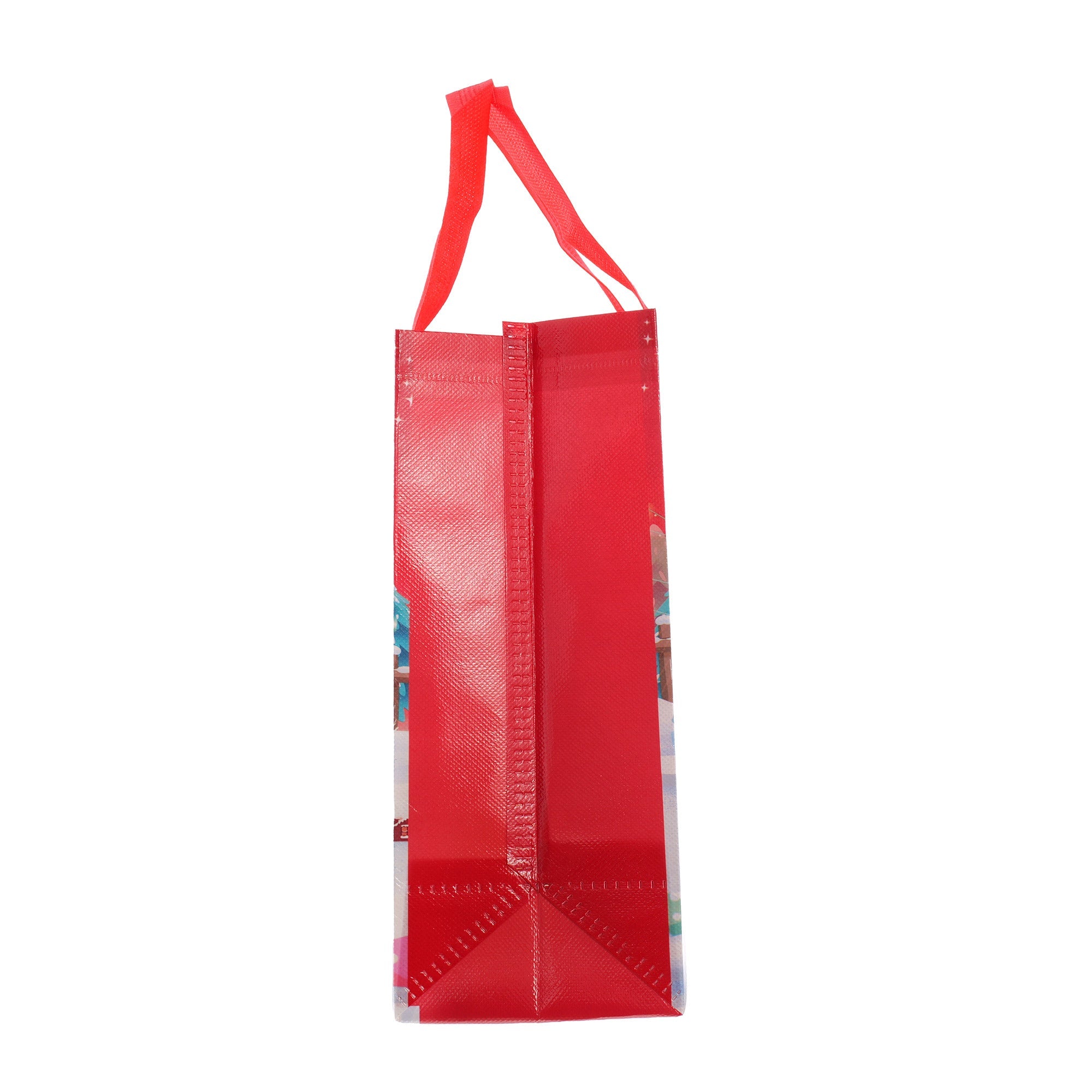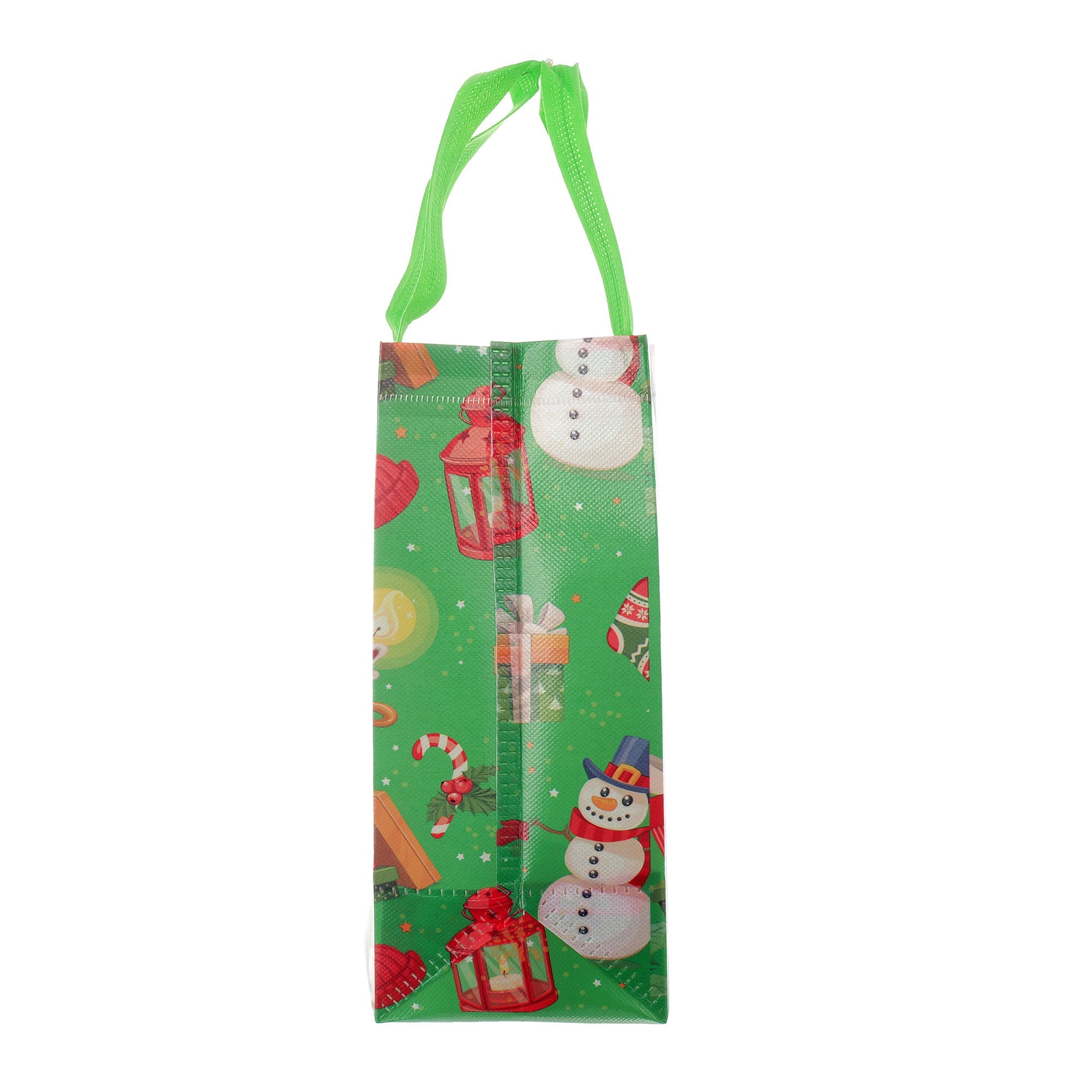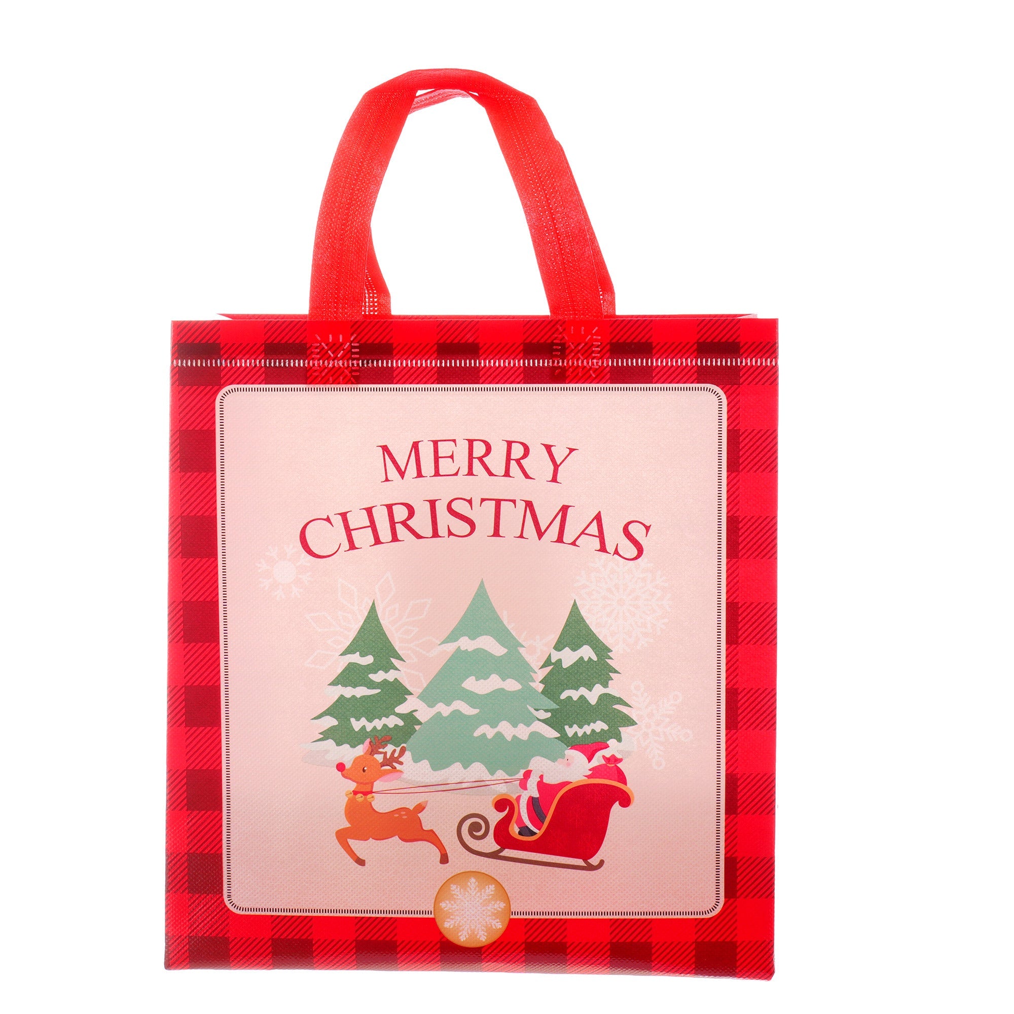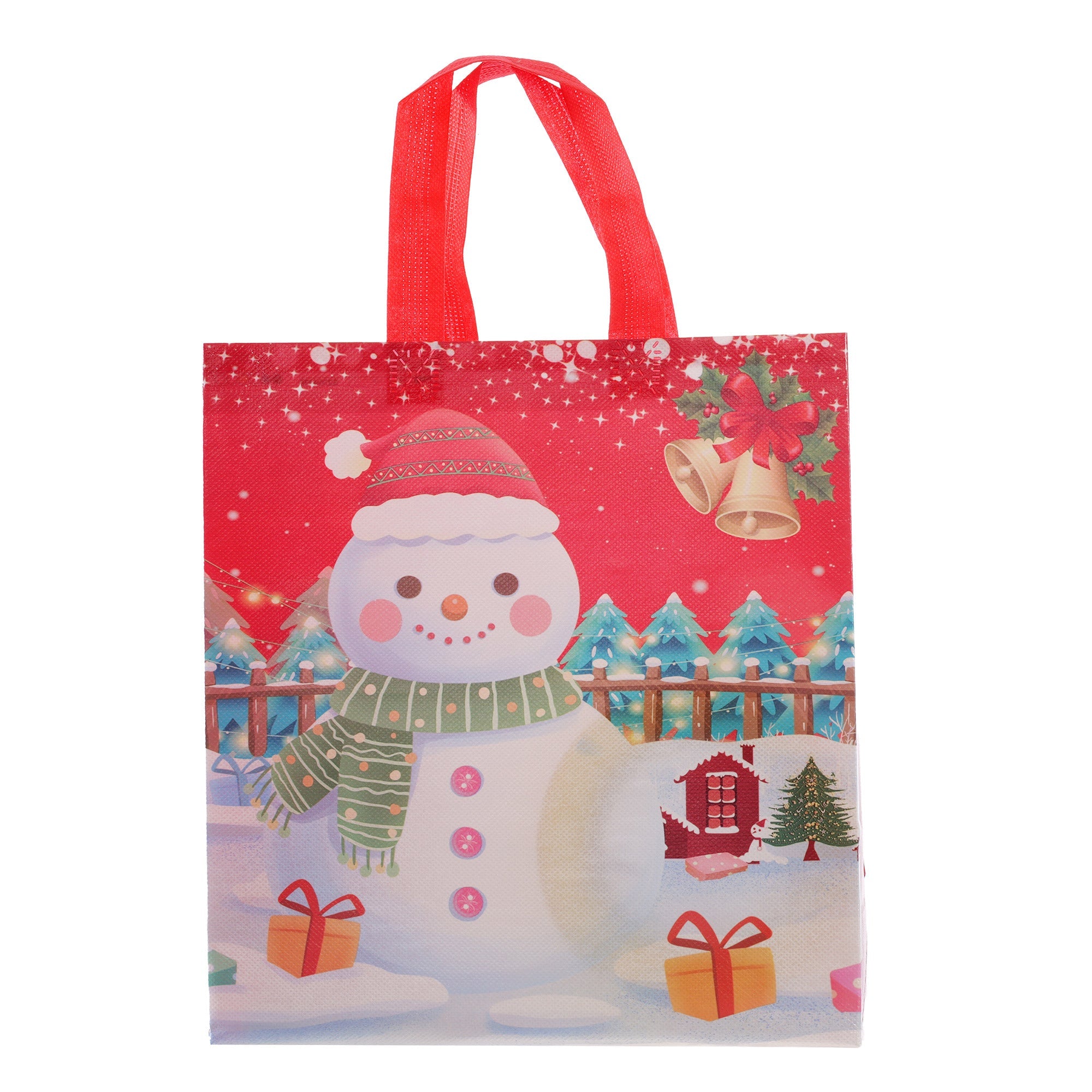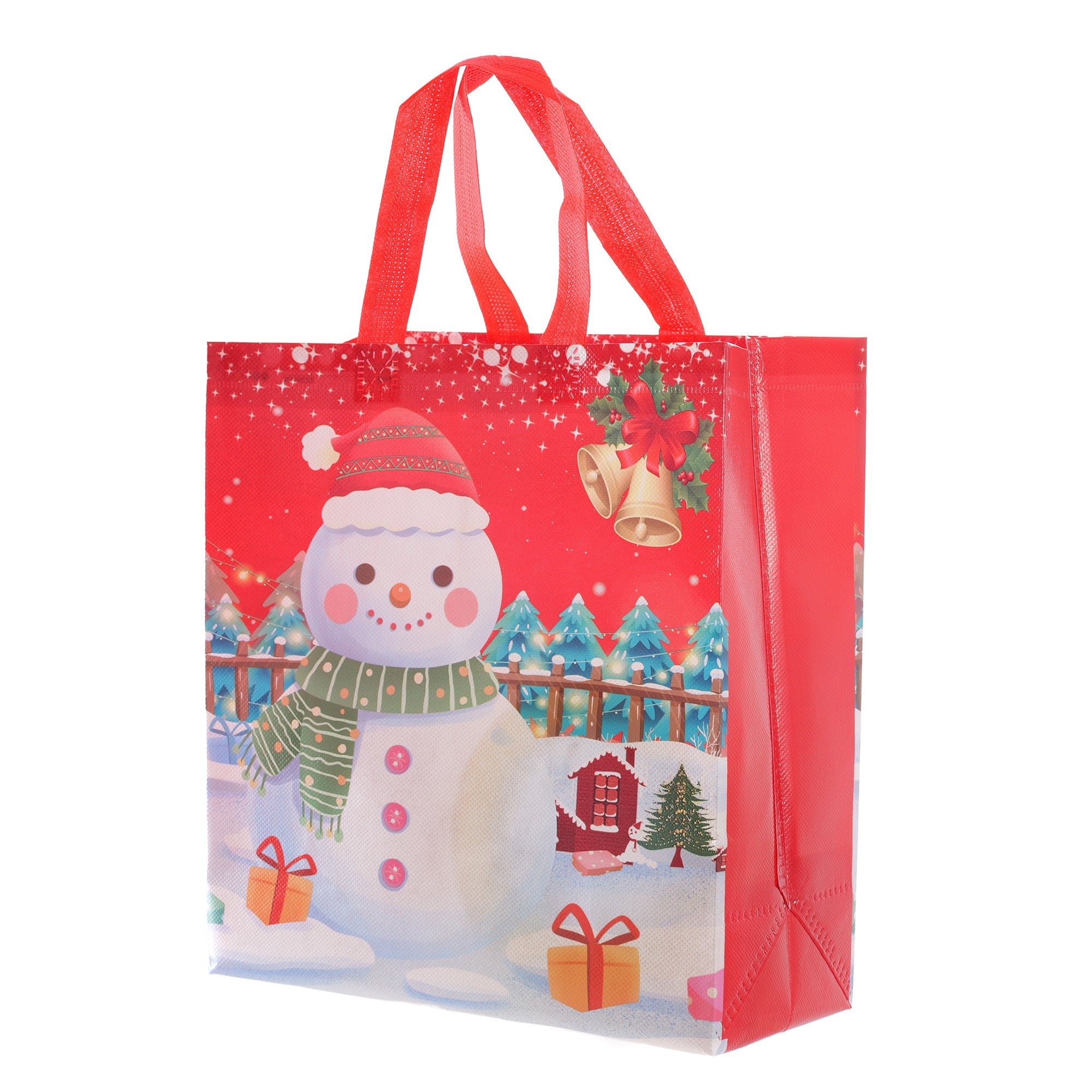 Sacoșă textilă reutilizabilă cu tematică de Crăciun, realizată din polipropilenă netesută (non-woven), rezistentă și practică pentru ambalarea și transportul cadourilor de sărbători. Baza lată de 12 cm îi permite să stea în picioare, oferind stabilitate pentru obiectele ambalate.