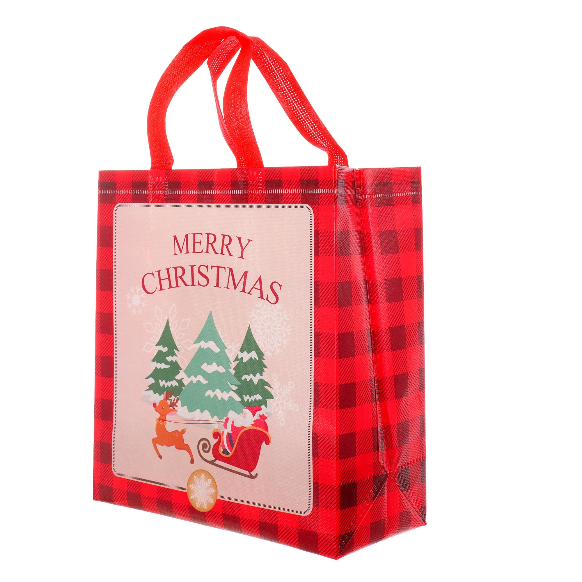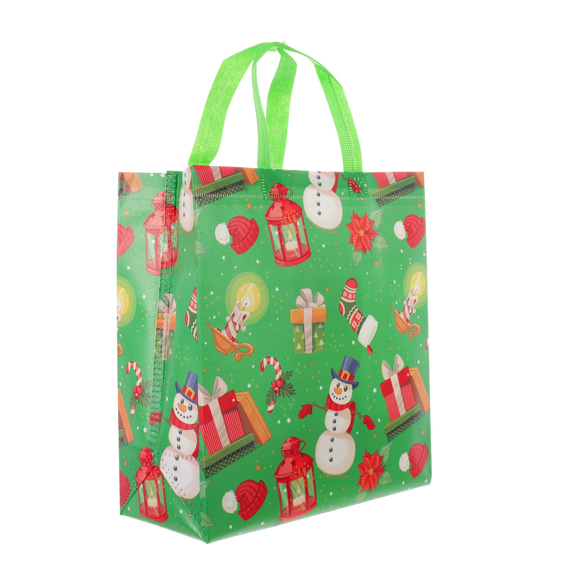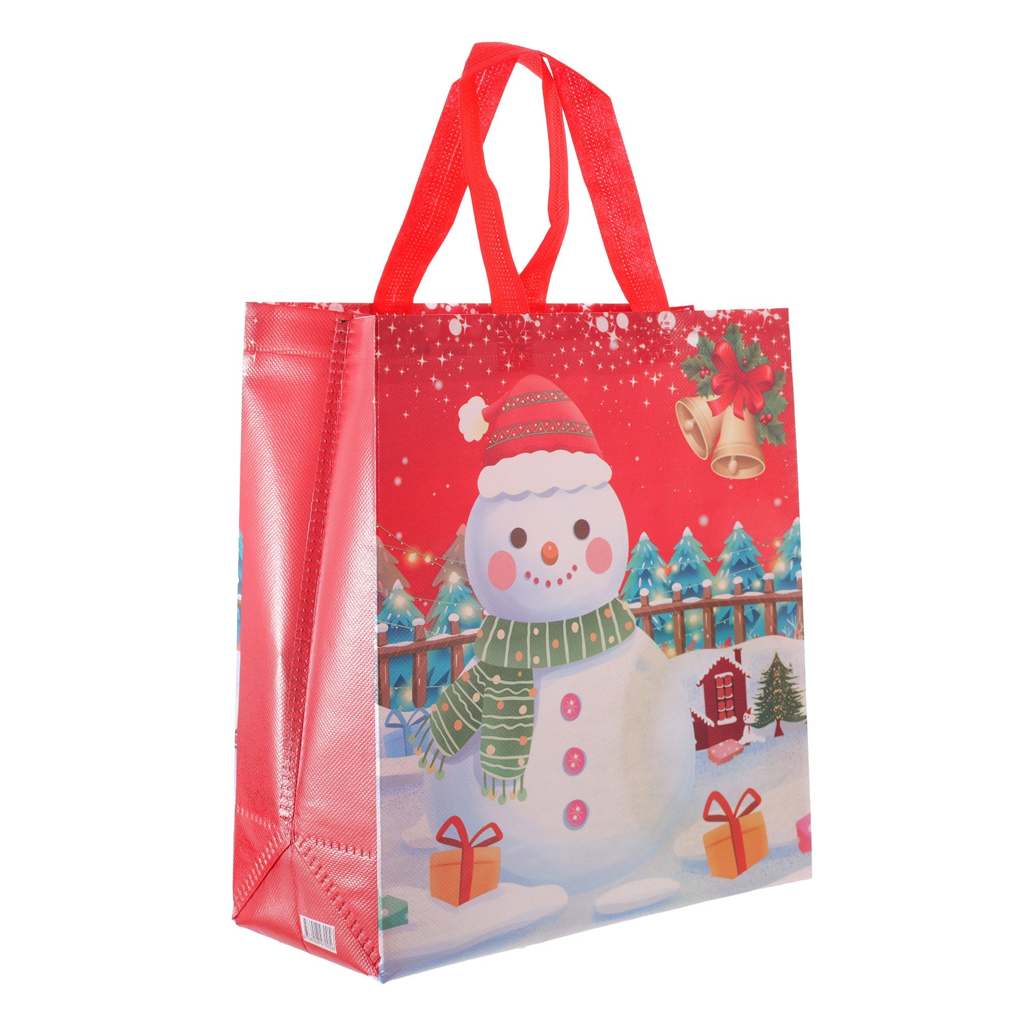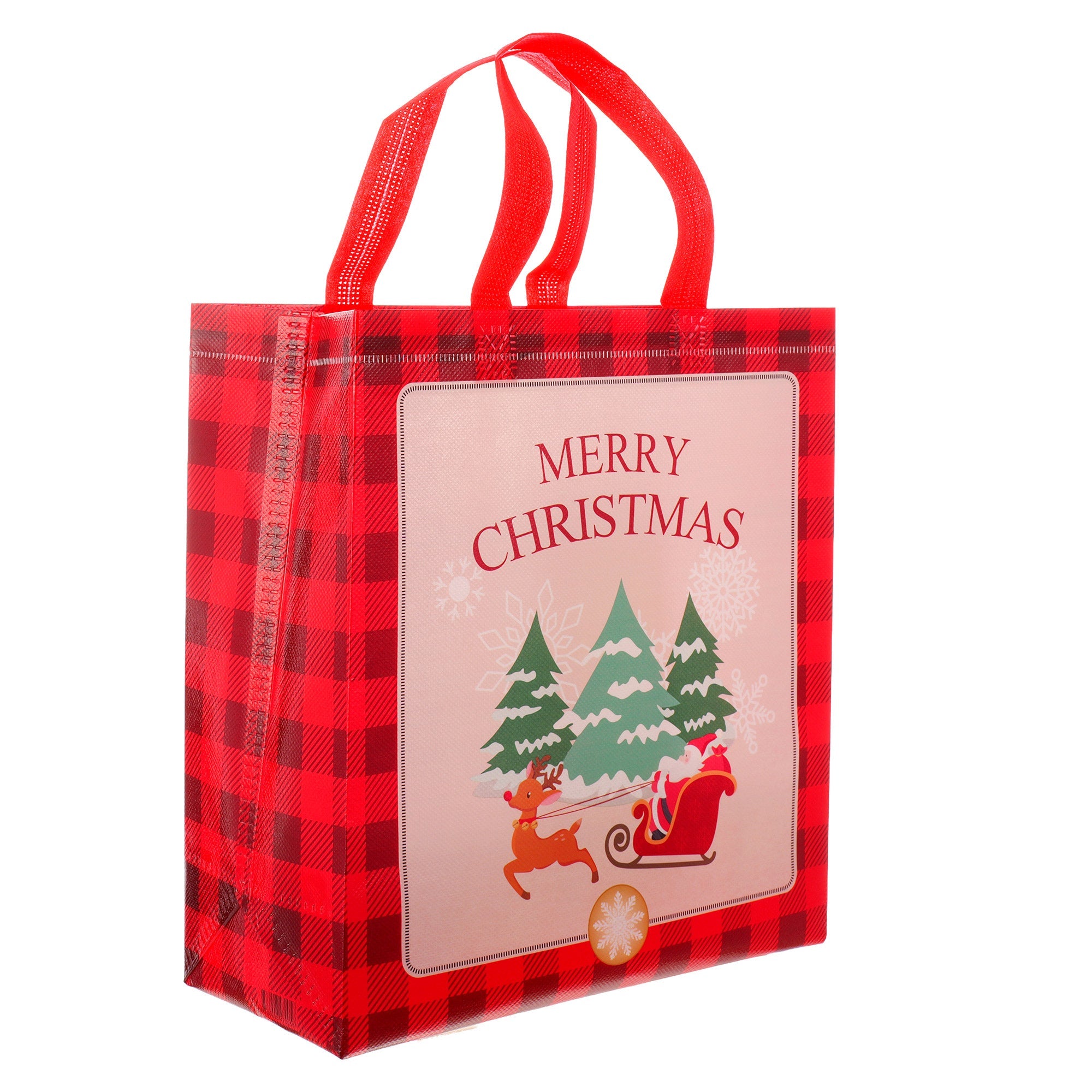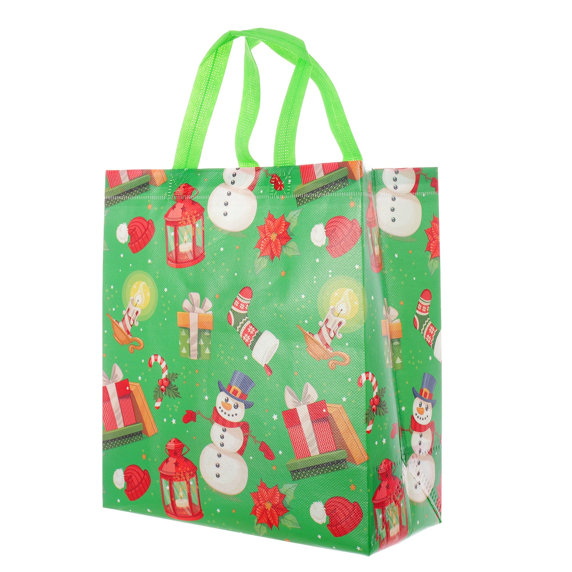 Sacoșă textilă reutilizabilă cu tematică de Crăciun, realizată din polipropilenă netesută (non-woven), rezistentă și practică pentru ambalarea și transportul cadourilor de sărbători. Baza lată de 12 cm îi permite să stea în picioare, oferind stabilitate pentru obiectele ambalate.