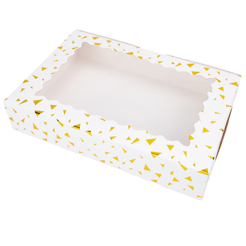 O cutie elegantă și festivă din hârtie, decorată cu triunghiuri aurii strălucitoare și o fereastră transparentă generoasă. Este ambalajul ideal pentru a prezenta cu rafinament și vizibilitate prăjituri asortate, produse de patiserie, cadouri delicate sau seturi de produse.