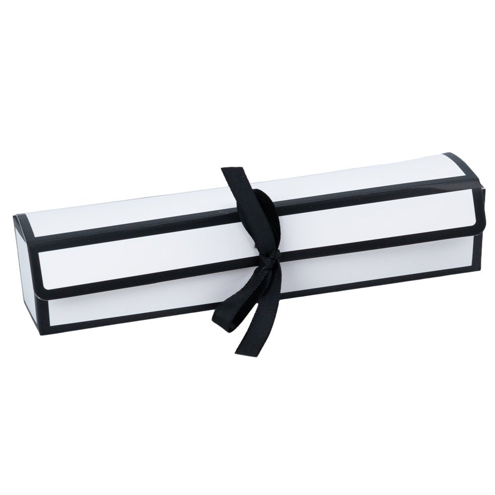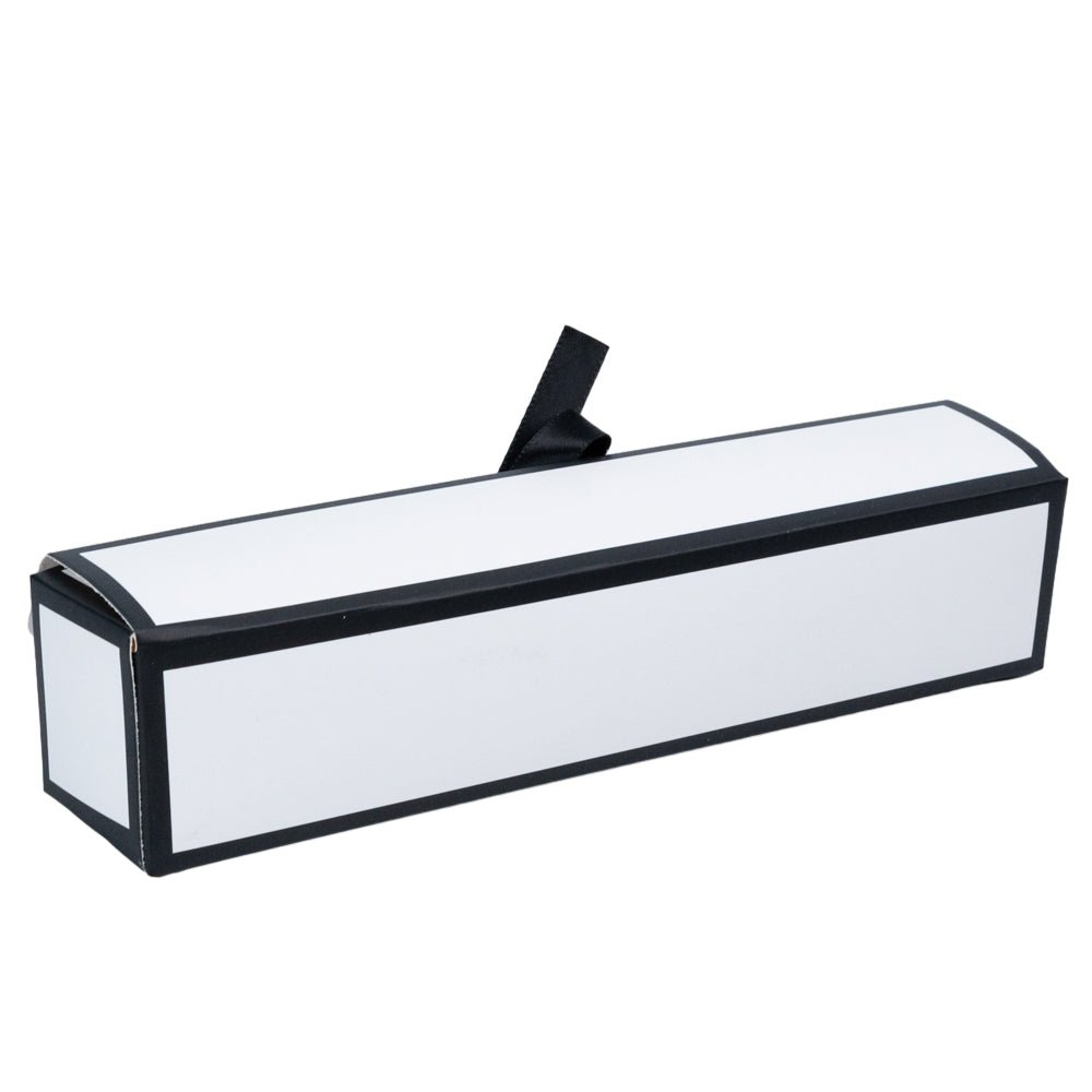 O cutie rigletă minimalistă și sofisticată, de un alb imaculat, accentuată de marginile negre și o panglică elegantă. Perfectă pentru a ambala cu rafinament bijuterii, instrumente de scris, mini-cosmetice sau dulciuri fine, transformând orice produs într-un cadou de neuitat.