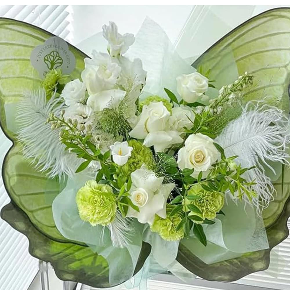 Foi de ambalat decorative model aripi de fluture - verde adaugă o notă de eleganță și delicatețe oricărui buchet cu aceste foi de ambalaj unice, inspirate de frumusețea aripilor de fluture. Confecționate dintr-un material ușor rezistent la apă și durabil, aceste foi îți permit să creezi aranjamente florale sau să înveleşti cadouri cu un aspect sofisticat și personalizat