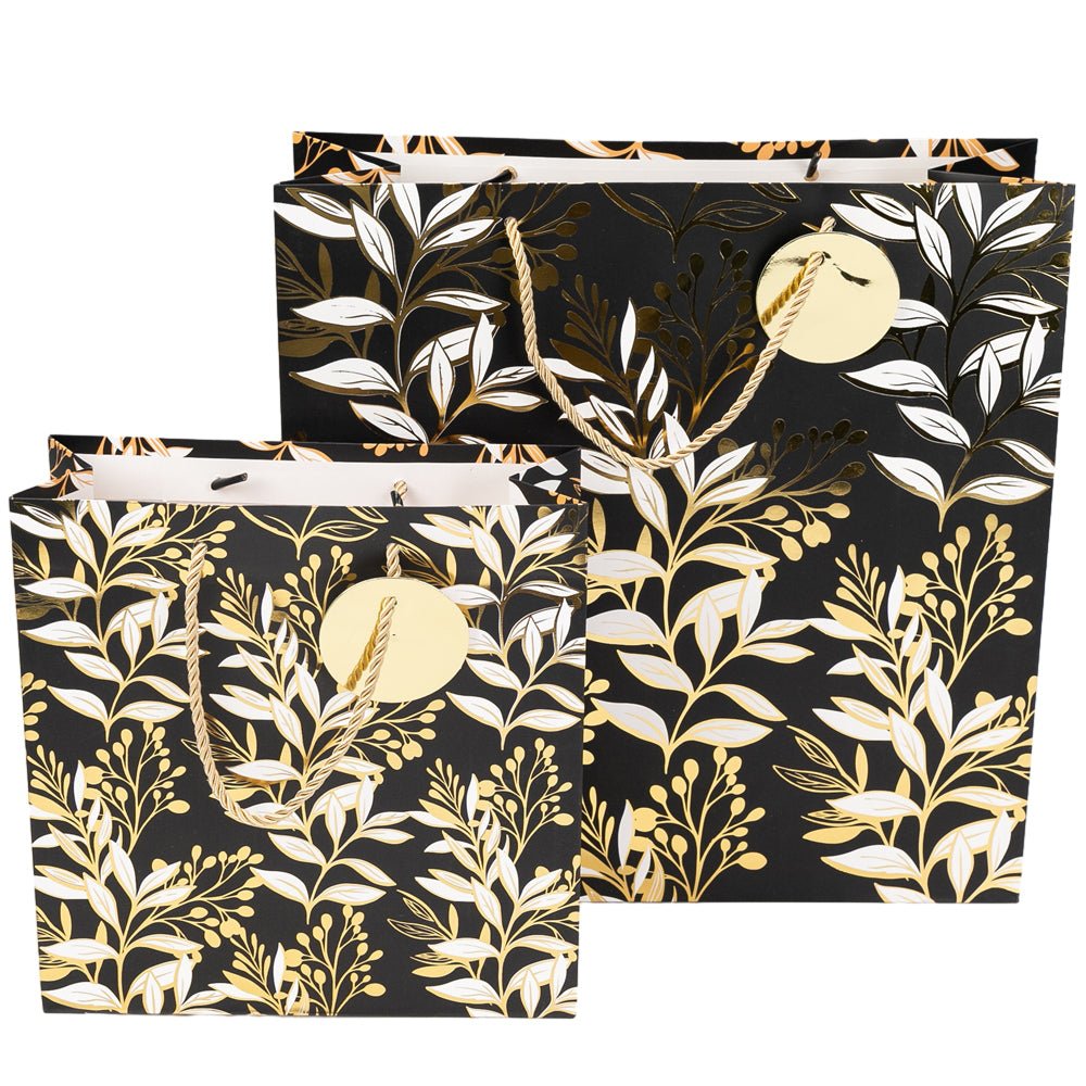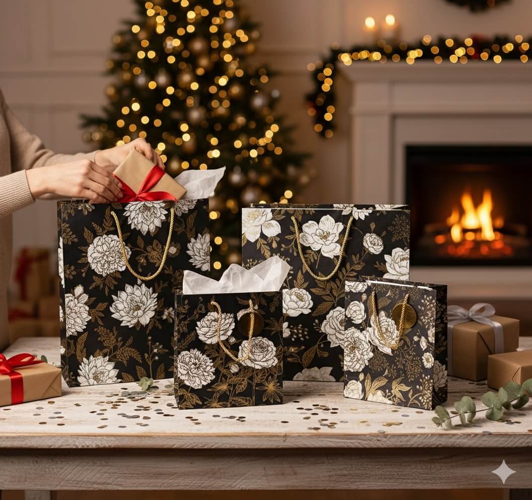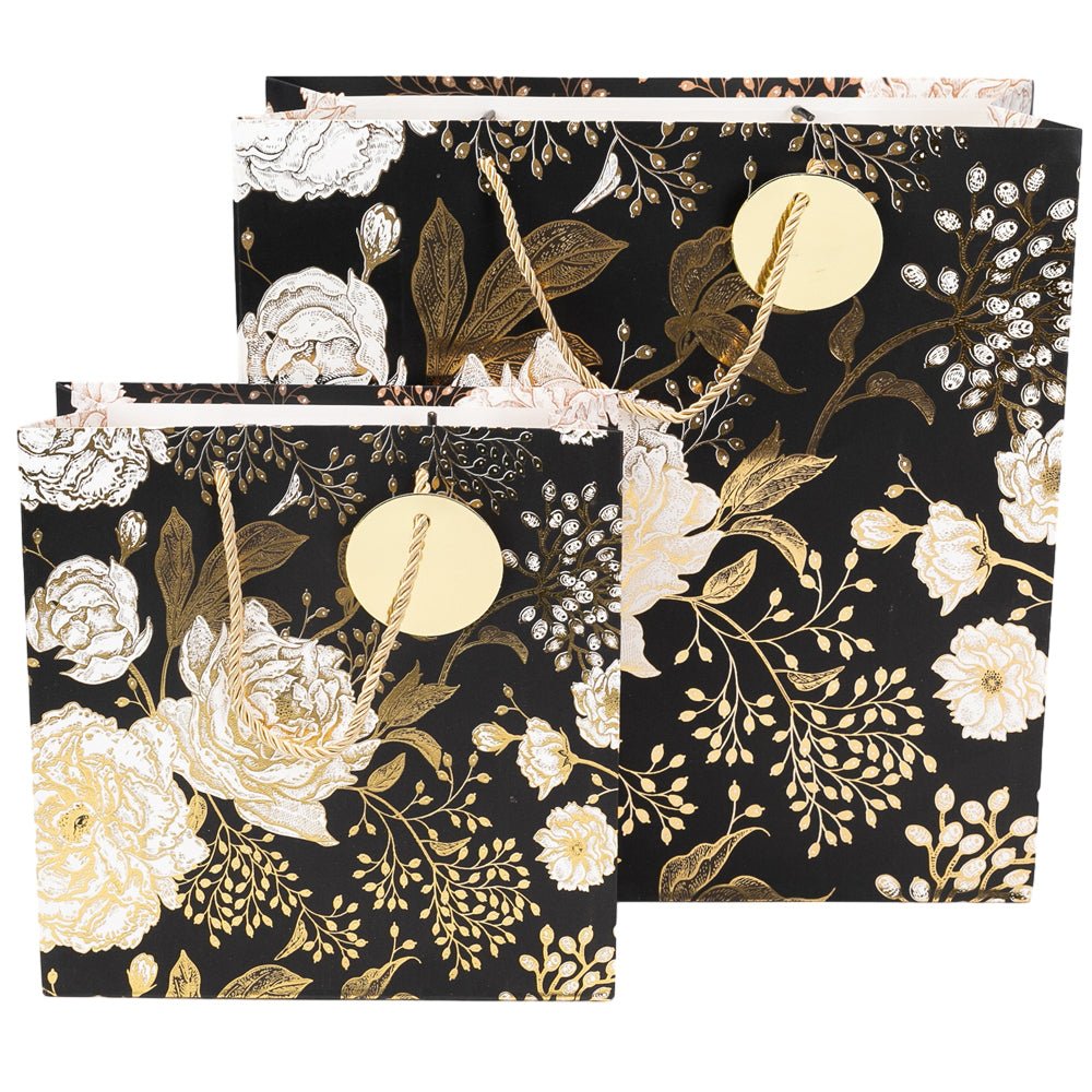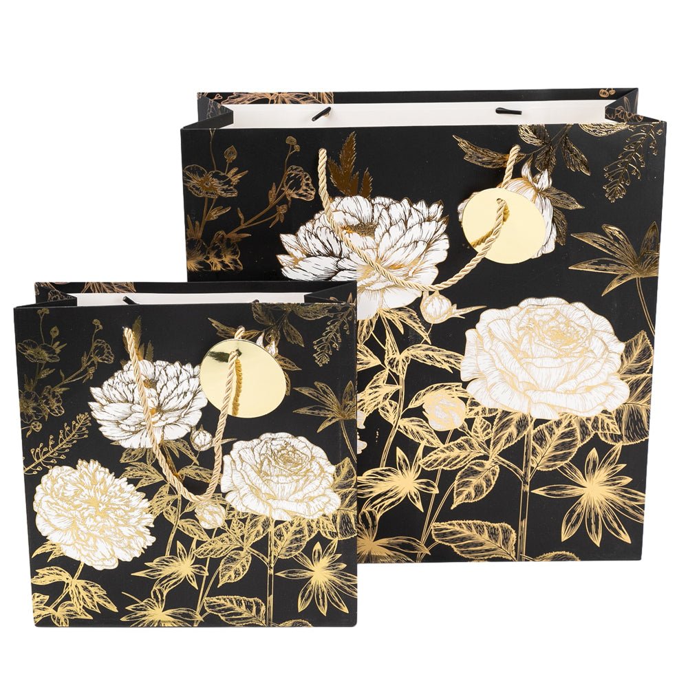 Aceste pungi de cadou excepționale transformă ambalajul într-o declarație de artă și lux. Pe un fundal negru profund, motivele florale și botanice, finisate cu folie metalică aurie și albă, prind viață, creând un contrast spectaculos.