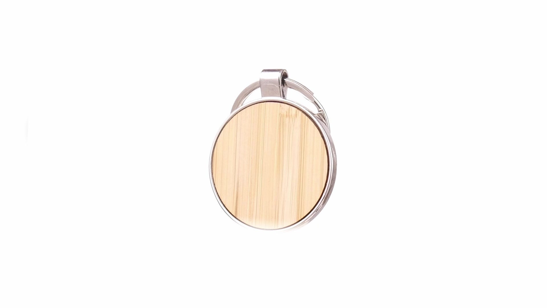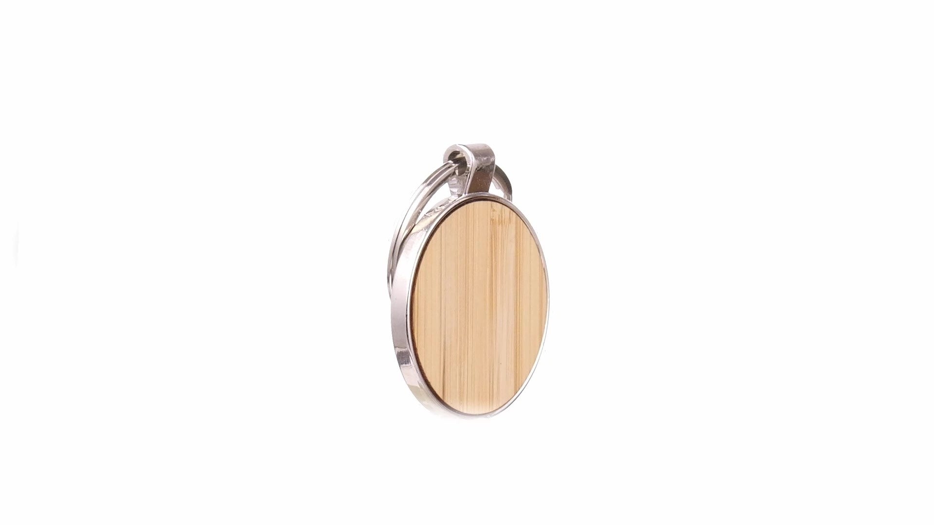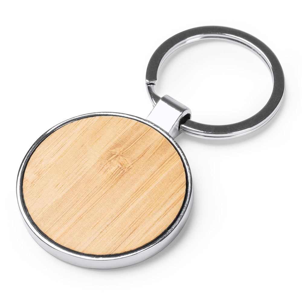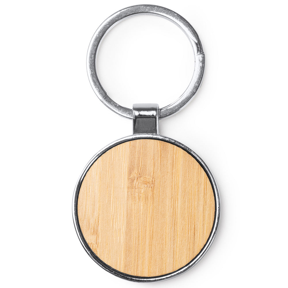 • Breloc metalic cu insertie de lemn de bambus in forma rotunda