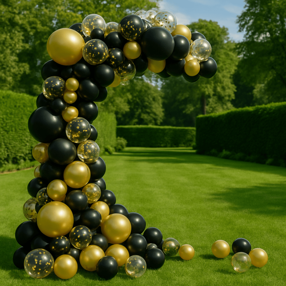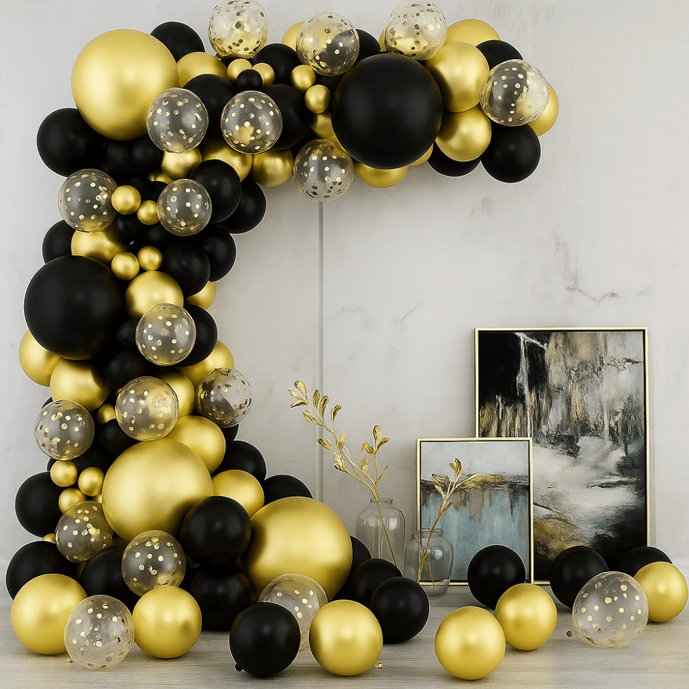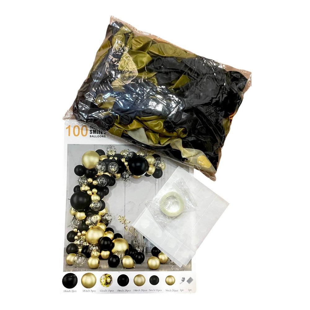 Set 100 baloane stil arcadă - model 8 negru și auriu. Acest set elegant și versatil de 100 de baloane este perfect pentru a crea o atmosferă festivă și memorabilă la orice eveniment. Cu o combinație rafinată de baloane negru și auriu, acest kit este ideal pentru a adăuga o notă de sofisticare și romantism decorului tău.