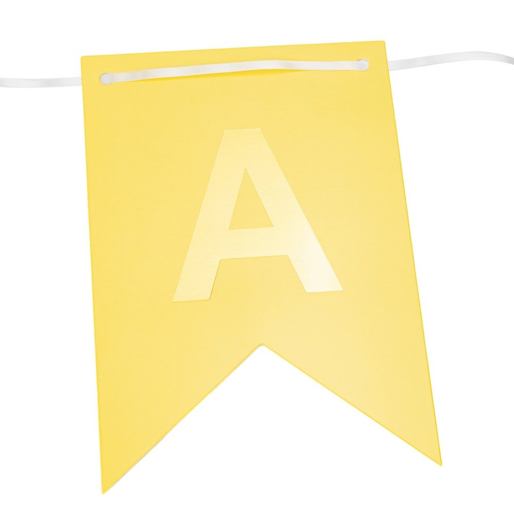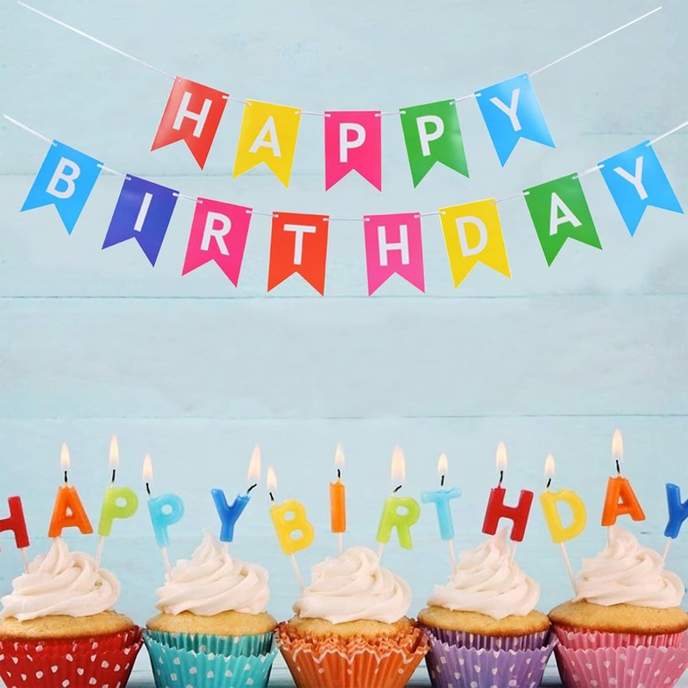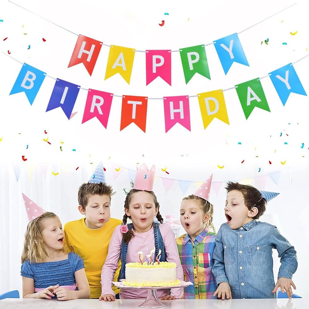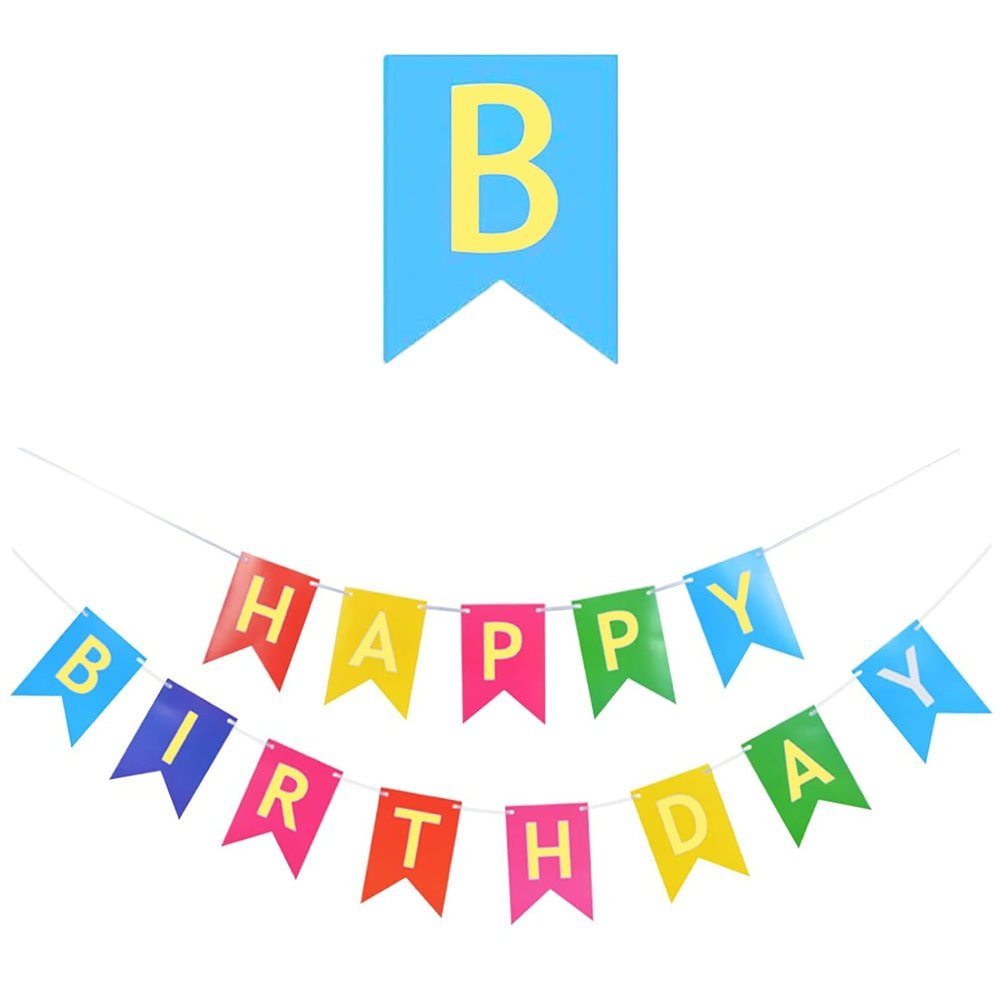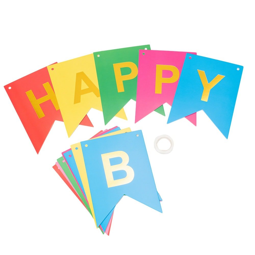 Ghirlandă hârtie cu litere pentru petrecere cu mesaj Happy Birthday - multicolor, constă în fâșii de hârtie în formă de fanion, fiecare purtând o literă aurie strălucitoare. Împreună, acestea formează mesajul "HAPPY BIRTHDAY", oferind o decorațiune festivă pentru orice sărbătoare de naștere.
