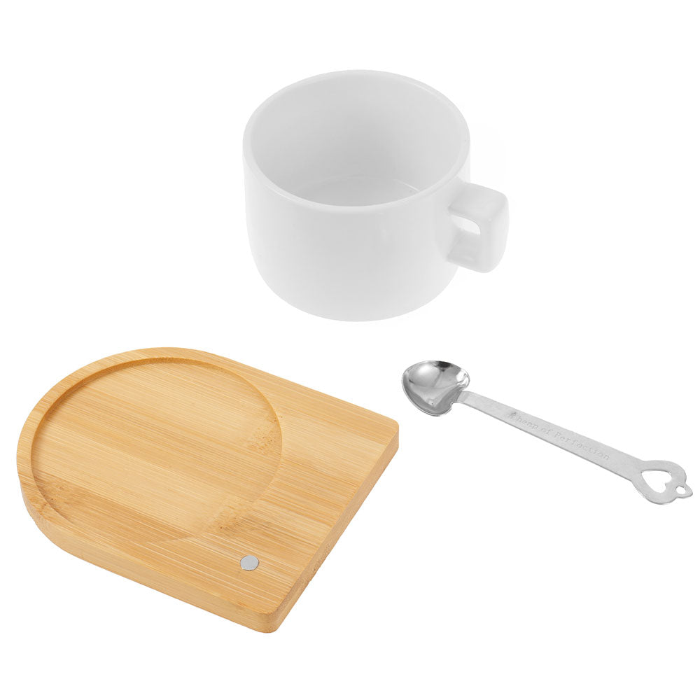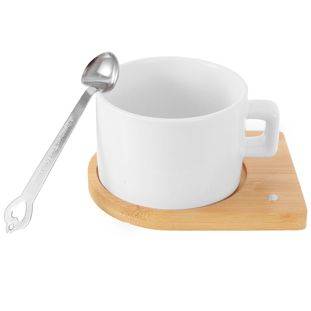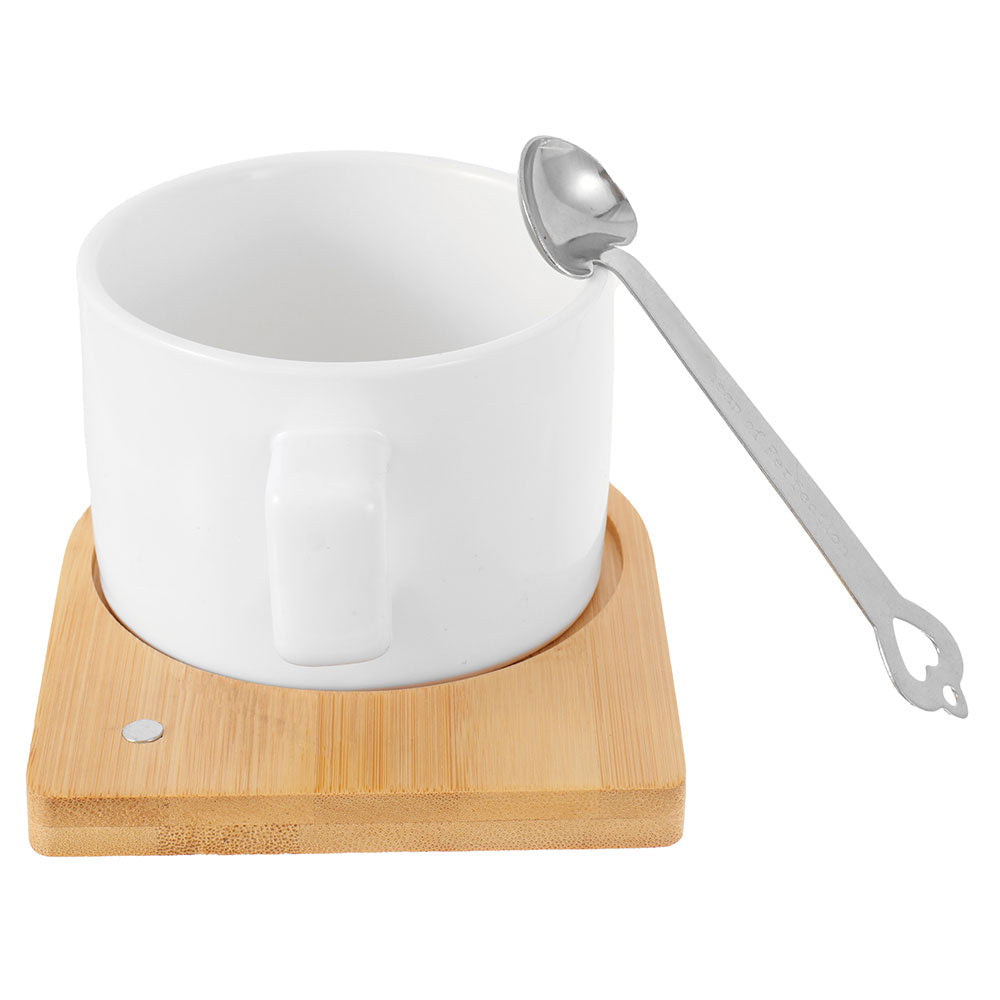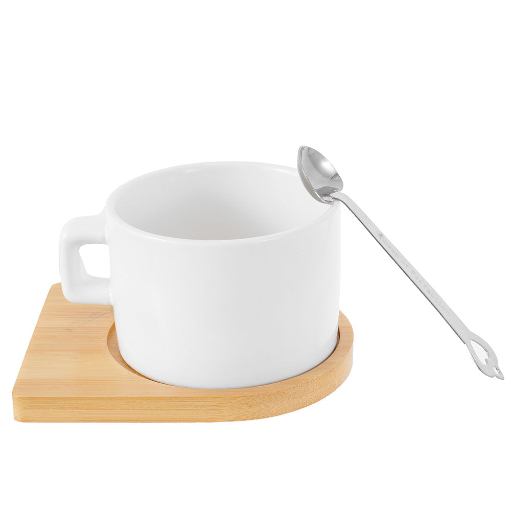 Set ce contine o ceasca ceramica alba, o lingurita din inox si un suport din lemn de bambus