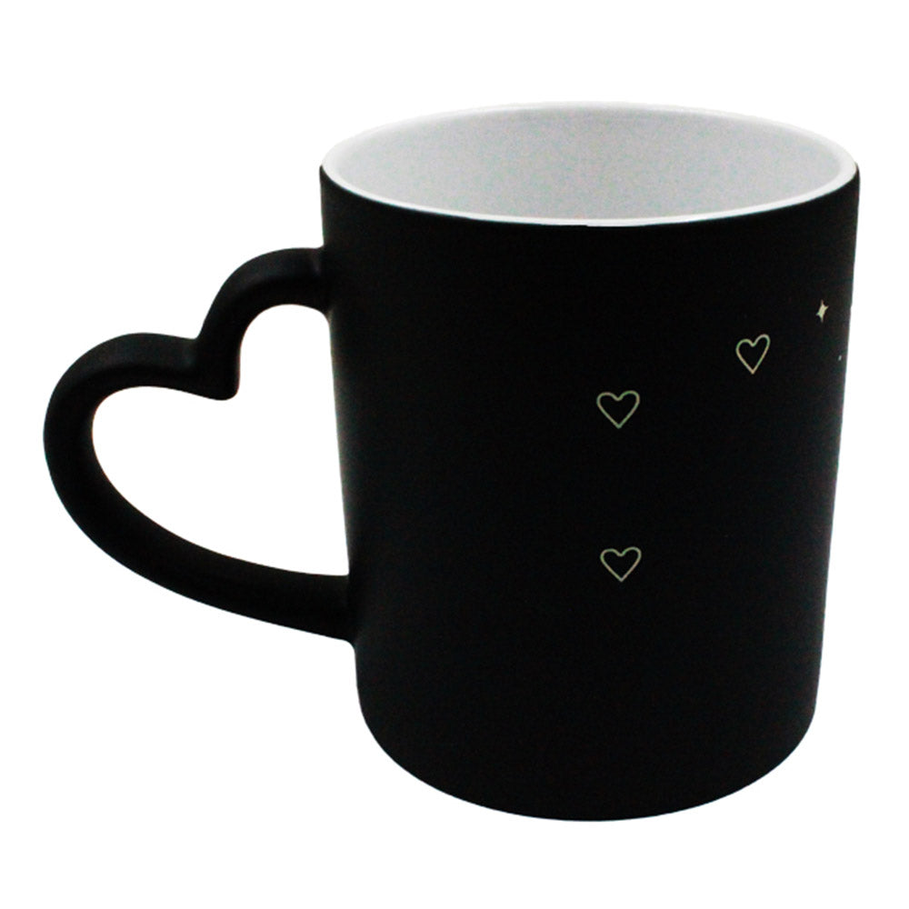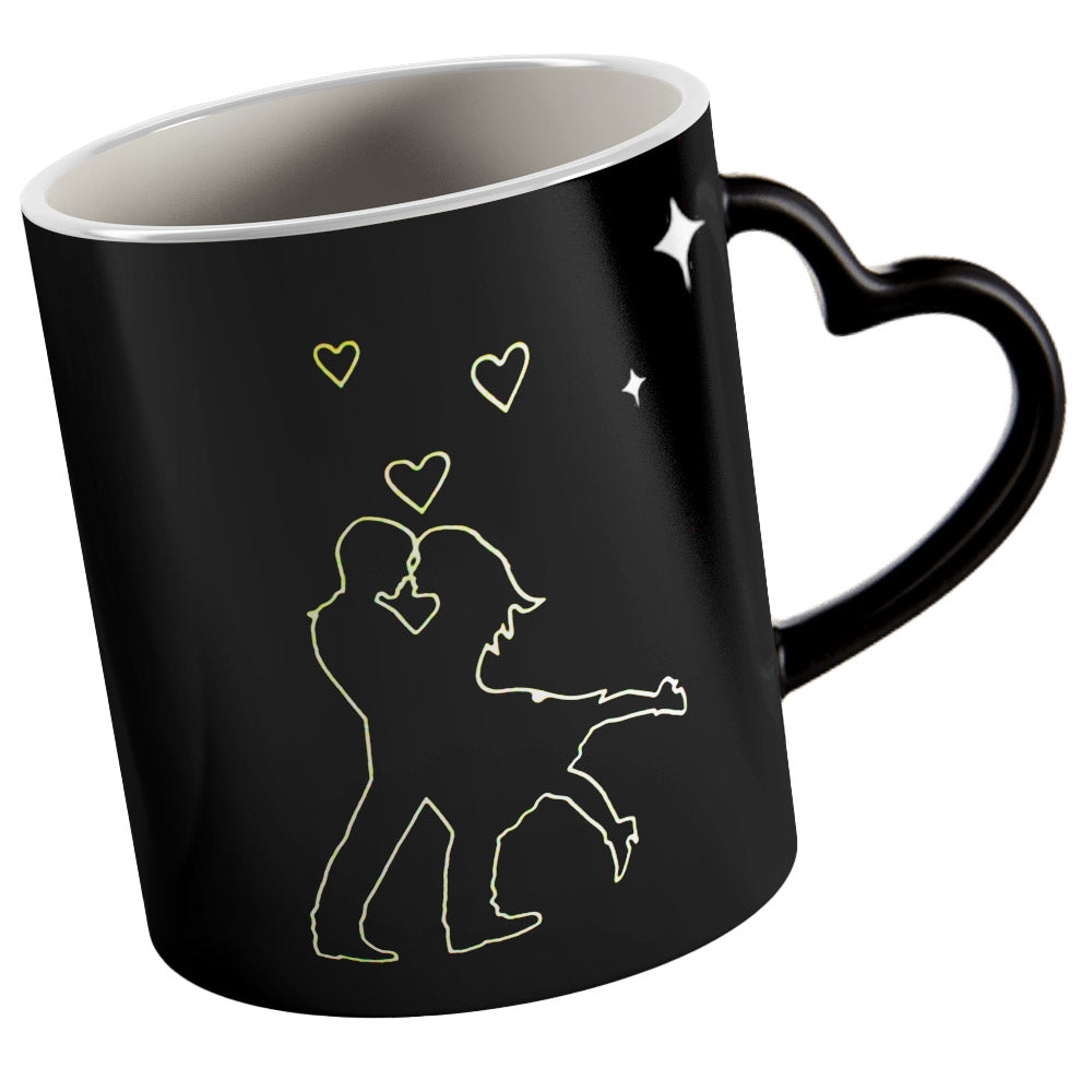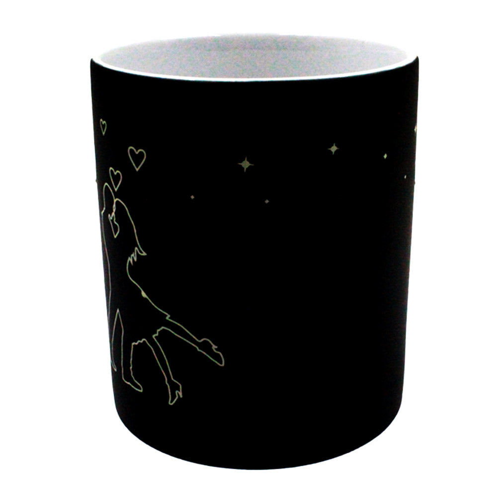 • In plus fata de canile termosensibile clasice aceasta cana este fabricata cu model de indragostiti pe partea exterioara a canii, model ce se confunda cu culoarea canii atunci cand este turnat lichid fierbinte in cana