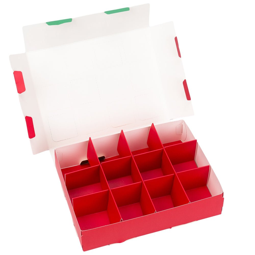 Cutia noastră de Crăciun, cu 12 compartimente individuale, este concepută pentru a transforma o selecție de bomboane, prăjituri sau mici cadouri într-un sortiment spectaculos. Fiecare compartiment este o mică surpriză, iar designul vesel al capacului aduce zâmbete încă de la prima vedere.