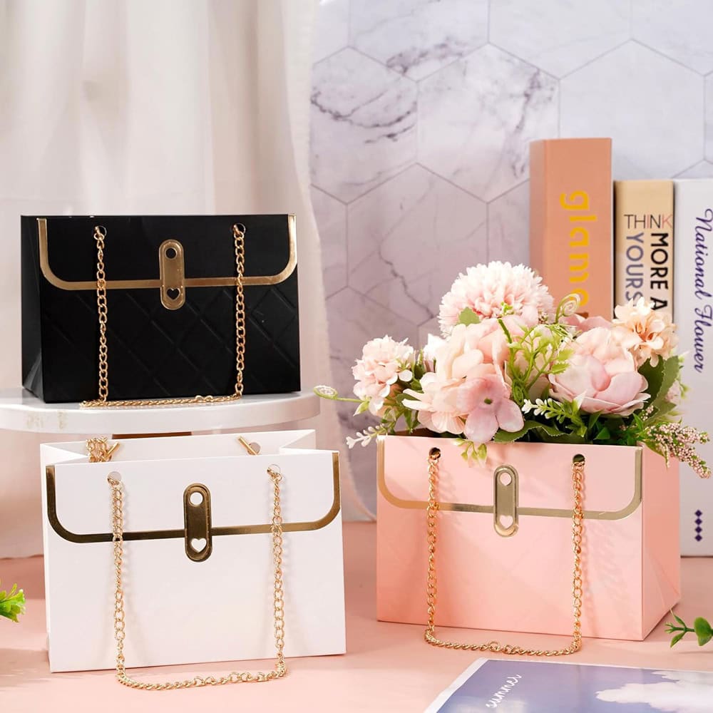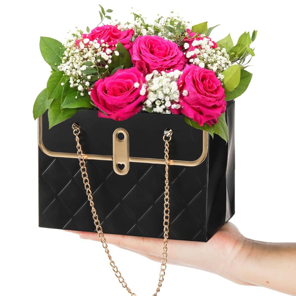 Gentuță model romburi cu lănțișor auriu - negru, inspirată de designul unei gentuțe, oferă o prezentare unică pentru aranjamentele florale. Acest recipient devine un accesoriu perfect pentru decorațiuni interioare și evenimente speciale.