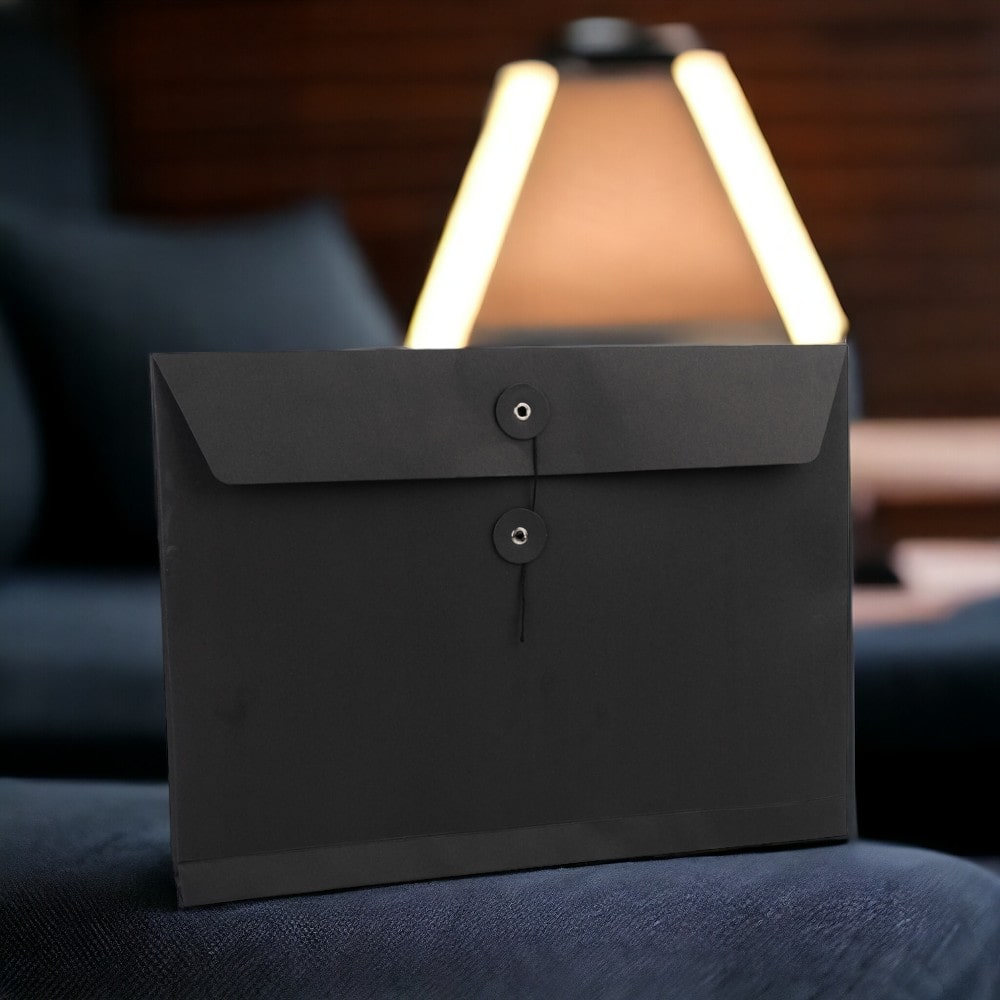 Plic hârtie cu sigiliu din sfoară - negru (set 10 buc), este un element esențial pentru corespondență, care oferă un aspect clasic și elegant pentru trimiteri importante.