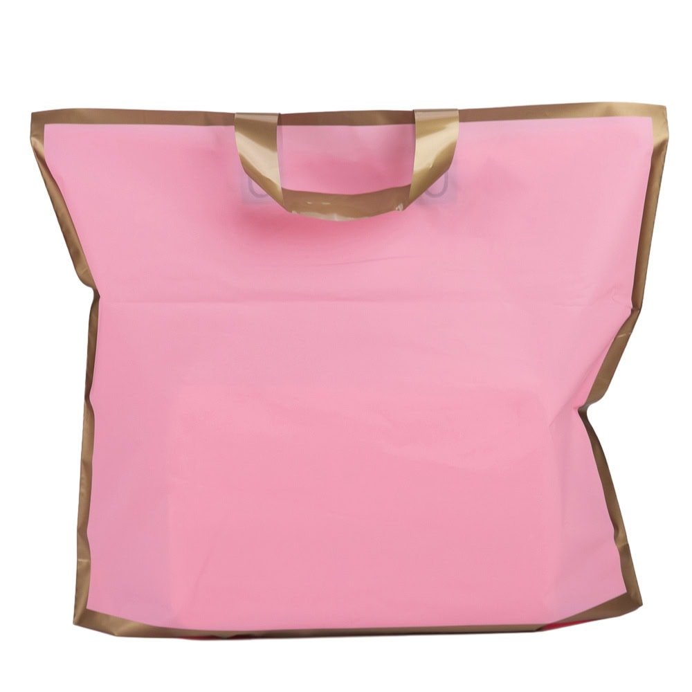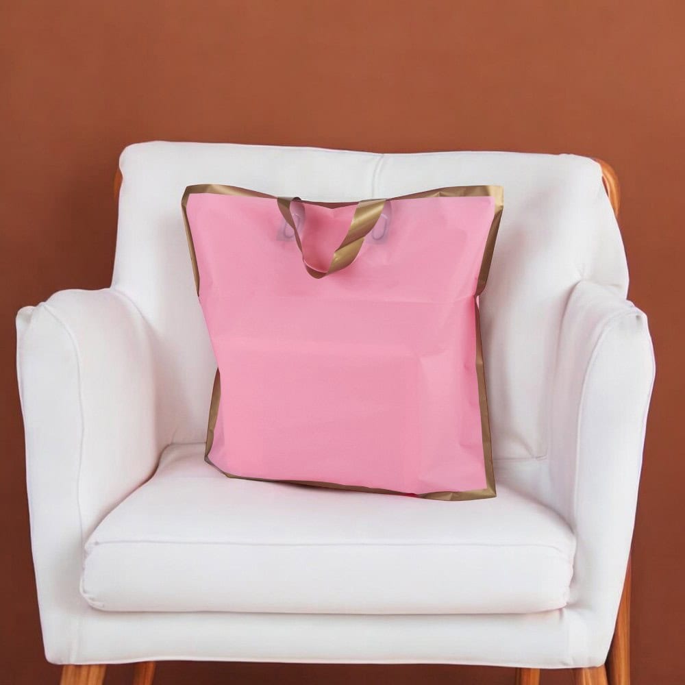 Pungi dreptunghiulare cu margini și mâner aurii - roz - Aceste pungi elegante și rezistente, în nuanțe de roz și auriu, aduc un plus de rafinament oricărui obiect pe care îl conțin. Combinația dintre culoarea roz și strălucirea auriului le face ideale pentru o gamă variată de utilizări.