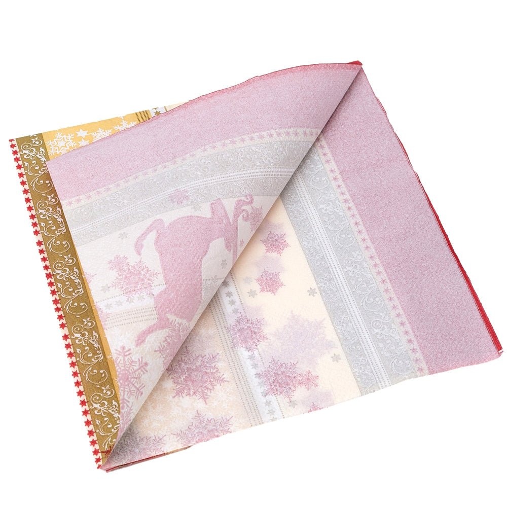 Îmbrățișați farmecul tradițional al sărbătorilor cu aceste șervețele bogat ornamentate. Designul lor complex, ce îmbină elegant silueta unui ren cu fulgi de nea delicați pe un fundal festiv în tonuri de roșu și auriu, va aduce un plus de căldură și eleganță oricărei mese de Crăciun.