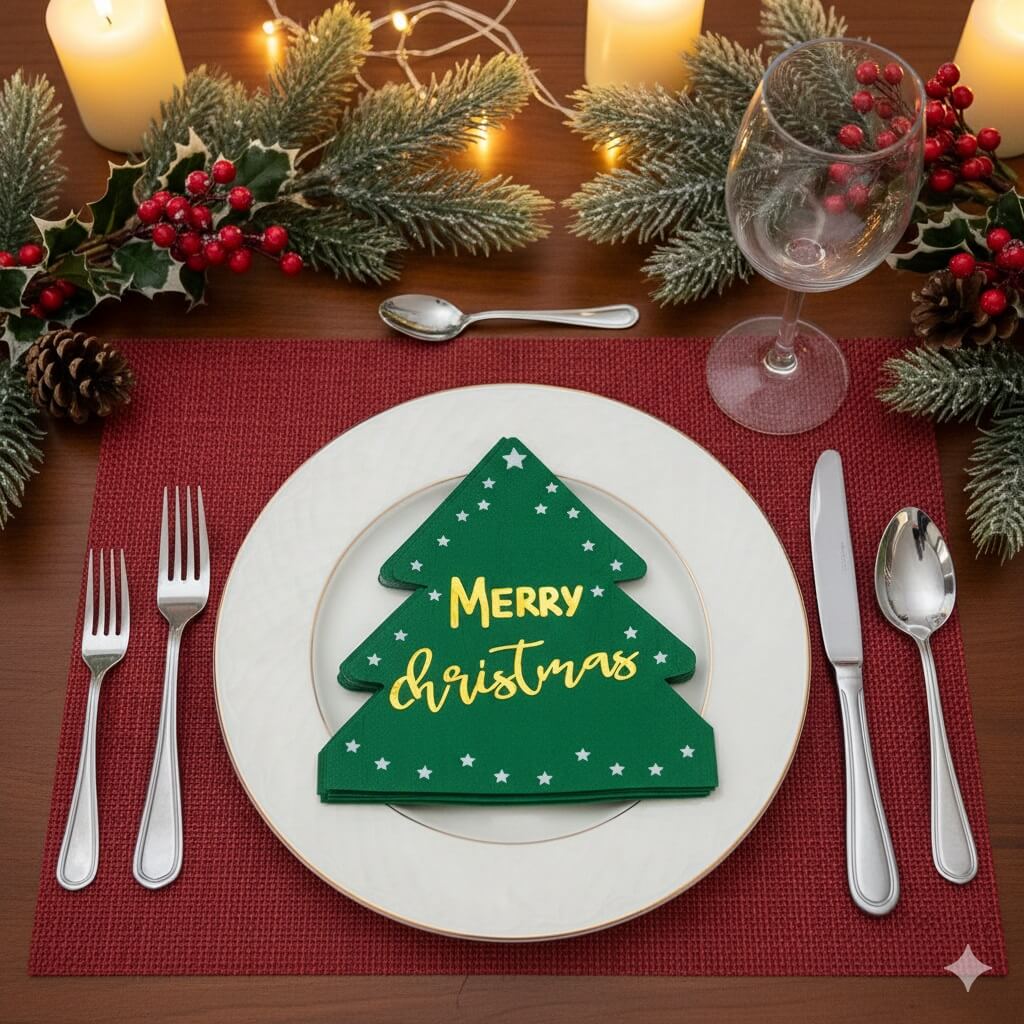 Creați un decor de masă cu adevărat memorabil cu aceste șervețele spectaculoase, decupate în formă de brad de Crăciun. Designul lor unic, accentuat de mesajul auriu strălucitor "Merry Christmas" și de steluțele delicate, va transforma orice masă festivă într-o mică scenă de poveste, impresionându-vă cu siguranță invitații.