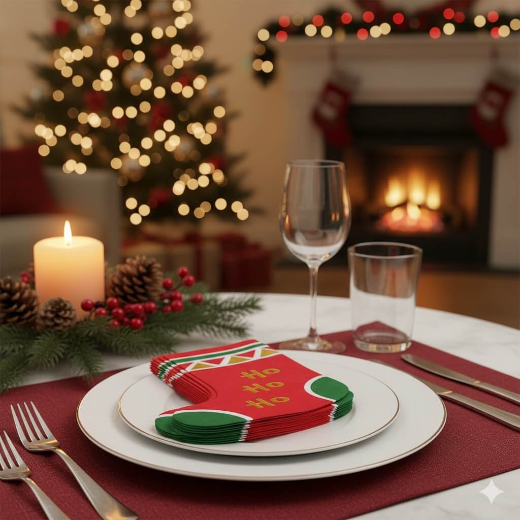 Adăugați un zâmbet și o notă de originalitate mesei de sărbători cu aceste șervețele amuzante, decupate în formă de cizmă de Moș Crăciun. Culorile vibrante și detaliile aurii strălucitoare le transformă în piesa de rezistență a petrecerii, fiind garantat un punct de atracție pentru invitații de toate vârstele.