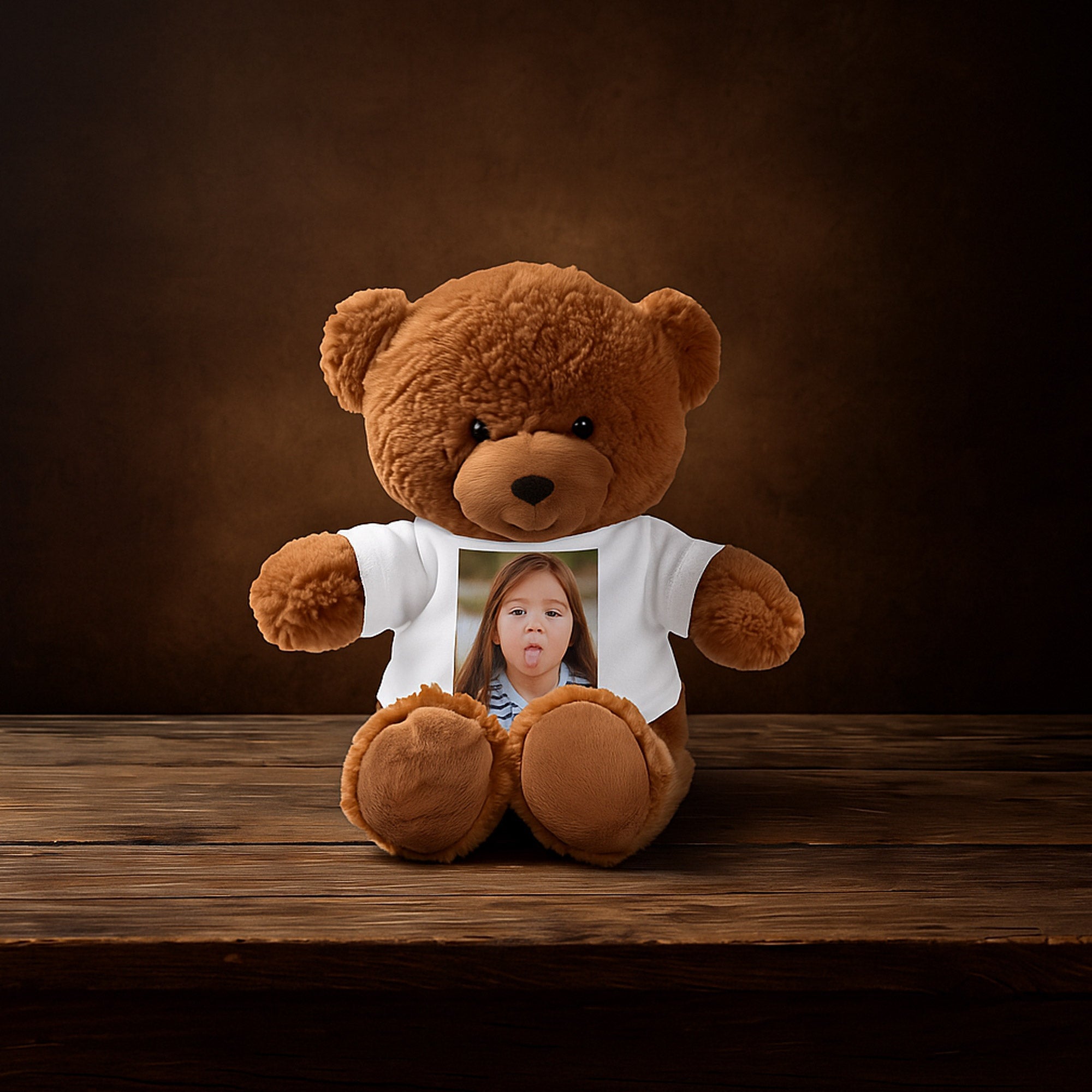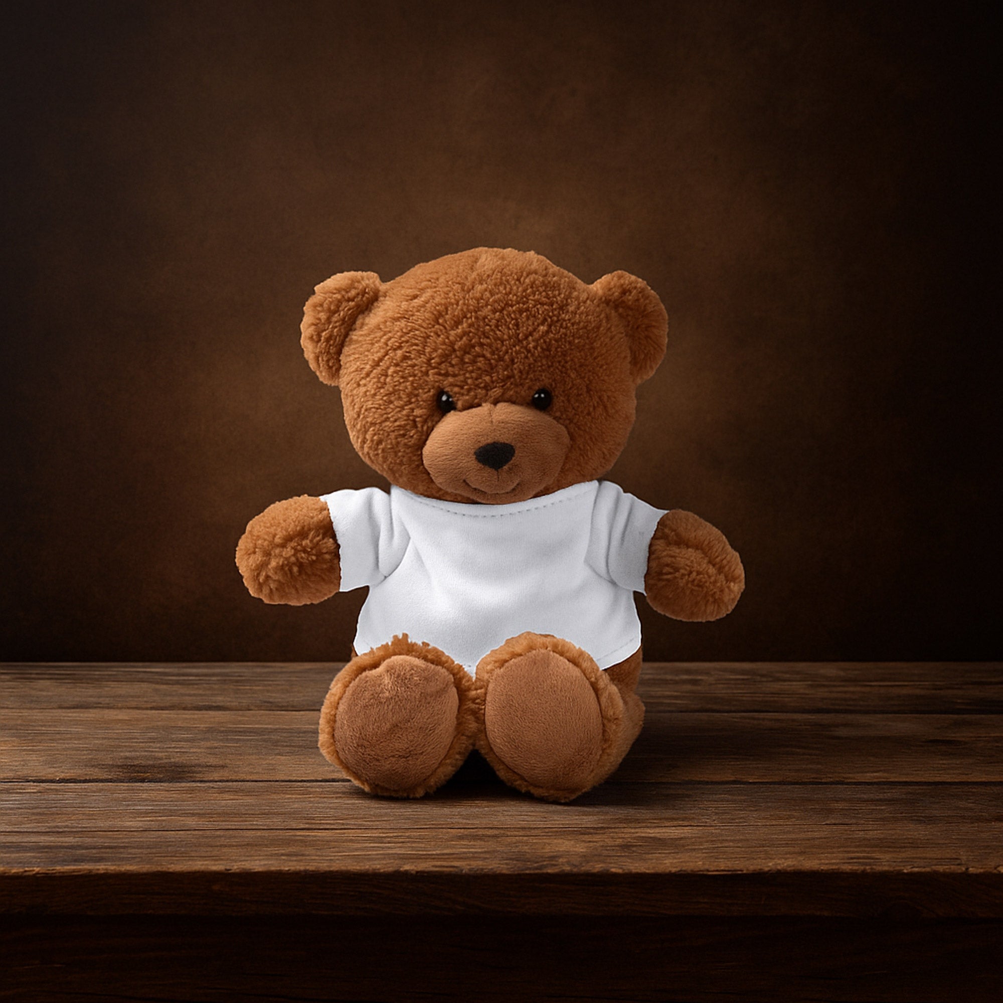 Ursulet din plus moale si prietenos, echipat cu un tricou alb din poliester special conceput pentru personalizare prin sublimare. Perfect pentru cadouri personalizate, materiale promotionale sau suveniruri emotionale.