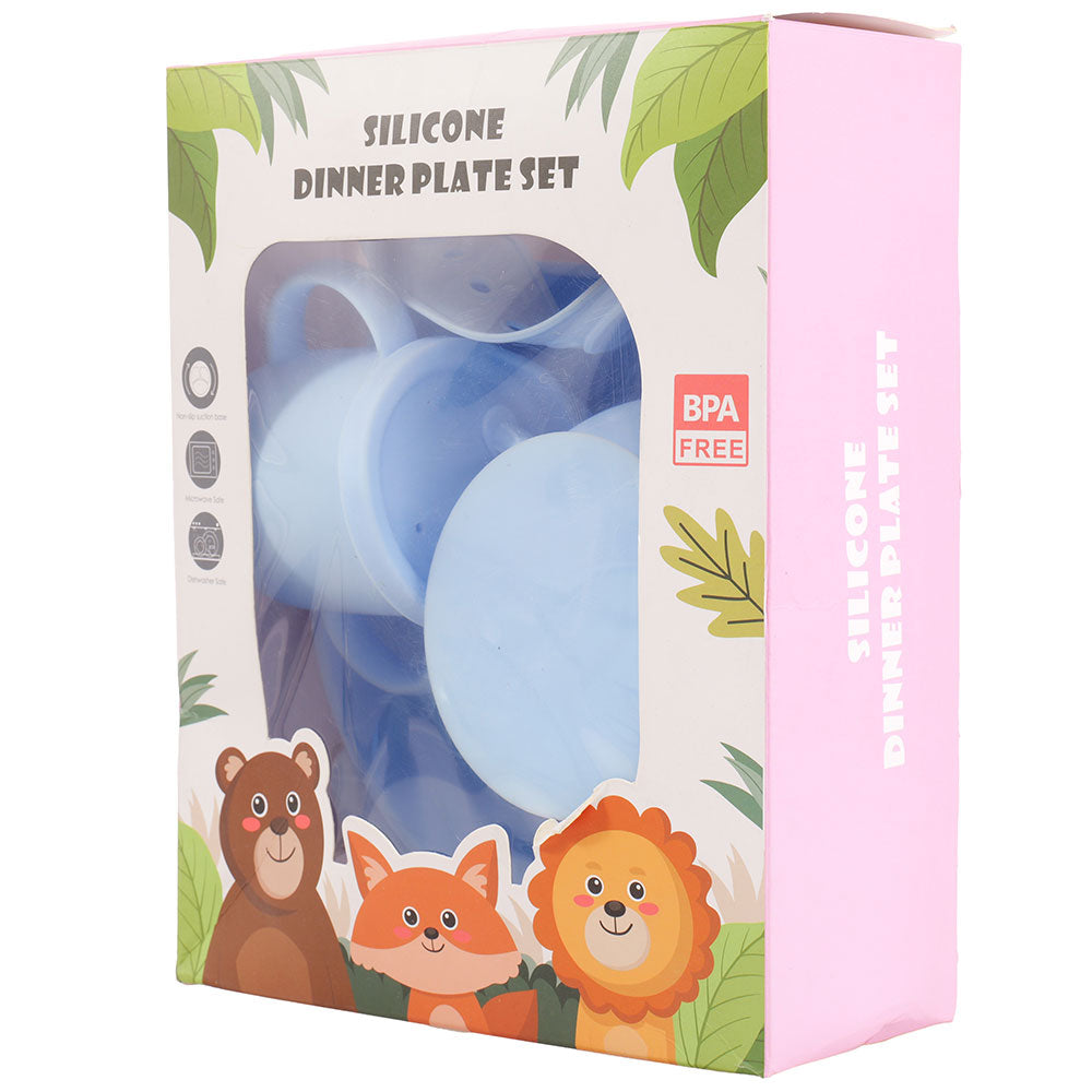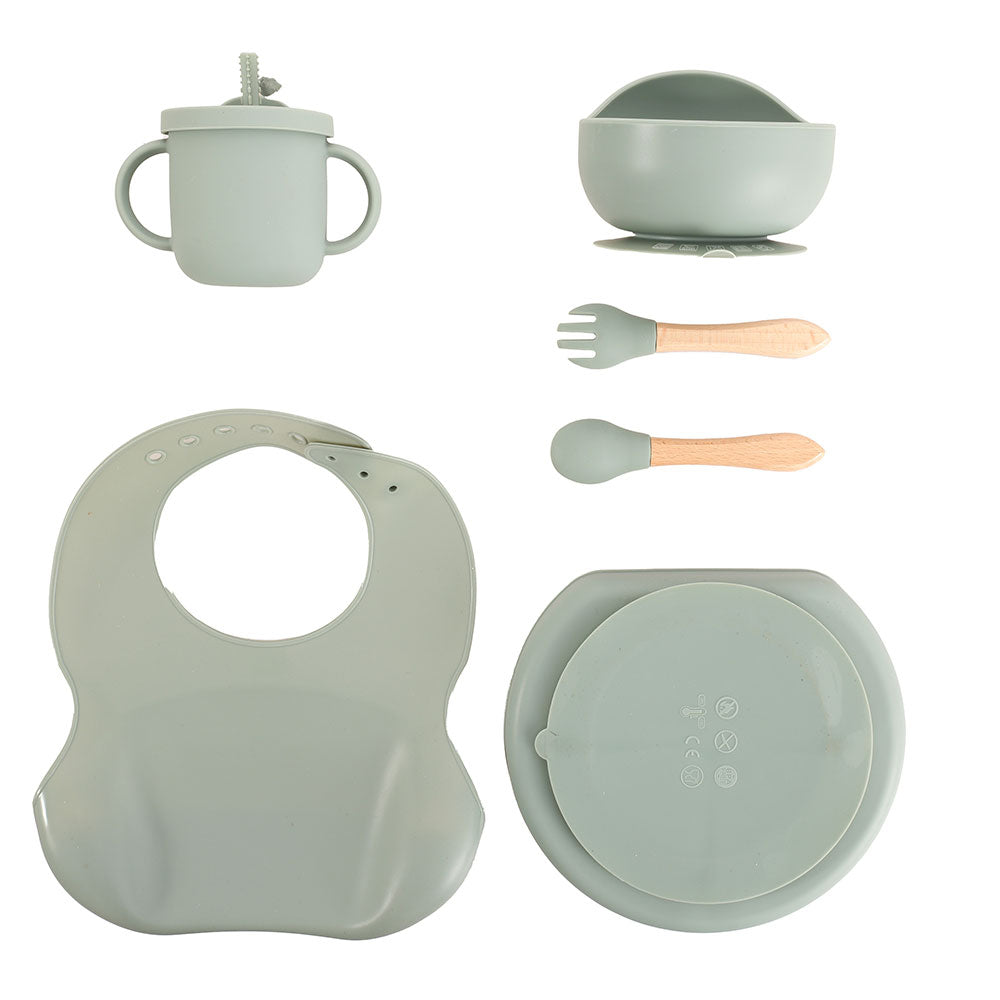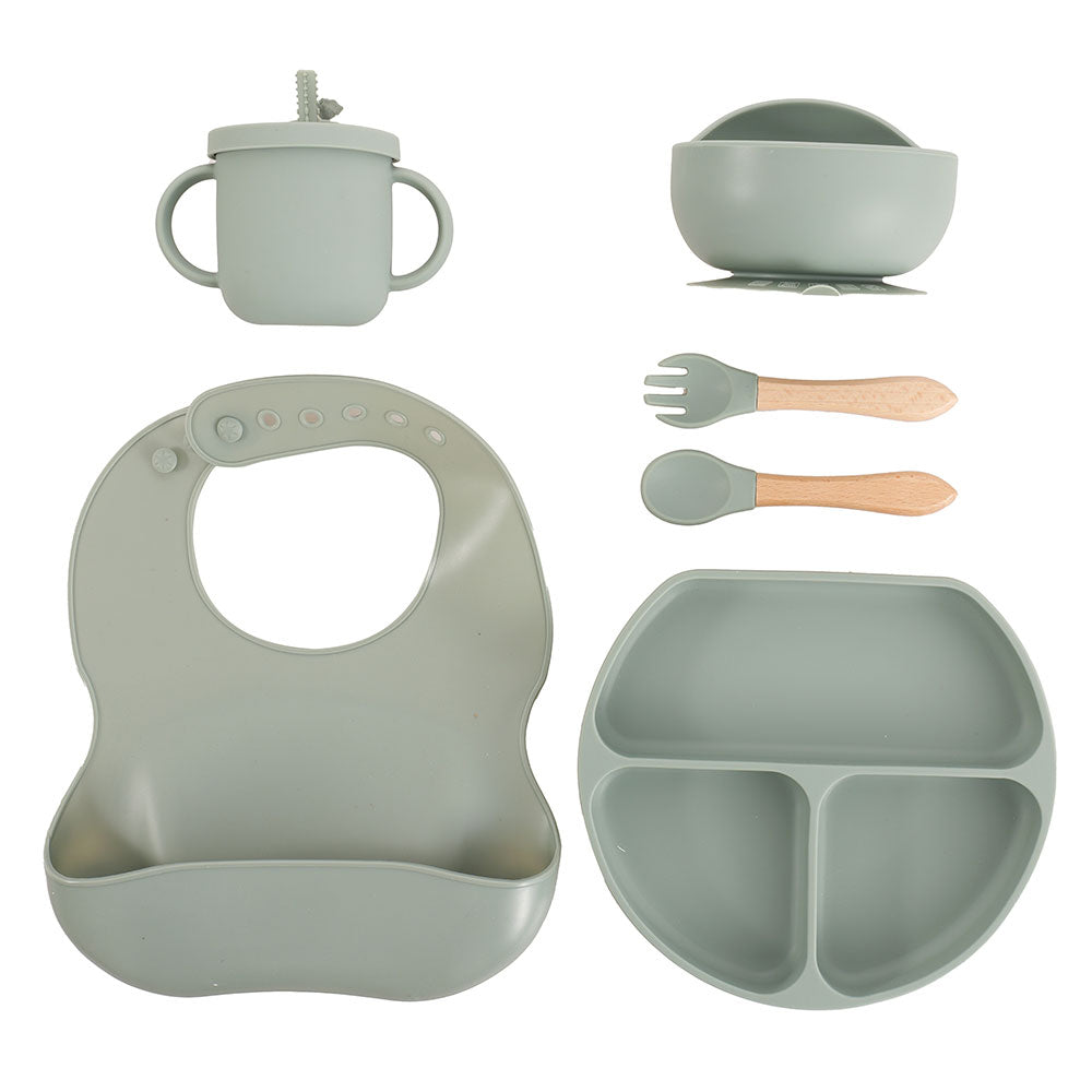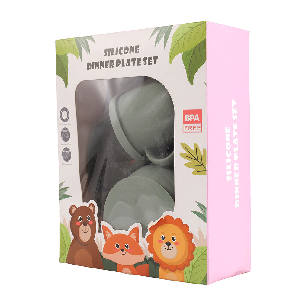 • Contine 6 piese: farfurie cu compartimente, bol, lingura, furculita, cana si babetica, toate realizate din silicon moale si sigur
