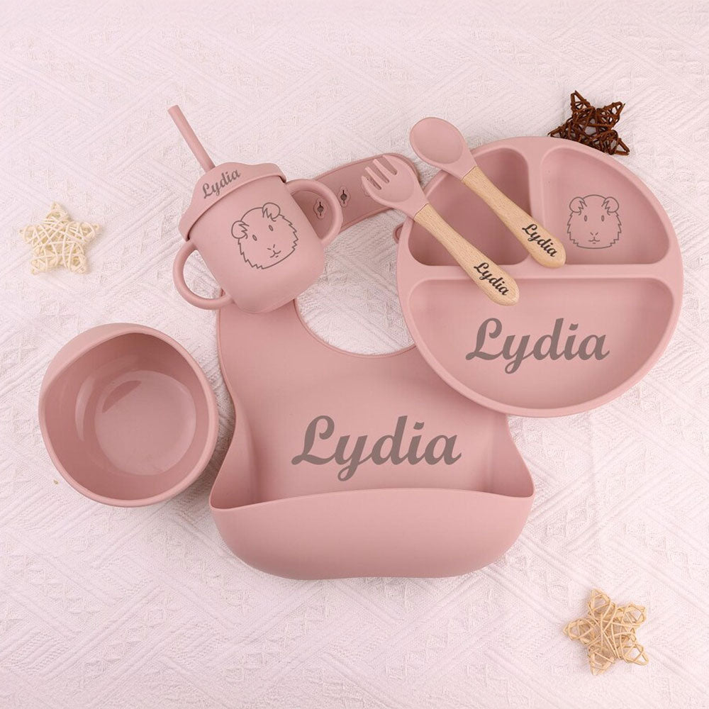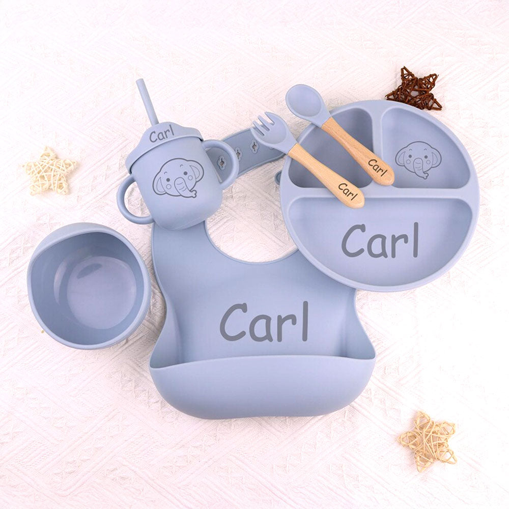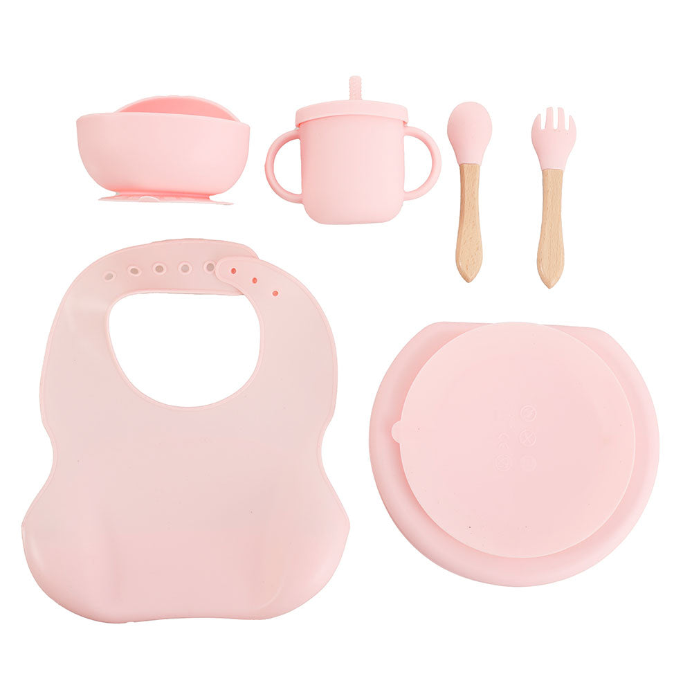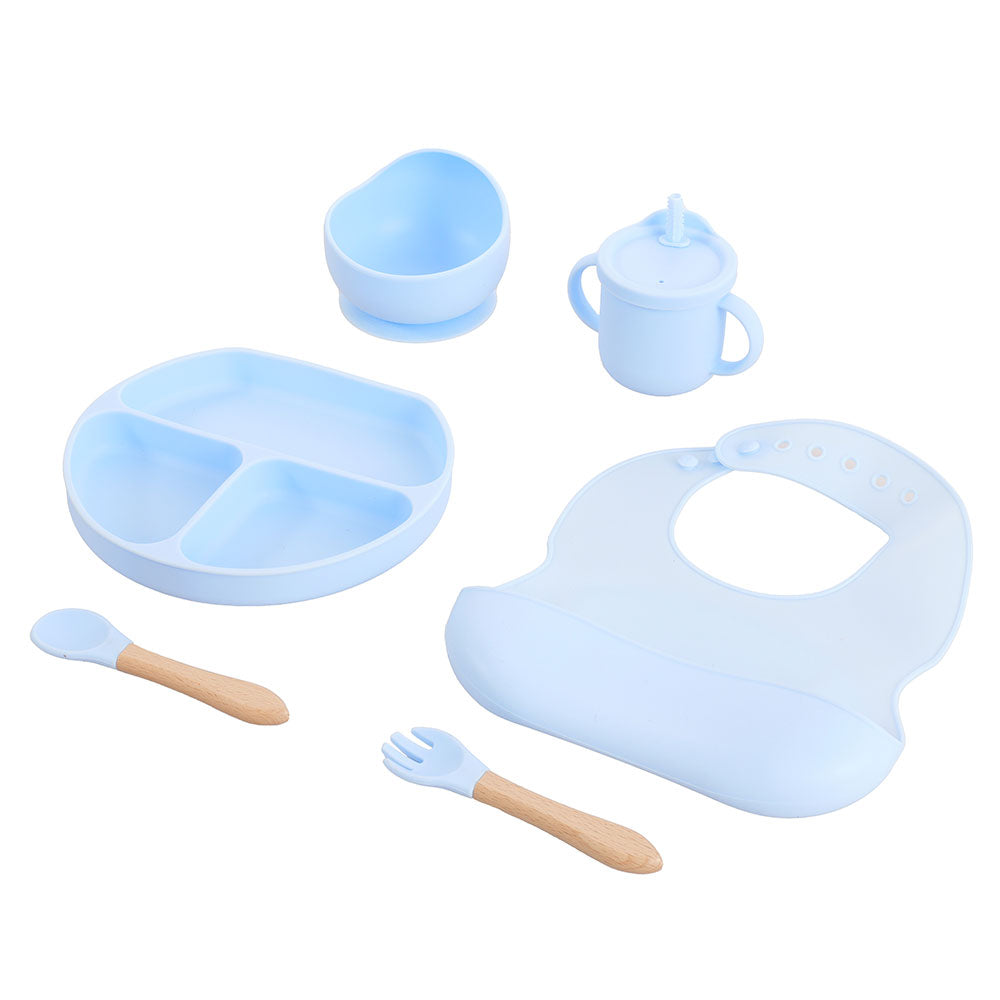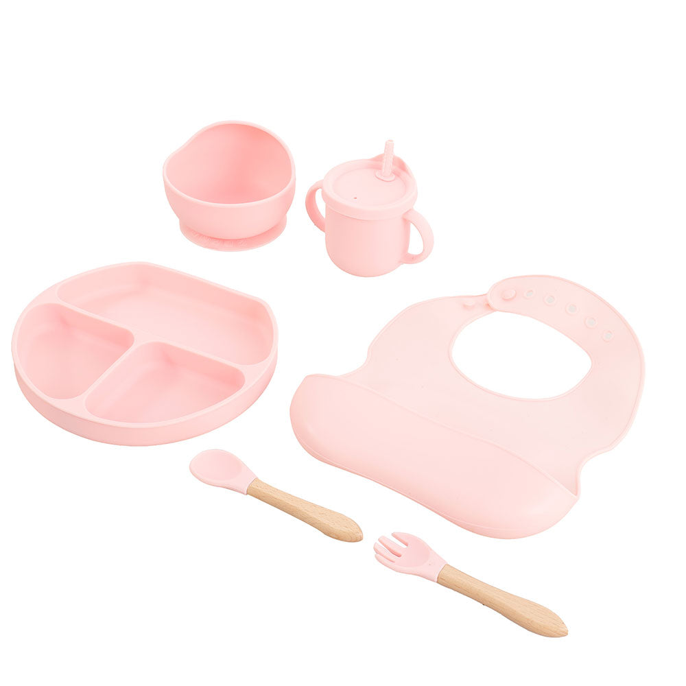 • Contine 6 piese: farfurie cu compartimente, bol, lingura, furculita, cana si babetica, toate realizate din silicon moale si sigur