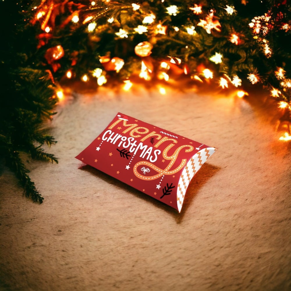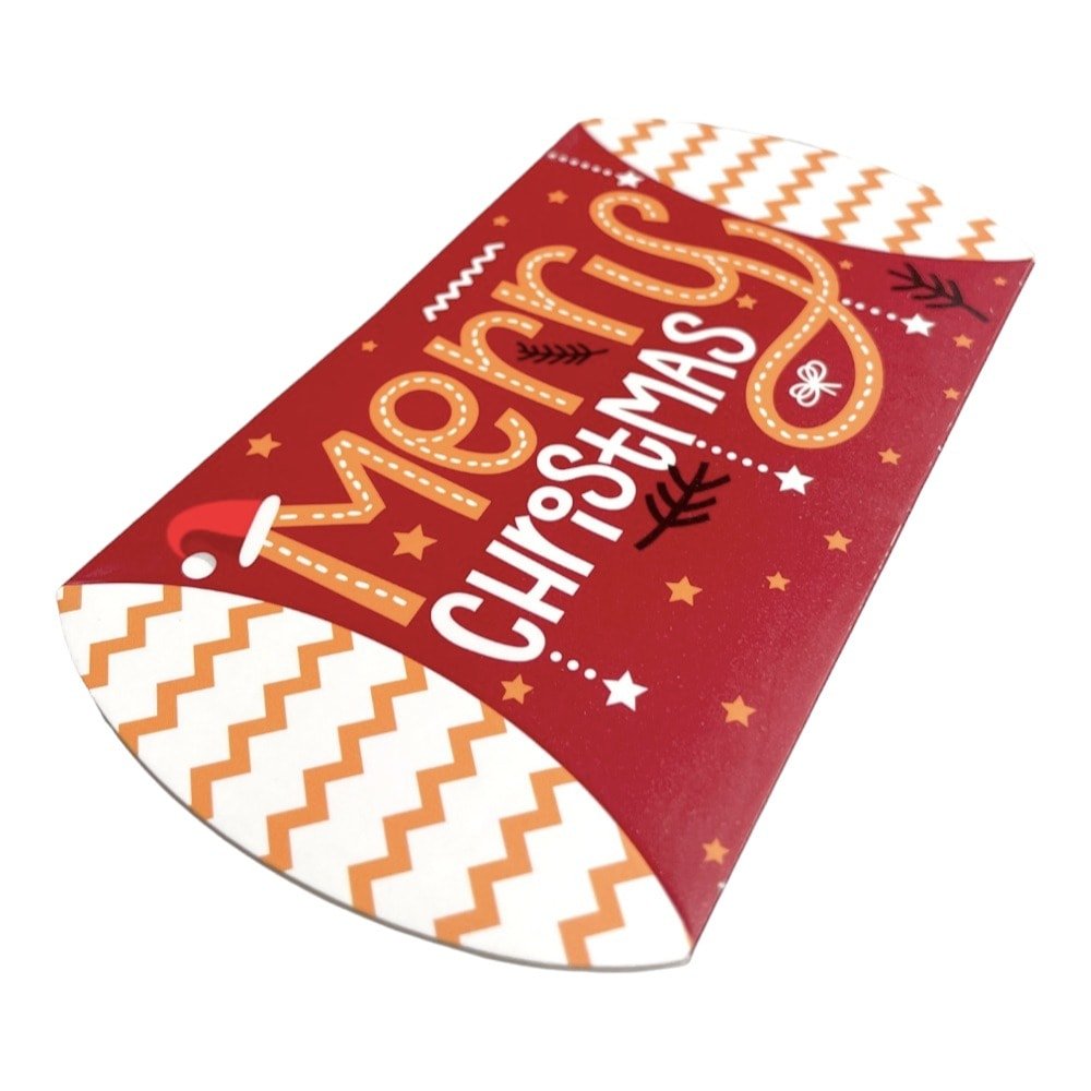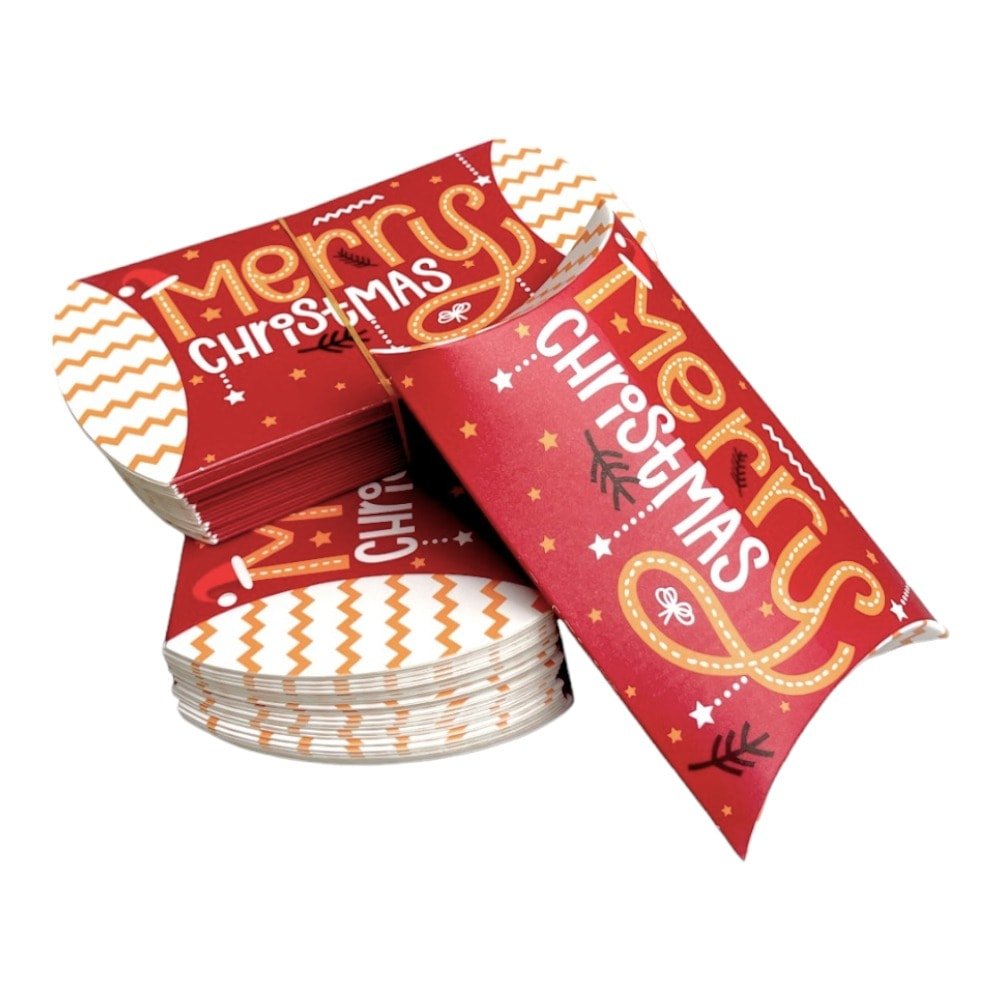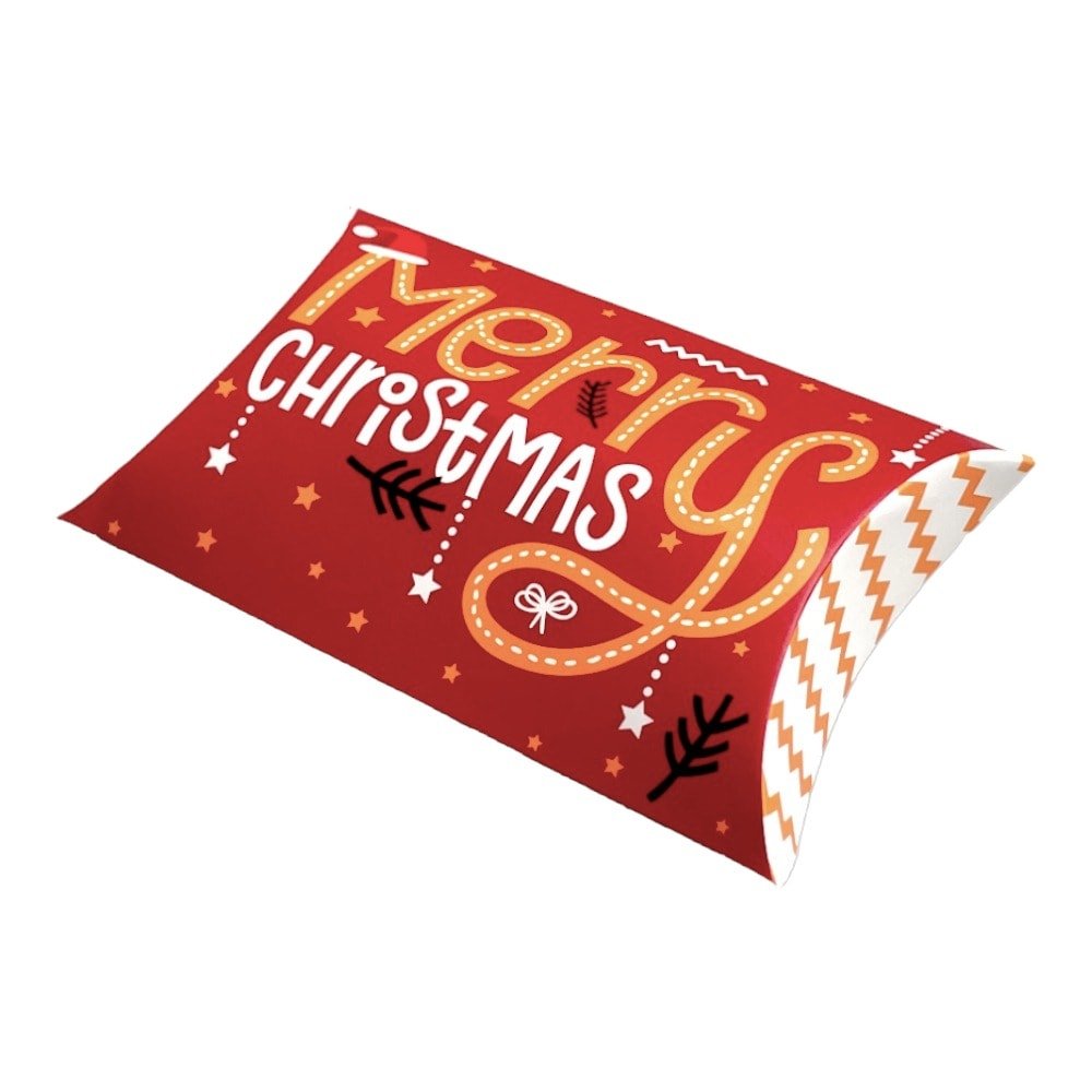 Cutie Crăciun în formă de pernă - model 2 Crăciun Fericit (set 50 buc) 12x7.2x2.5cm este o alegere perfectă pentru ambalarea cadourilor de sărbători. Cu