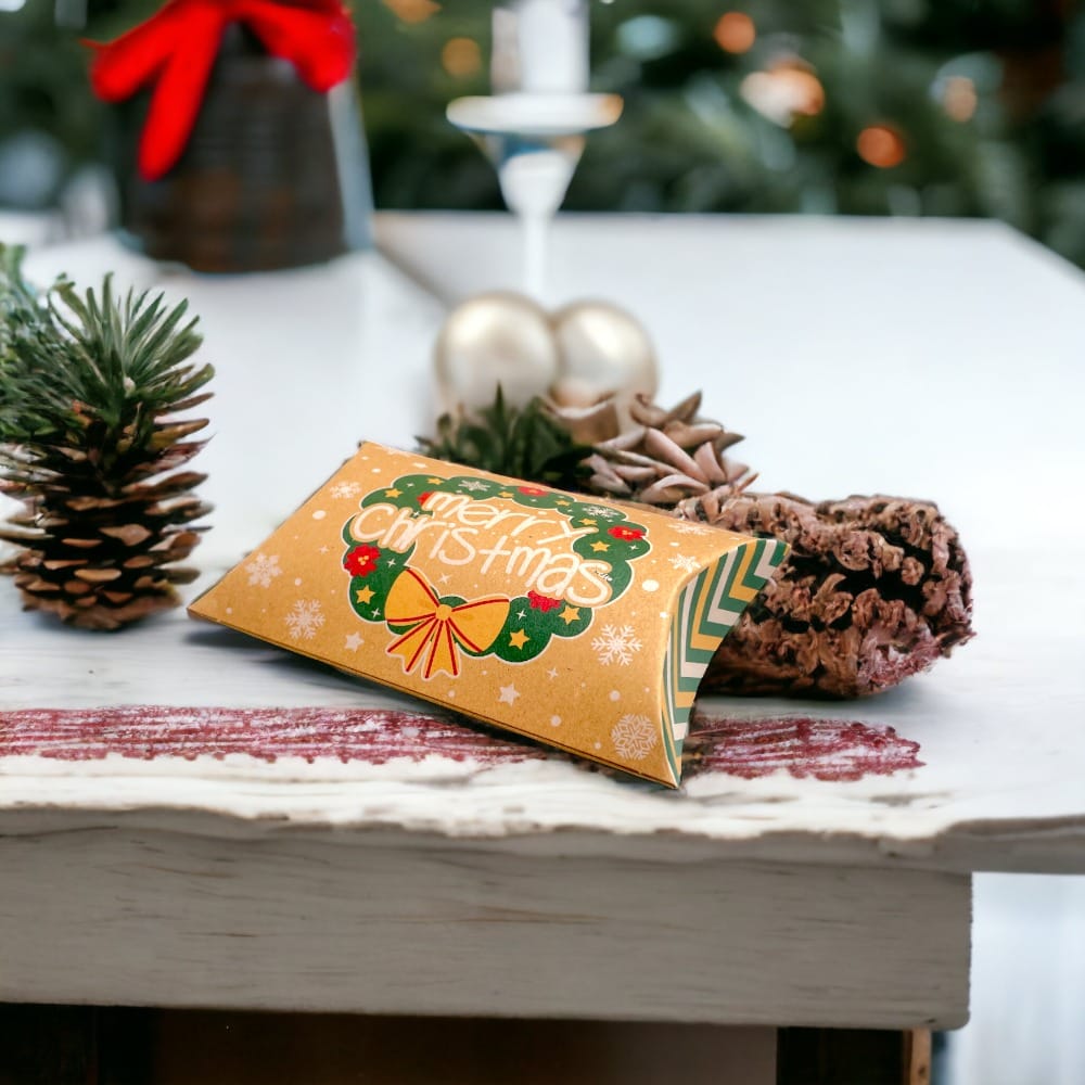 Cutie Crăciun kraft în formă de pernă - model 4 coroniță (set 50 buc) 12x7.2x2.5cm este o alegere perfectă pentru ambalarea cadourilor de sărbători. Cu setul de