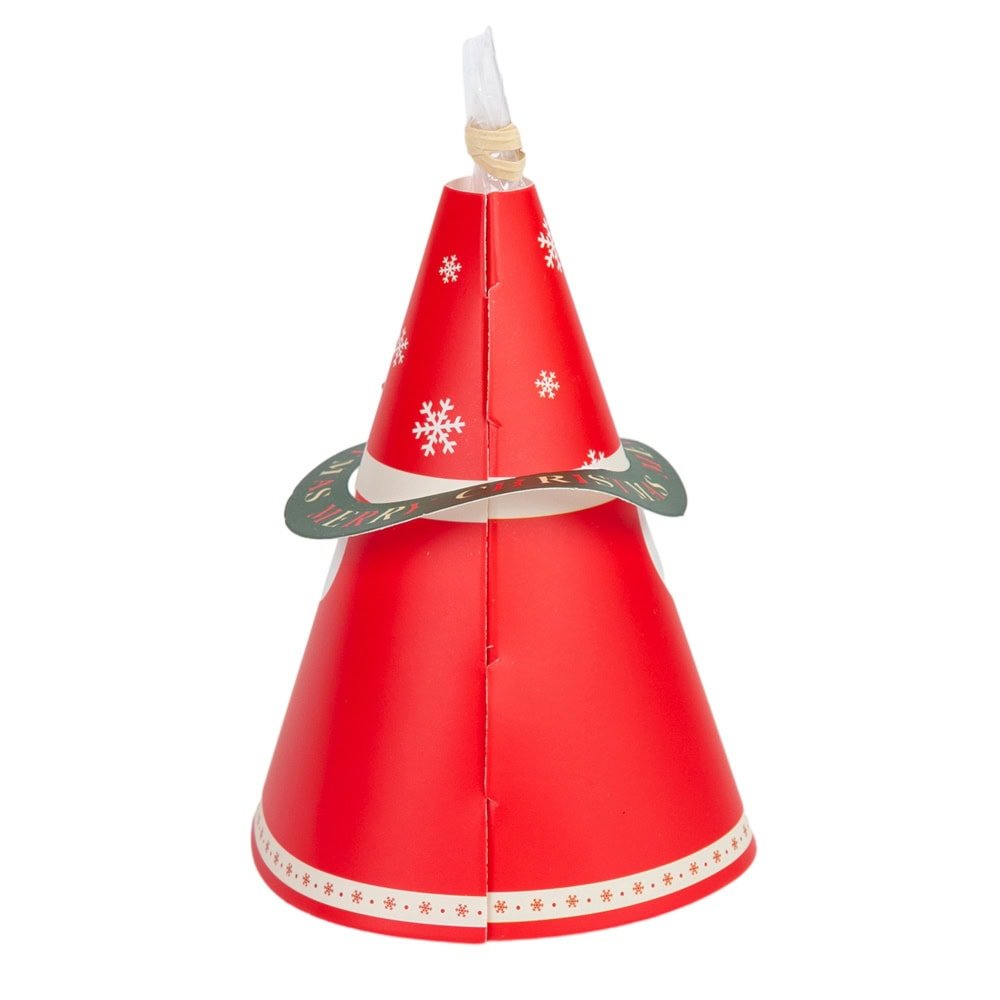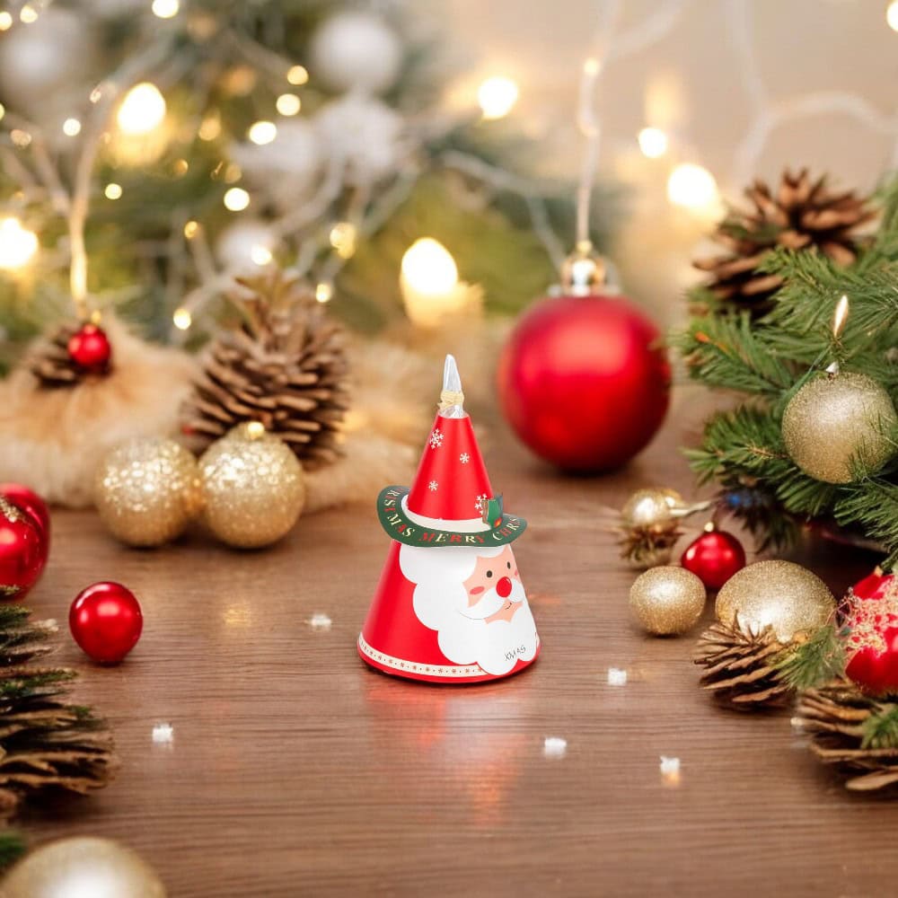 • Cutiile au forma iconică a unei pălării de Crăciun, cu modele clasice precum Moș Crăciun și reni, adăugând o notă de magie sărbătorilor.