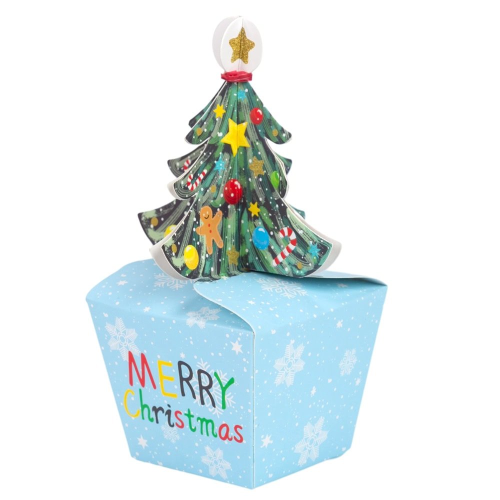 Cutie mică cu brad 3D și mesaj Crăciun fericit - bleu (set 50 buc)