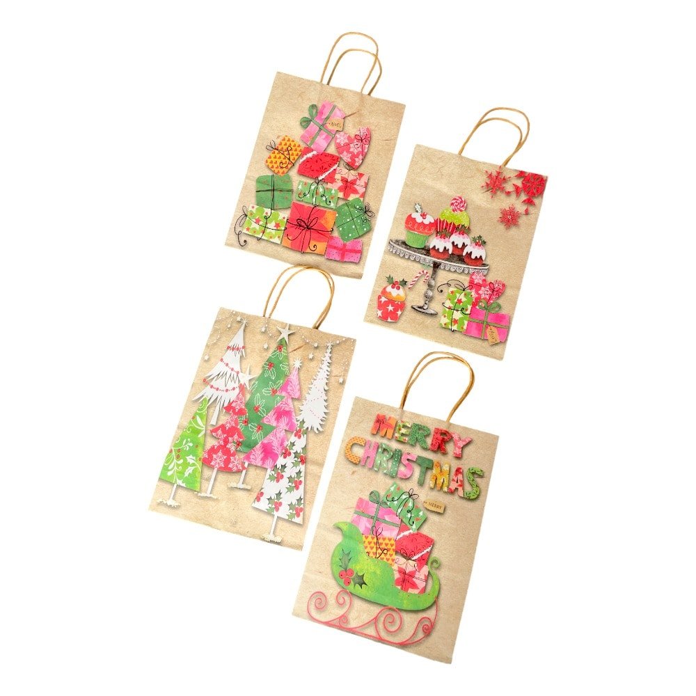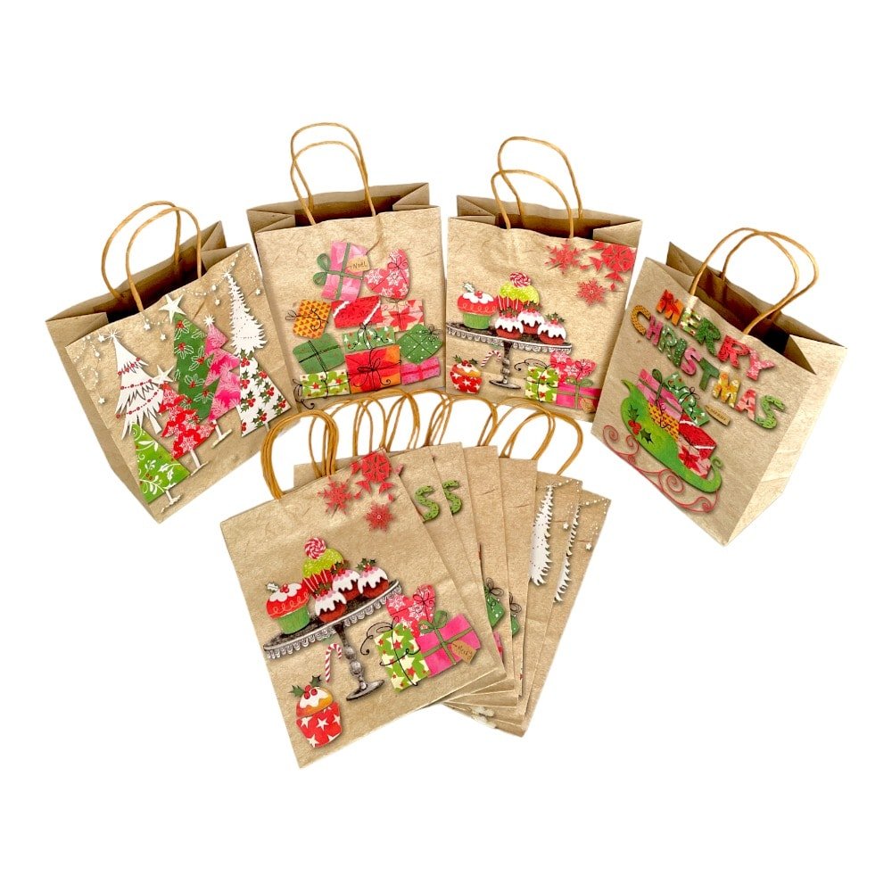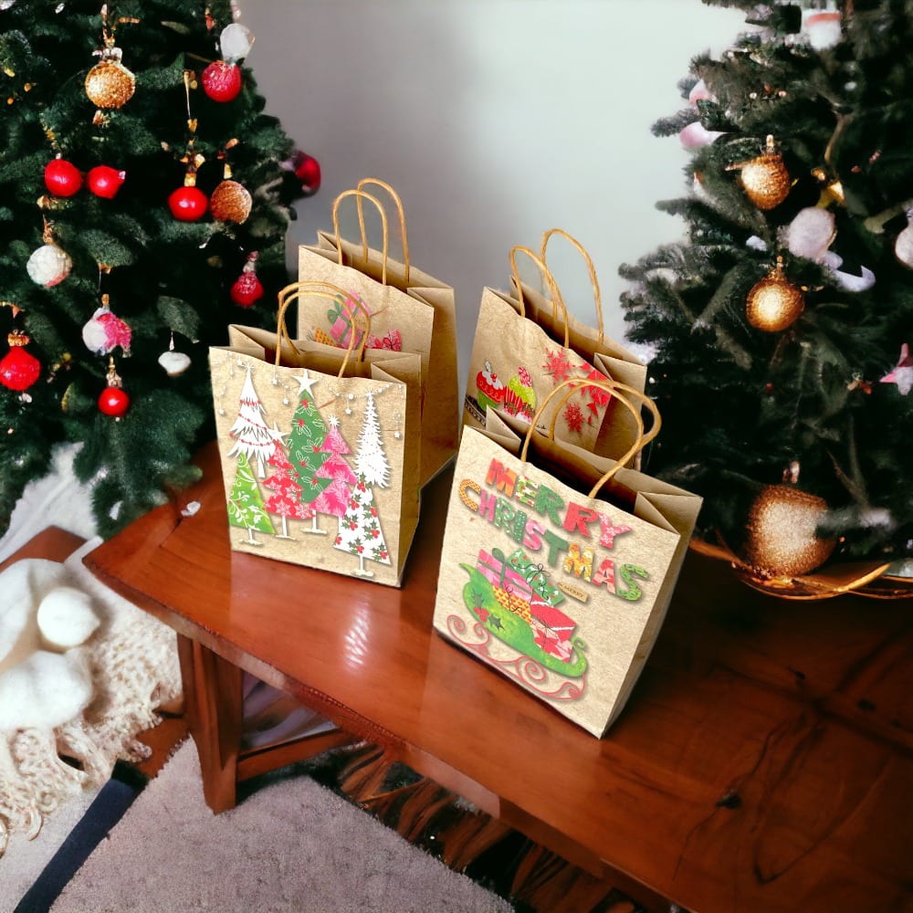 Pungi cadou Crăciun hârtie kraft mix 4 modele - model 7 Cadourile Moșului (set 12 buc) aduc căldura Crăciunului în ambalajele tale.