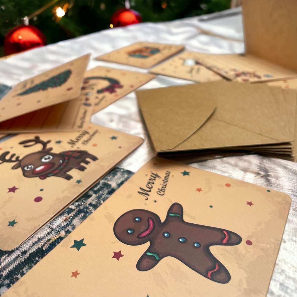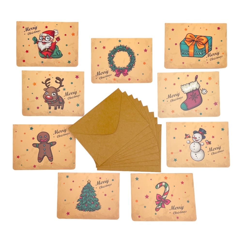 Set 9 felicitări de Crăciun - kraft 8.5x11.5cm adaugă un farmec rustic și cald sărbătorilor tale de iarnă.