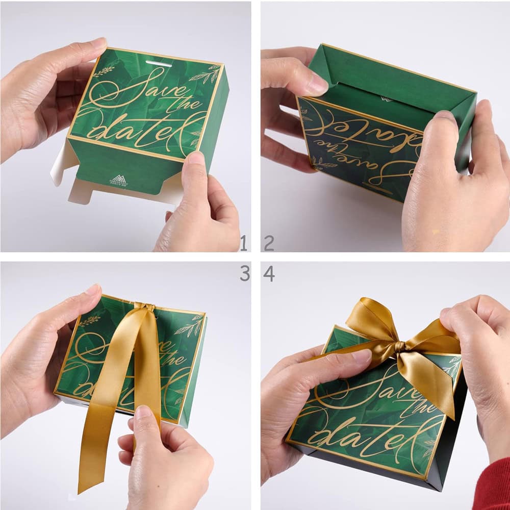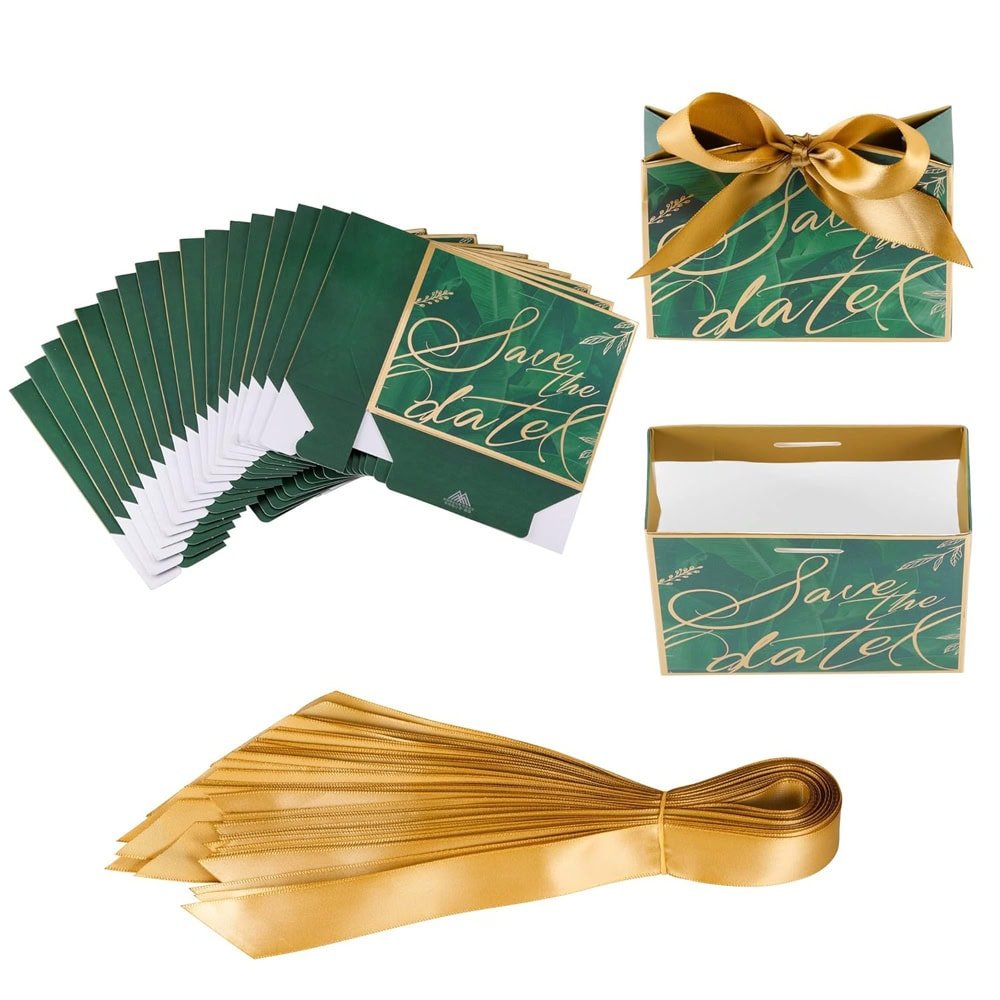 Cutie cu fundă satinată și mesaj Save the date - verde (set 50 buc)