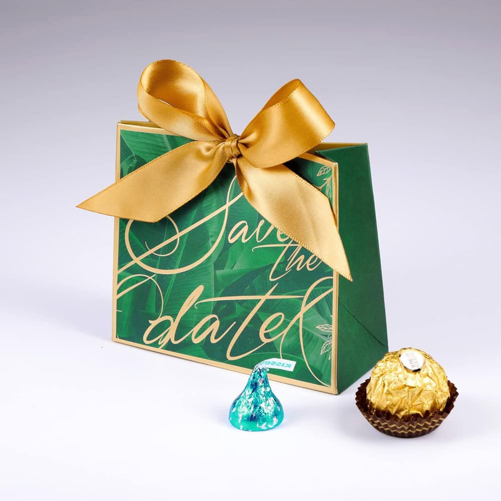 Cutie cu fundă satinată și mesaj Save the date - verde, este modalitatea perfectă pentru a sărbatorii evenimentul special din viața ta sau a prietenilor.