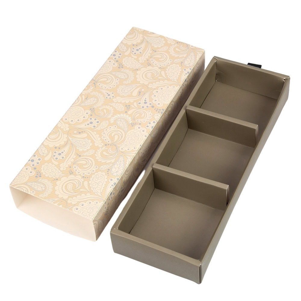 Cutie cu sertar model regal - bej (set 10 buc), ideală pentru depozitarea și prezentarea obiectelor mici sau cadourilor într-un mod elegant și practic. Designul său cu motive clasice, combinat cu un sistem de sertar compartimentat, oferă o soluție de ambalare versatilă și stilată.