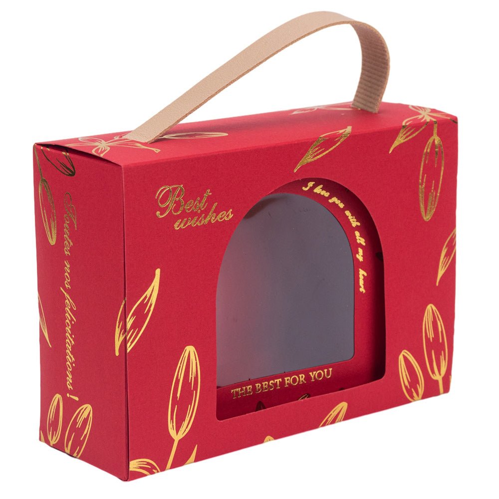 Cutie dreptunghiulară cu ferestră arcadă și mâner din piele - roșu este o soluție elegantă și practică pentru ambalarea unei game variate de produse. Cu designul său rafinat și materialele de înaltă calitate, această cutie adaugă o notă sofisticată oricărui cadou sau produs pe care îl conține.