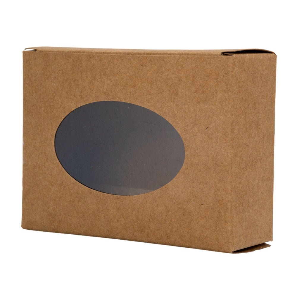 O cutie minimalistă și naturală din hârtie Kraft, cu o textură autentică și o fereastră ovală discretă. Este ambalajul ideal pentru a prezenta cu farmec și delicatețe produse artizanale, bijuterii, mostre sau mici cadouri, punând în valoare conținutul într-un stil eco-chic.
