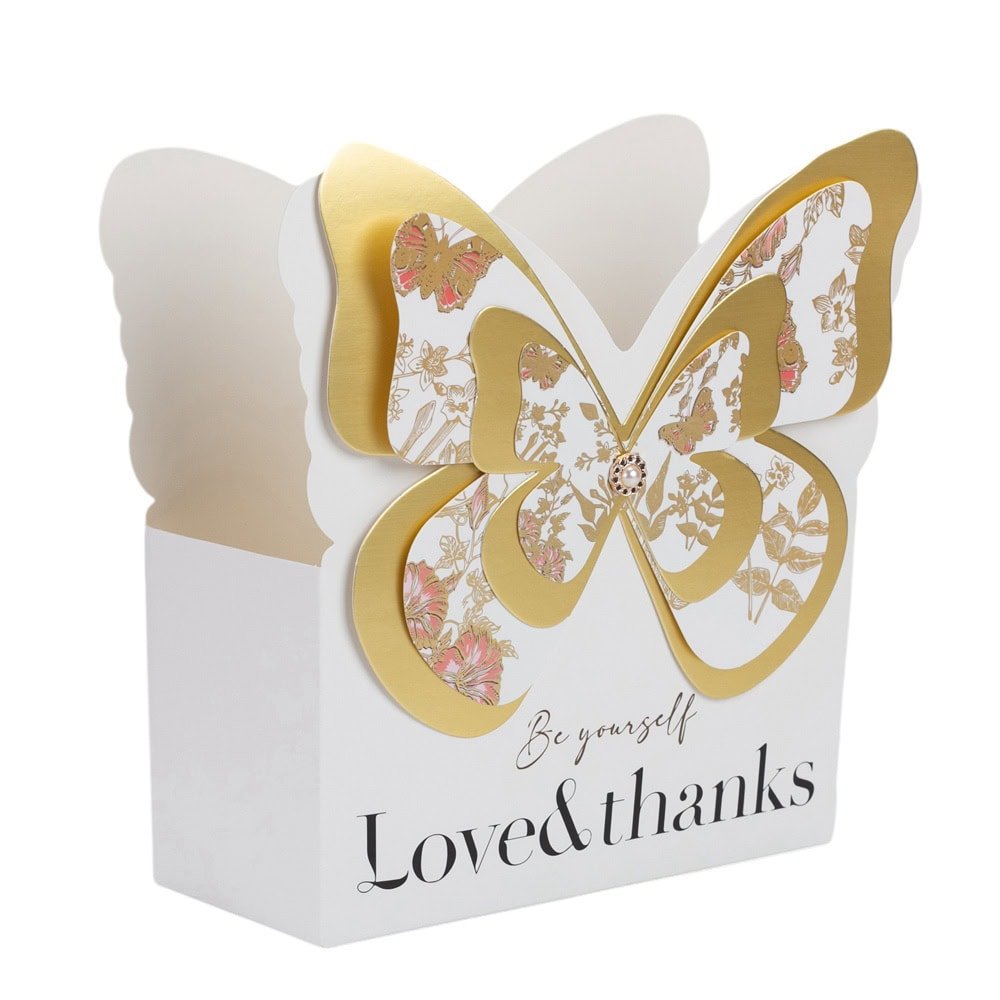 Cutie dreptunghiulară pentru flori model fluture - auriu, este alegerea perfectă pentru a oferi un buchet de flori într-un mod cu totul special. Cu un design sofisticat, îmbinând nuanțe pastelate și detalii aurii, aceasta cutie va adăuga o notă de rafinament oricărui aranjament floral.