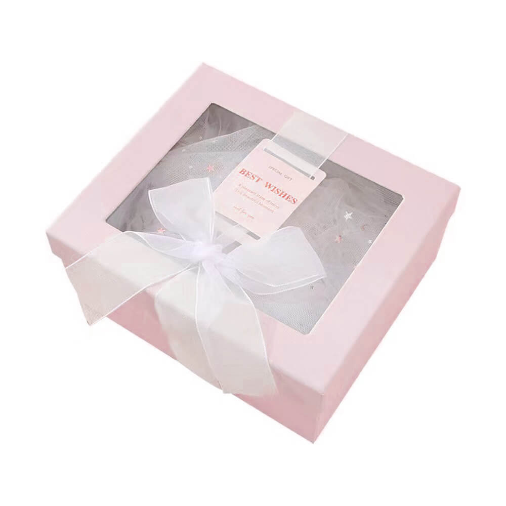 Cutie hârtie cu fereastră si fundă 21x18x9cm - roz este un produs practic și estetic, perfect pentru a ambala și prezenta într-un mod atrăgător mici obiecte sau produse. Cu un design simplu și elegant, această cutie adaugă o notă specială oricărui cadou sau produs ambalat.