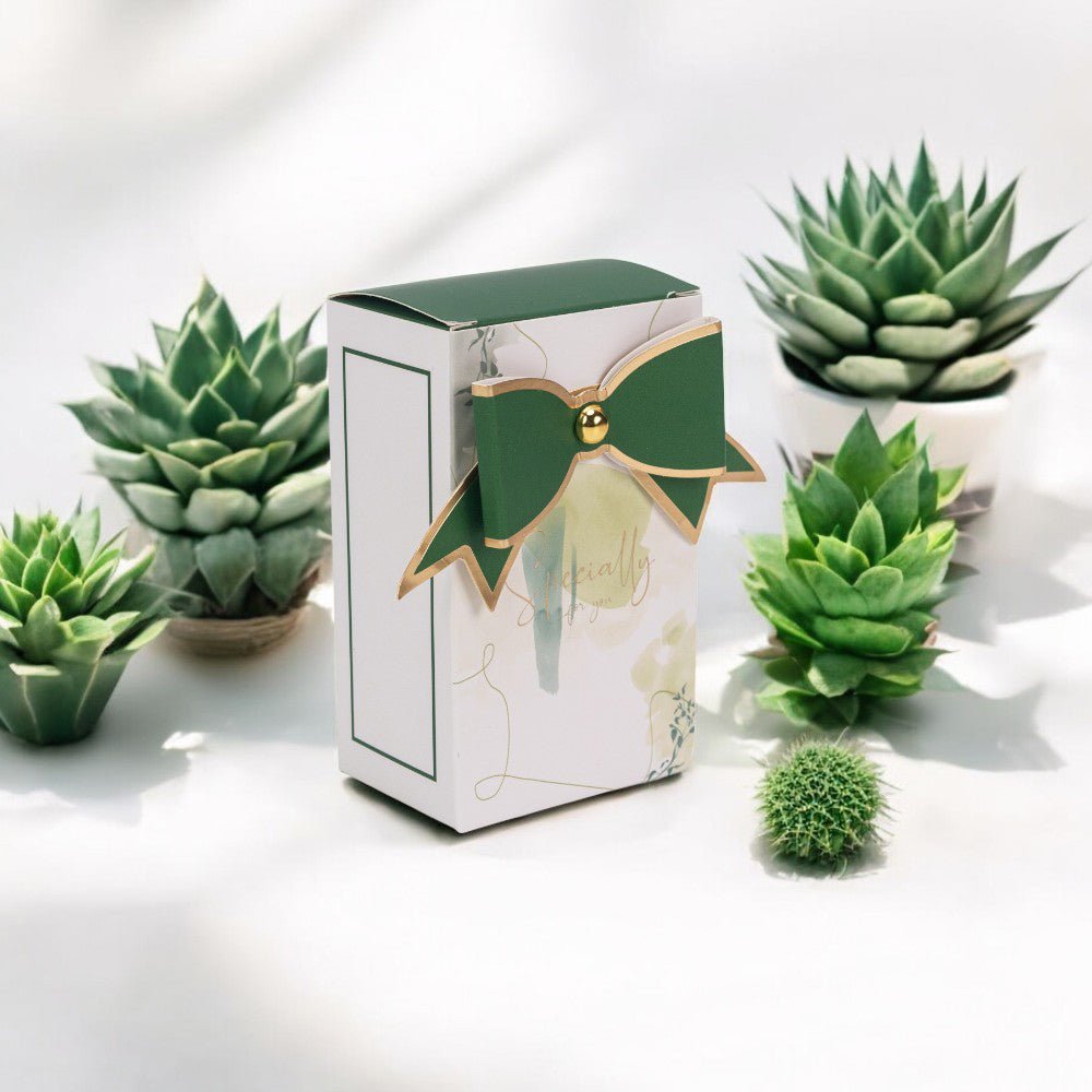 • Funda decorativă: Fundița verde adaugă o notă de rafinament și personalizare, transformând cutia într-un ambalaj deosebit