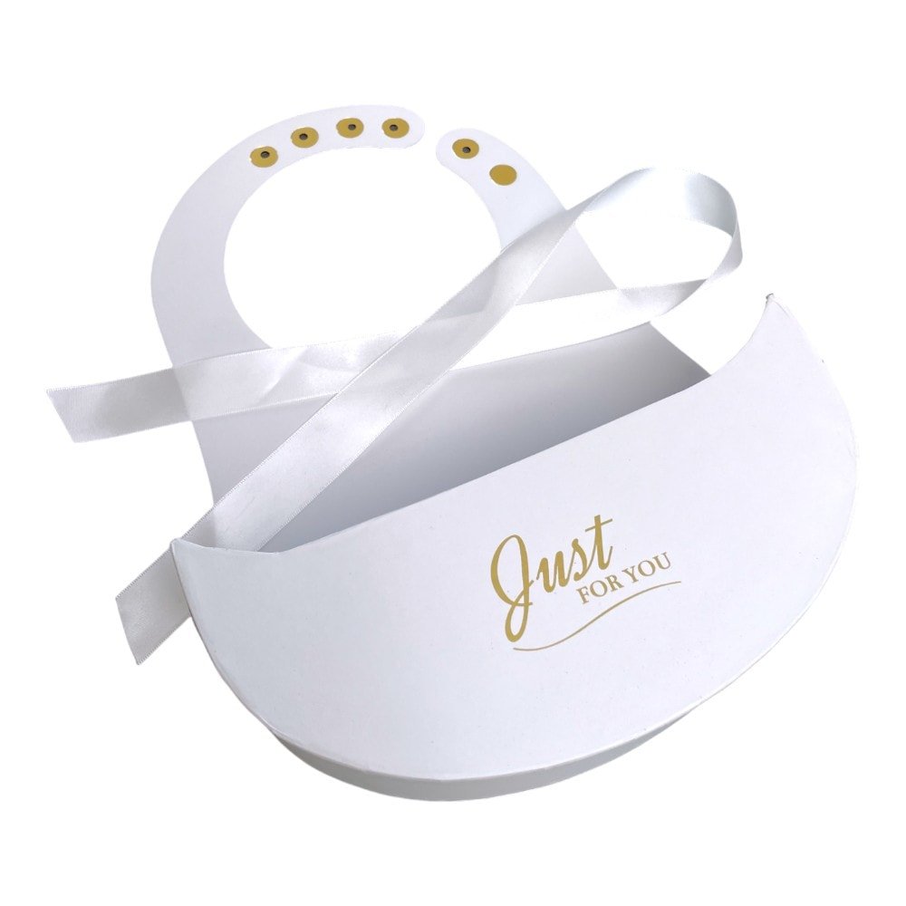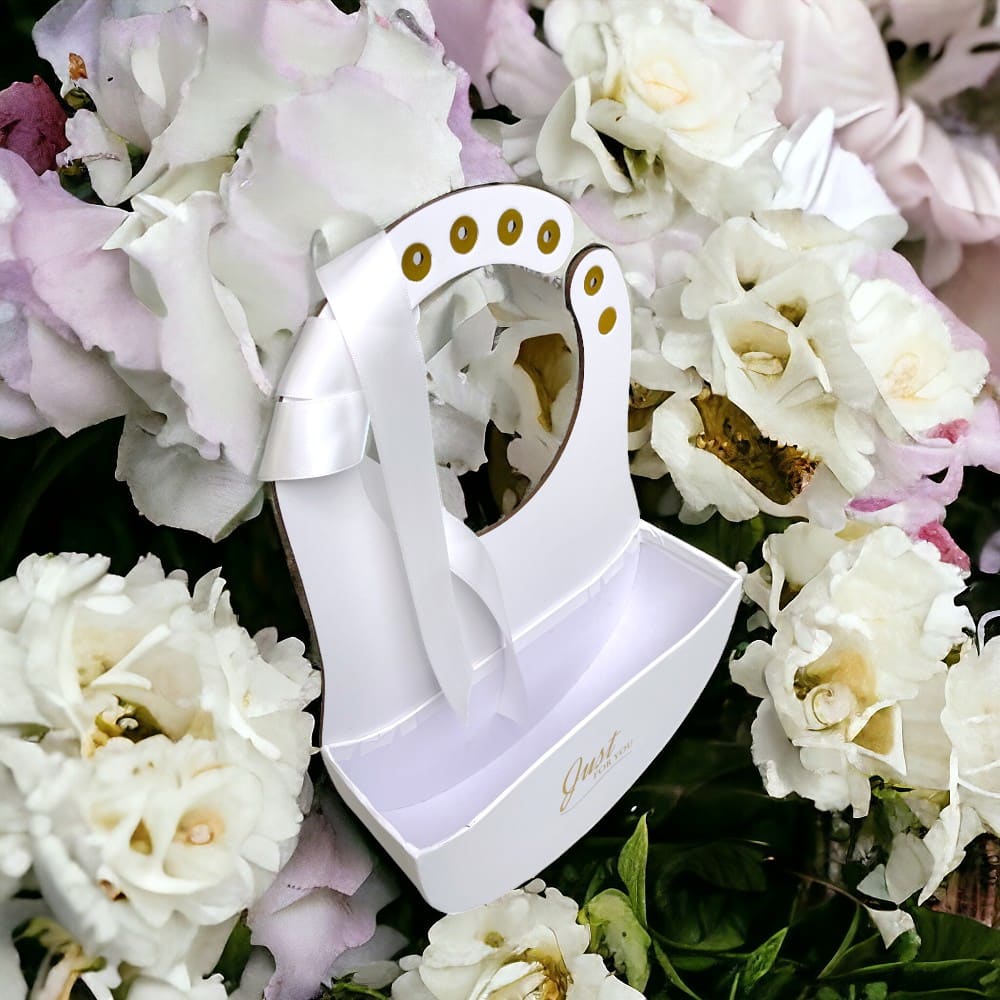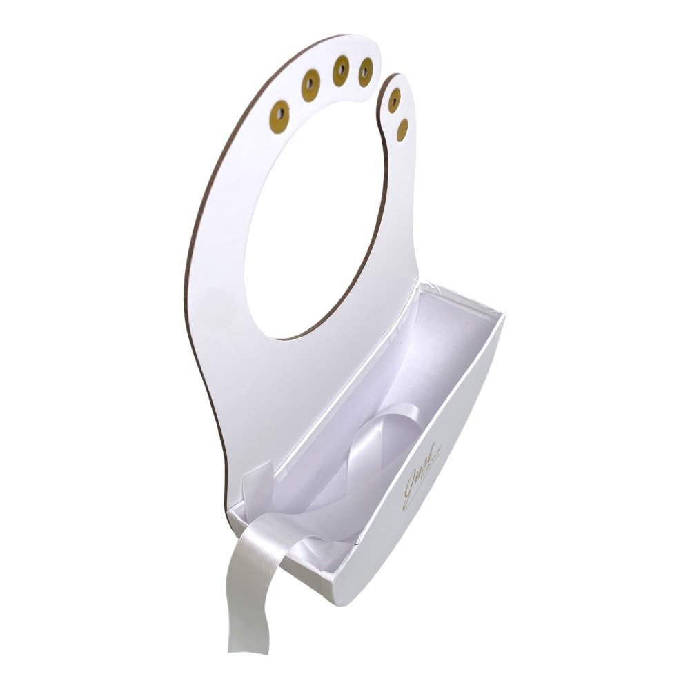 Cutia ovală cu mâner și panglică este un ambalaj elegant și practic, ideal pentru cadouri speciale. Designul său deschis permite expunerea produselor, adăugând un plus de rafinament prezentării.