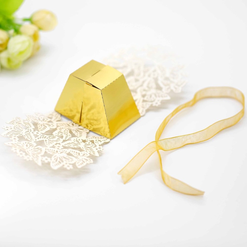 Cutiuță cu fundă model fluturași 6,3x4cm - auriu este un accesoriu elegant și practic, potrivit pentru diferite evenimente și utilizări.