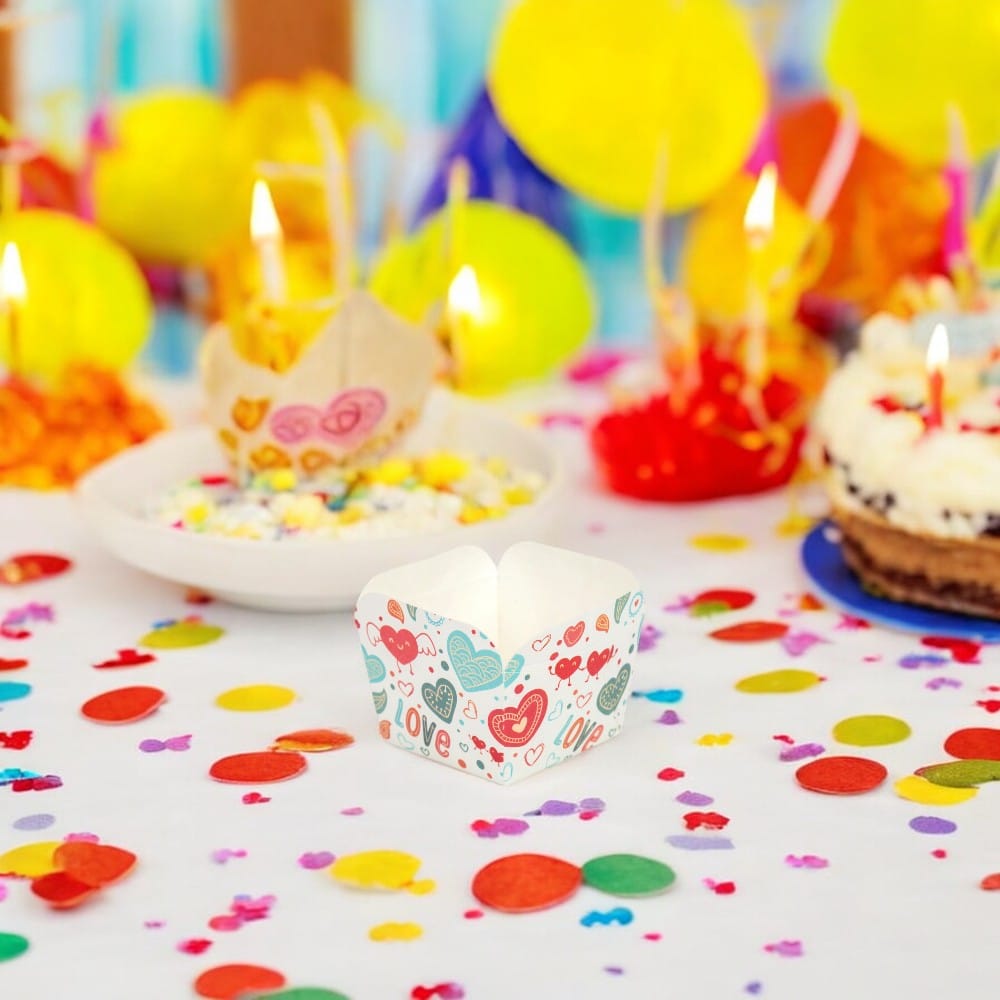 Cutie mică pătrată deschisă cu design - model 1 love, o soluție practică și atractivă pentru ambalarea deserturilor, gustărilor sau cadourilor mici. Fiecare cutie are un design vesel și colorat, adăugând un plus de stil evenimentelor speciale. Aceste cutii sunt perfecte pentru petreceri, aniversări sau diverse ocazii, fiind ușor de asamblat și utilizat.