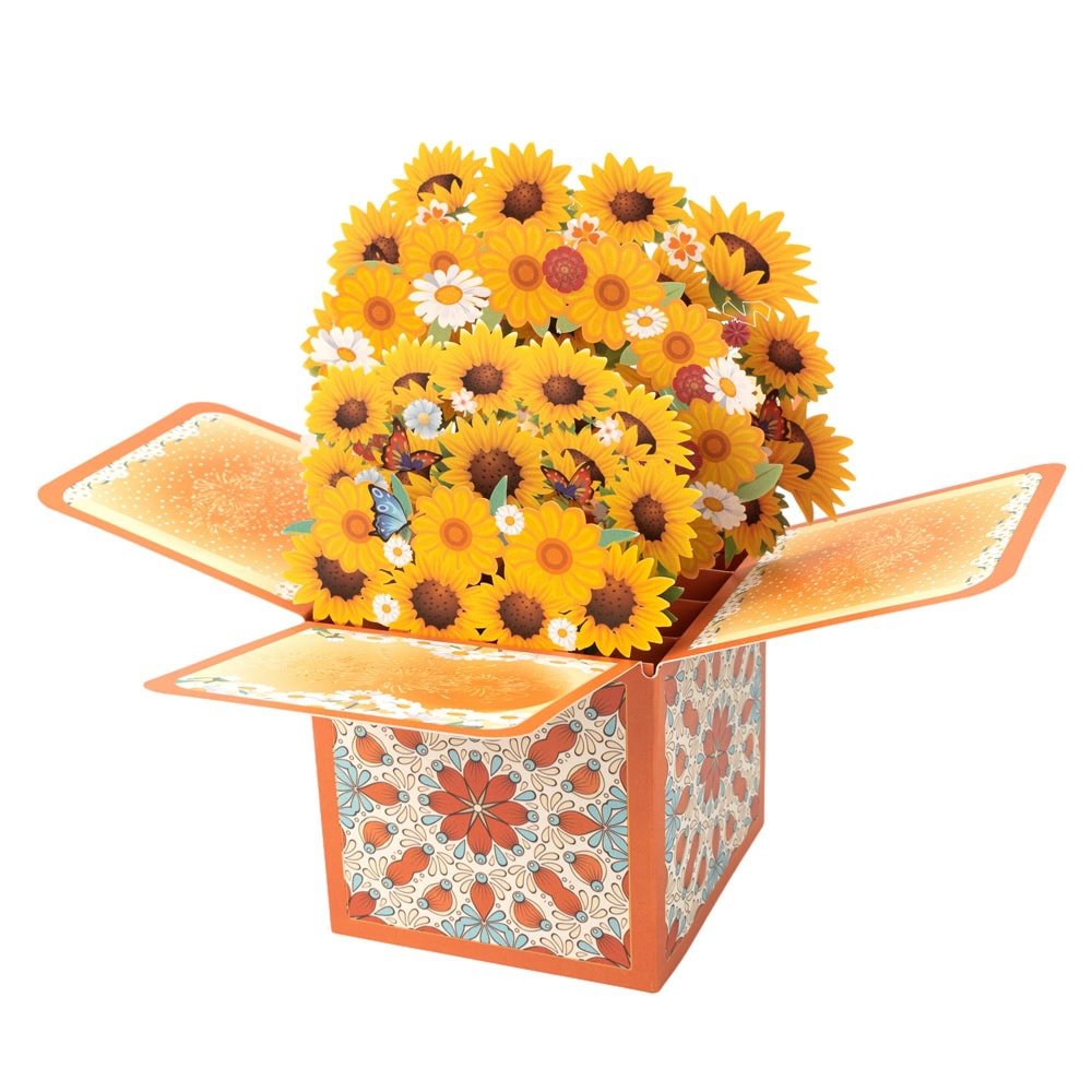 Felicitare explozivă 3D - model 5, o felicitare interactivă și spectaculoasă, care se deschide pentru a dezvălui un buchet colorat de flori tridimensionale. Designul combină elemente florale cu fluturi și detalii decorative, totul într-o prezentare care surprinde și încântă prin efectul său pop-up.